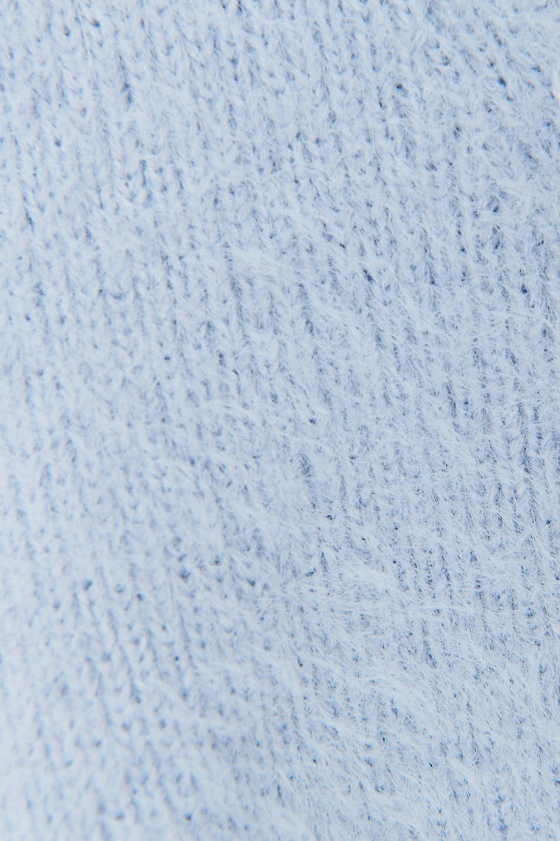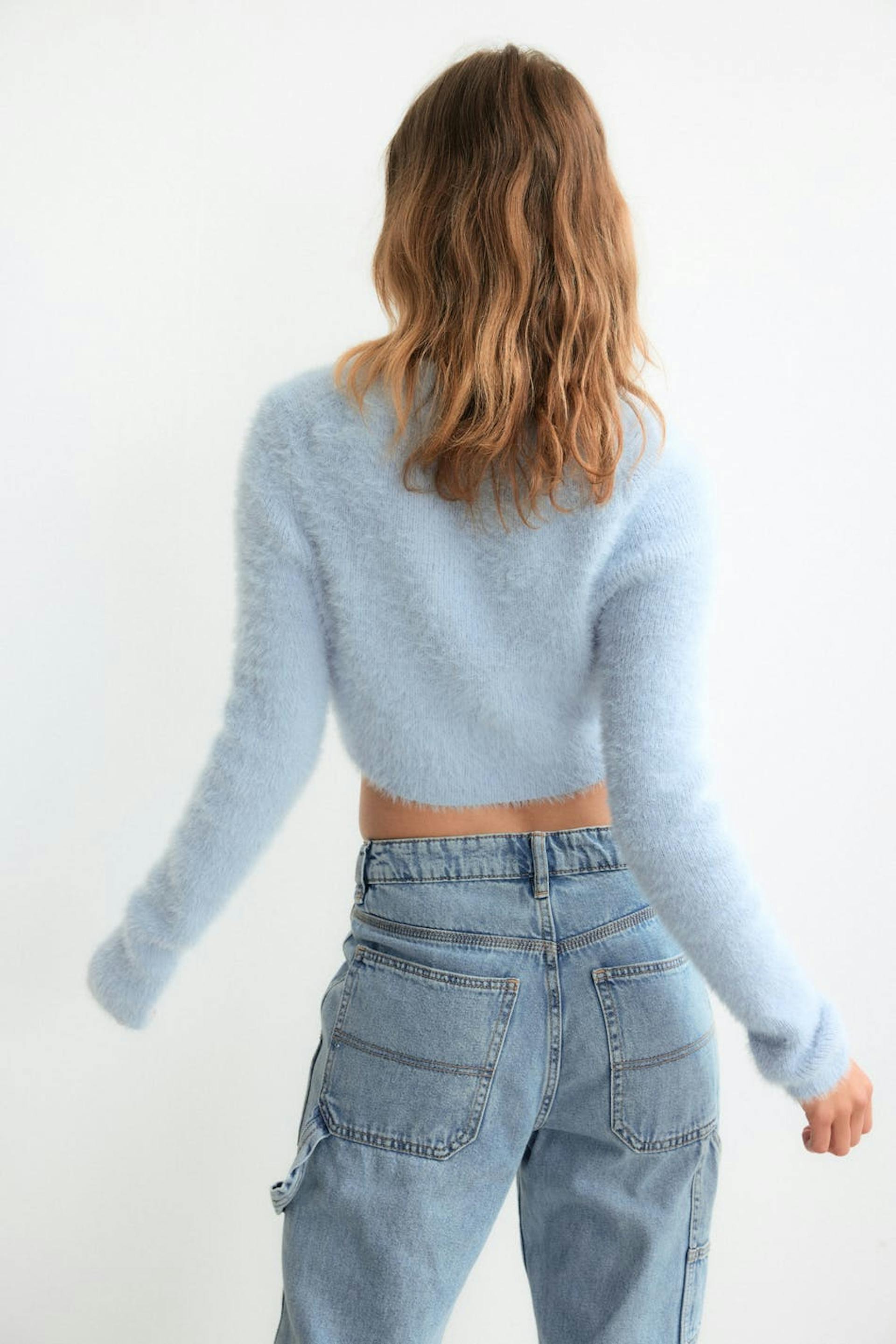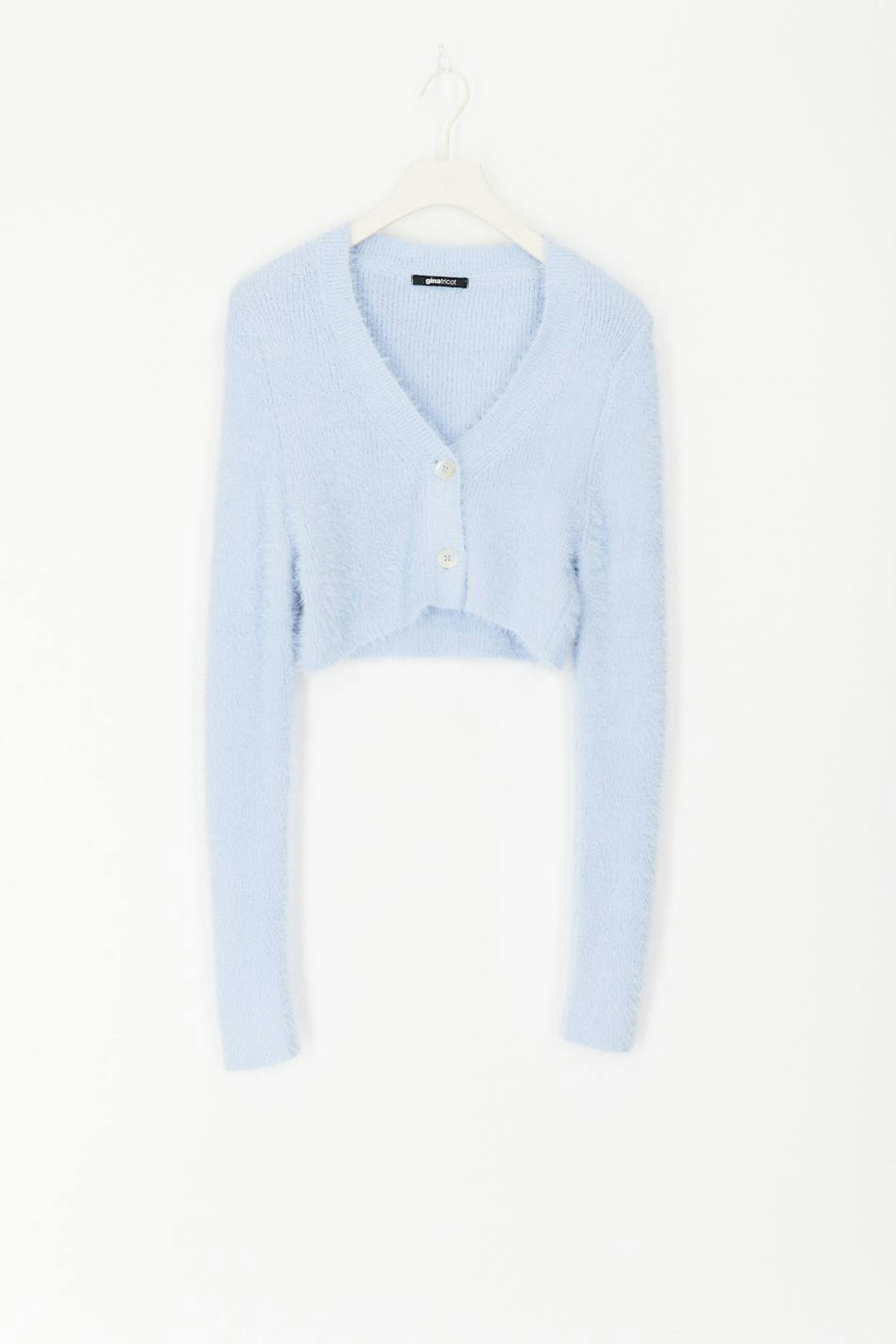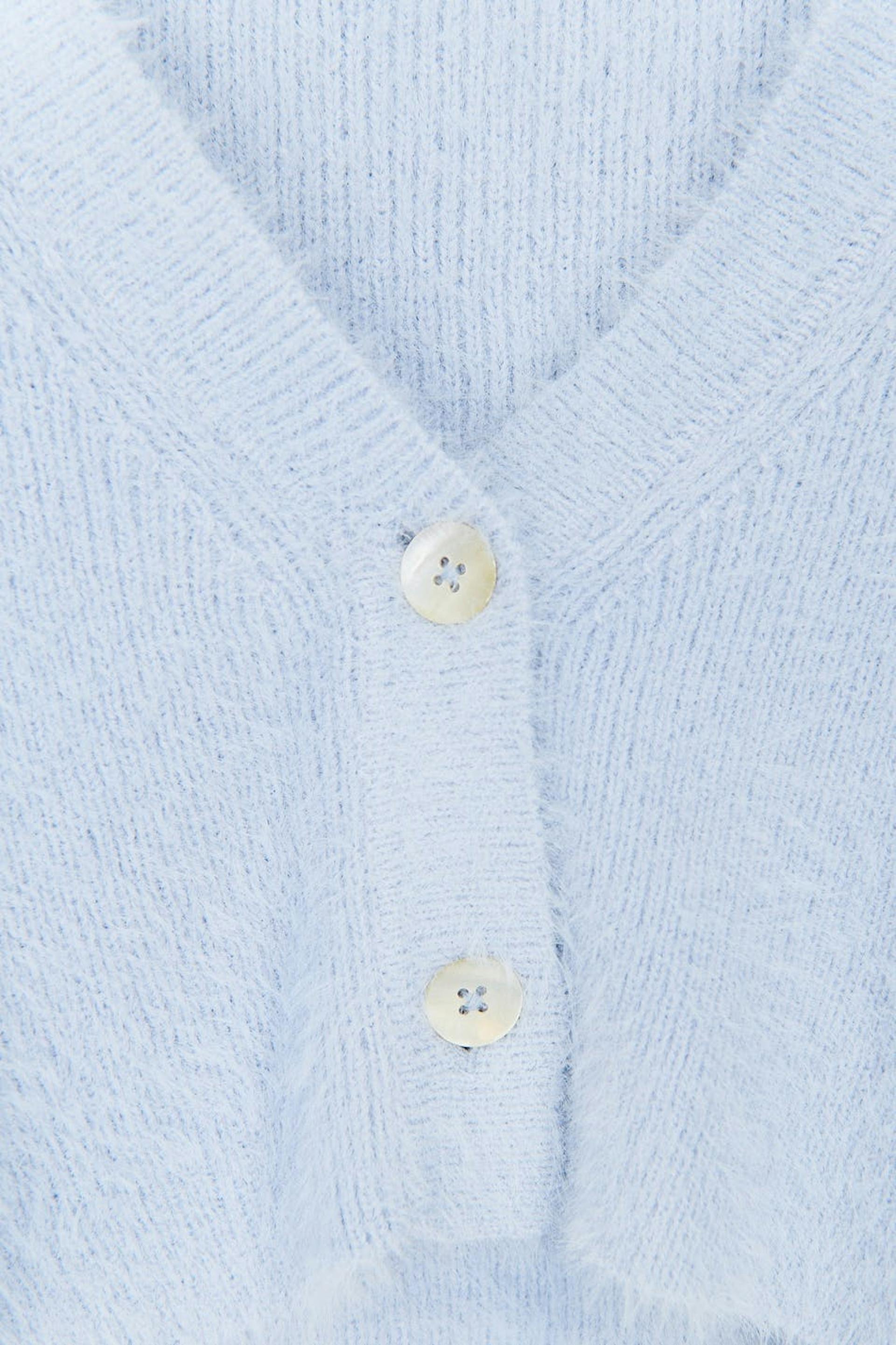 Short cardigan with soft, fluffy quality. The cardigan is blue, long-sleeved and knitted. It has V-neck and button placket in front.
