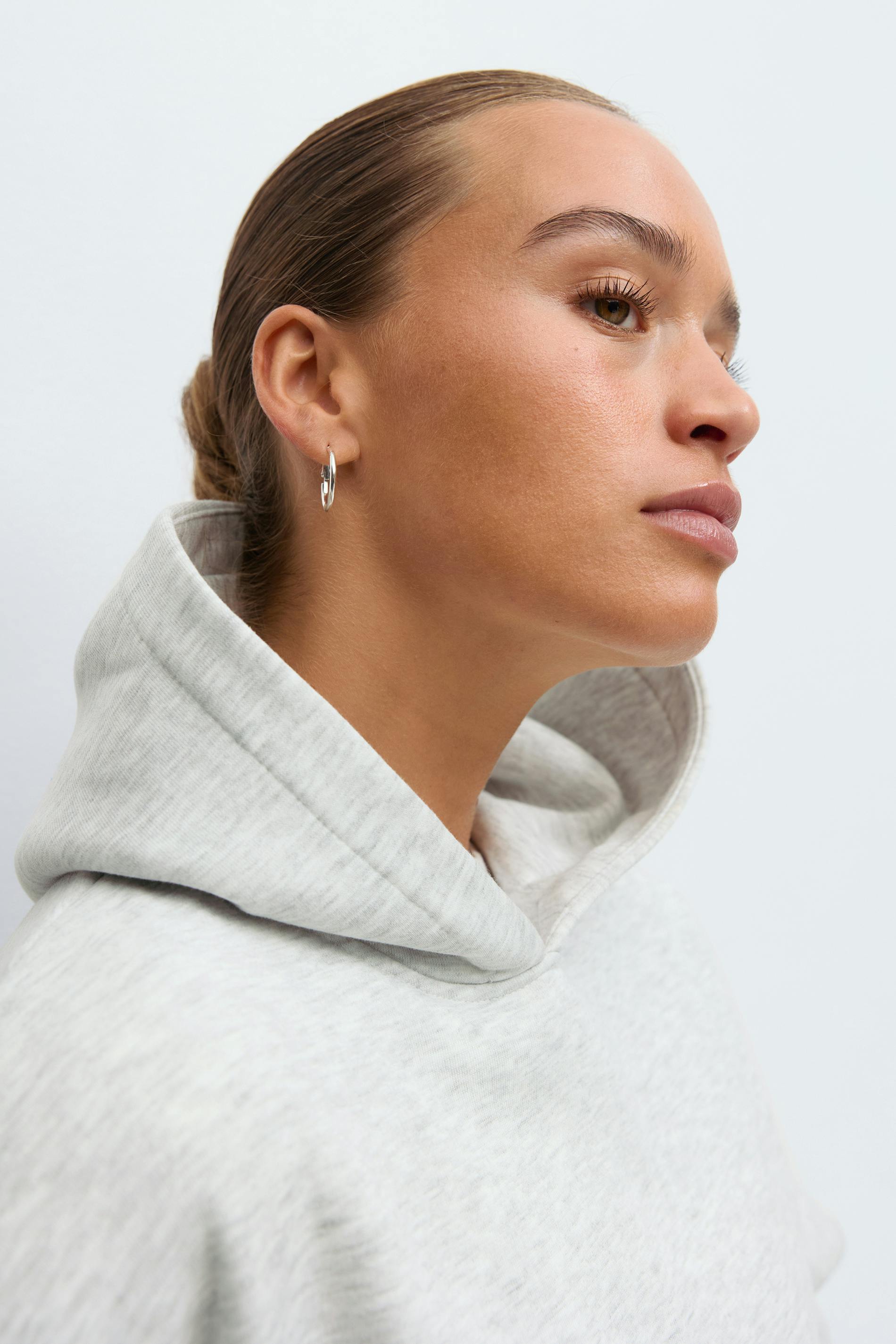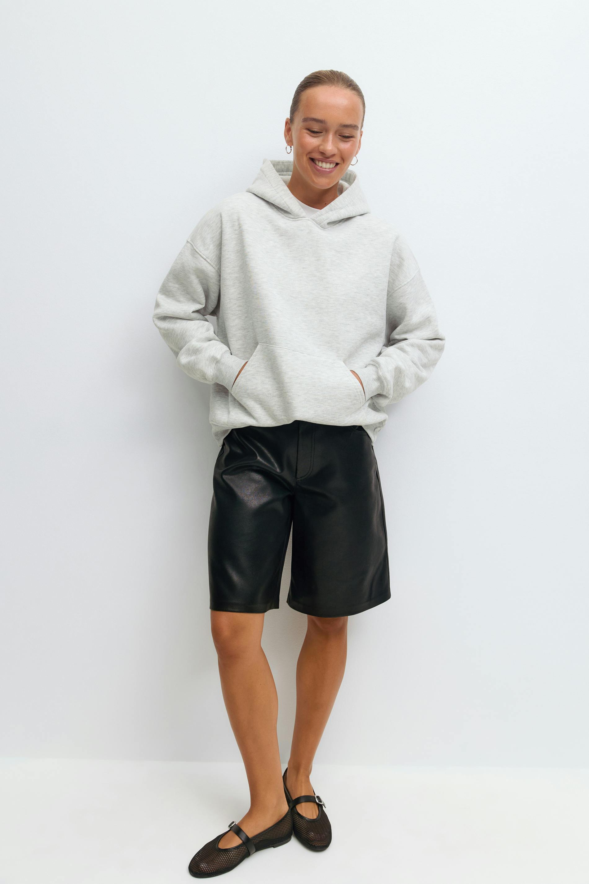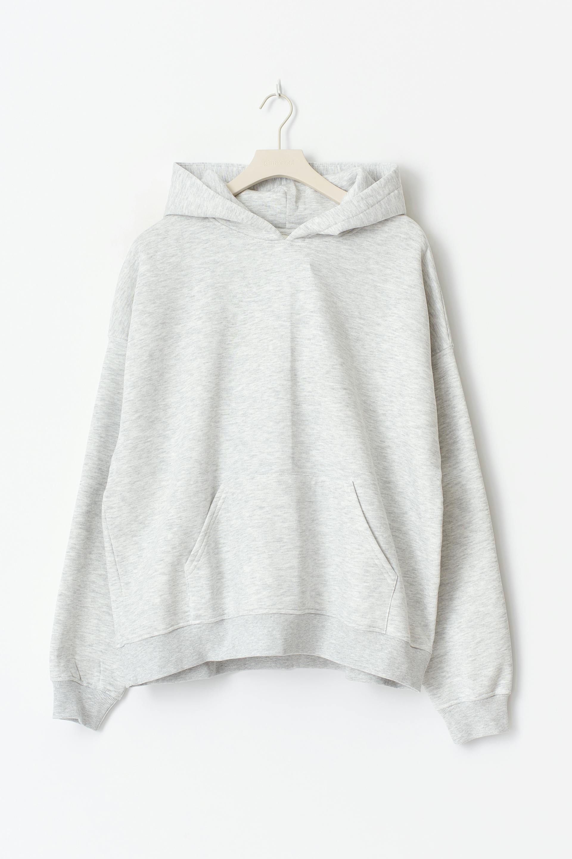 Oversized hoodie with print at the back. The hoodie is grey and has lined hood. It has round neckline, long sleeve, kangaroo pocket at the front and ribbing at sleeve ends and at the bottom. Print: I think I like this little life. Lined.