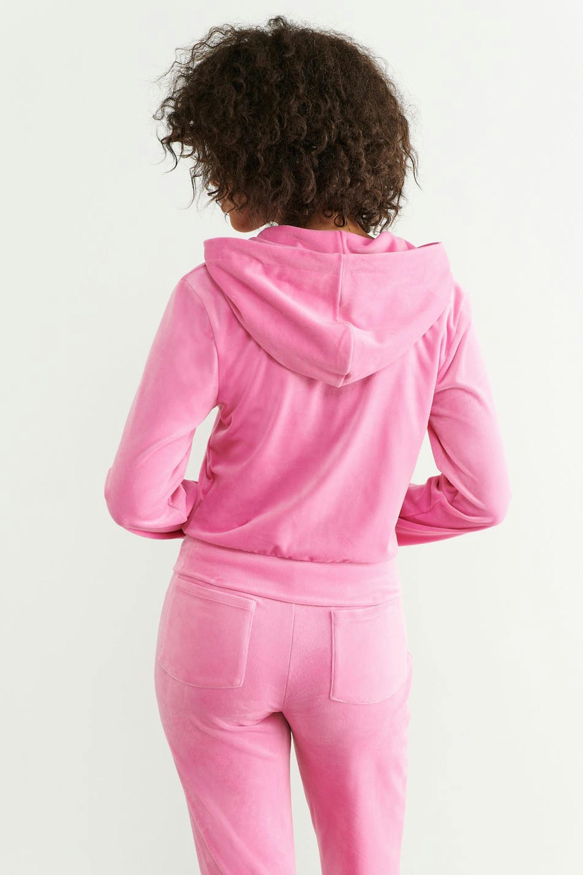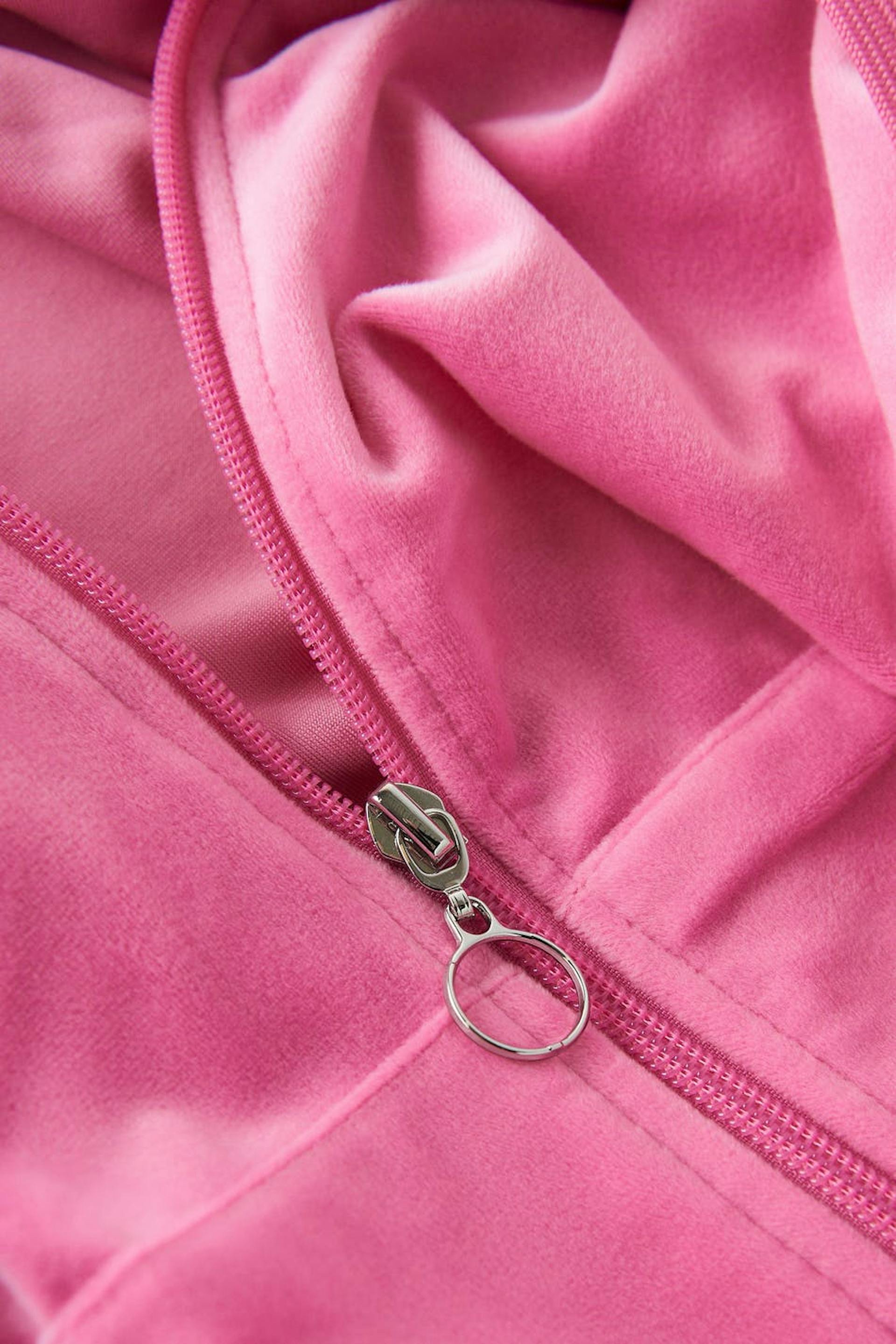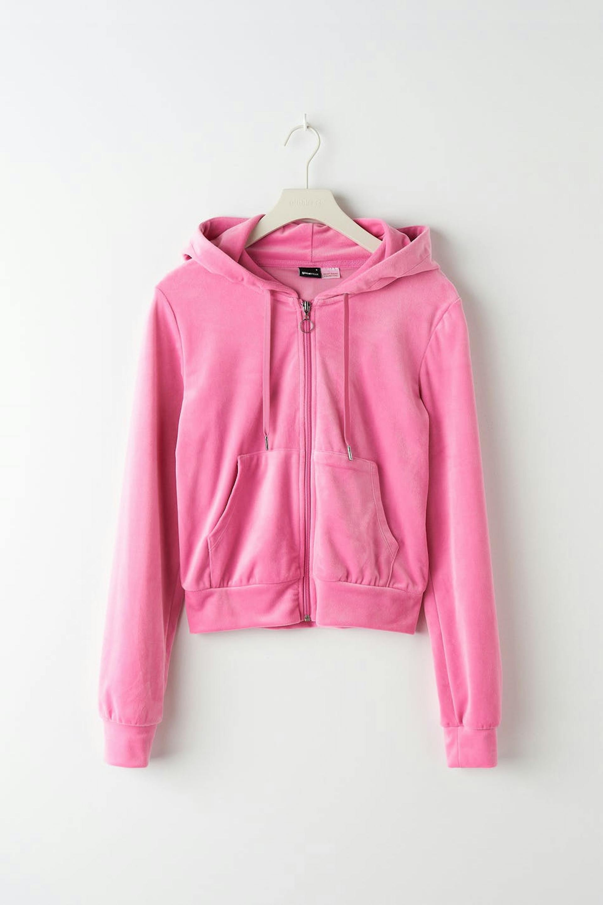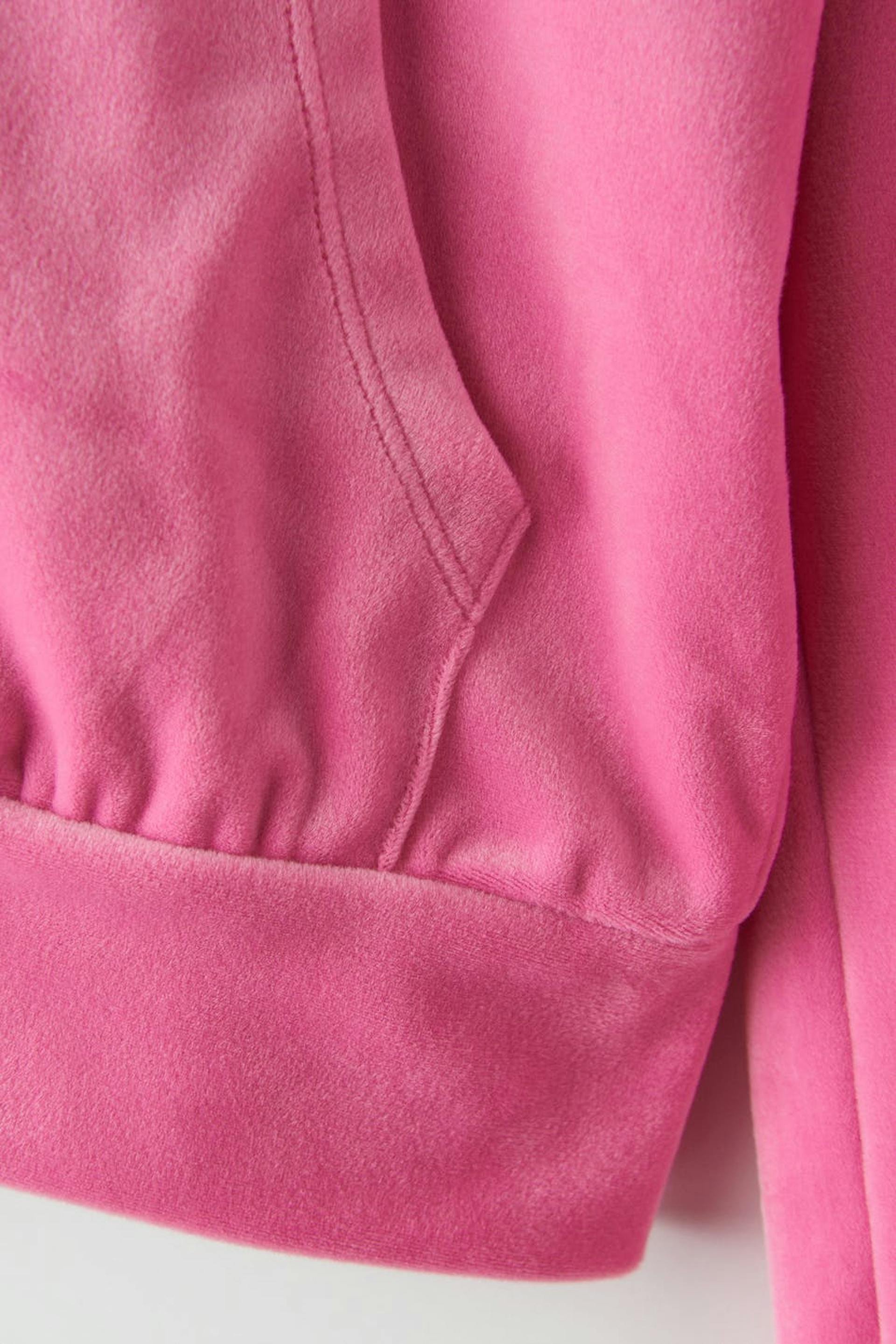 Soft hoodie in velour with lined hood. The hoodie is pink and has pockets on the sides. It has zip closure with metal ring and drawstrings at the hood.