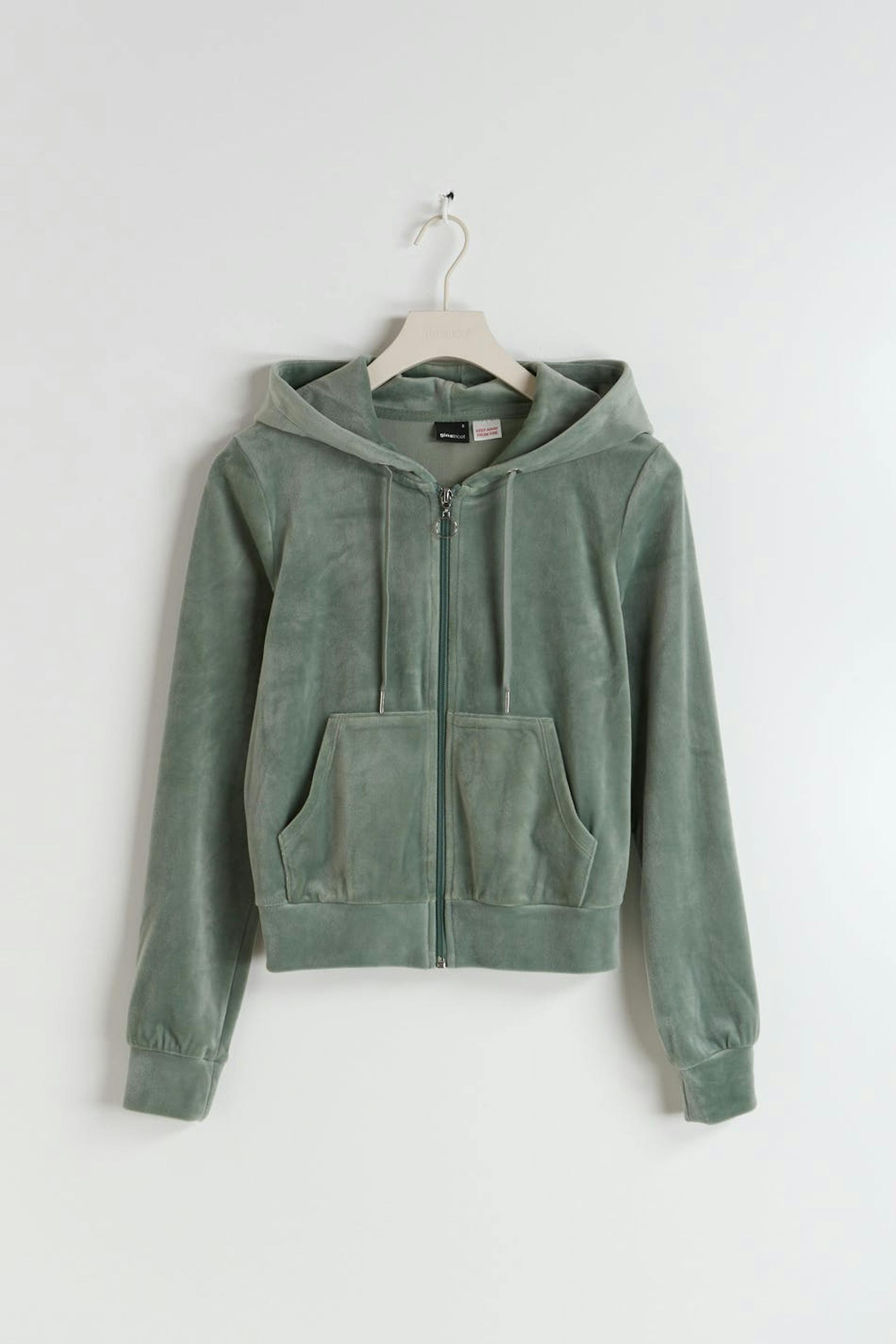 Hoodie in velour with regular fit. The hoodie is green and has zip closure at the front. It has pockets at the front and lined hood with drawstring.