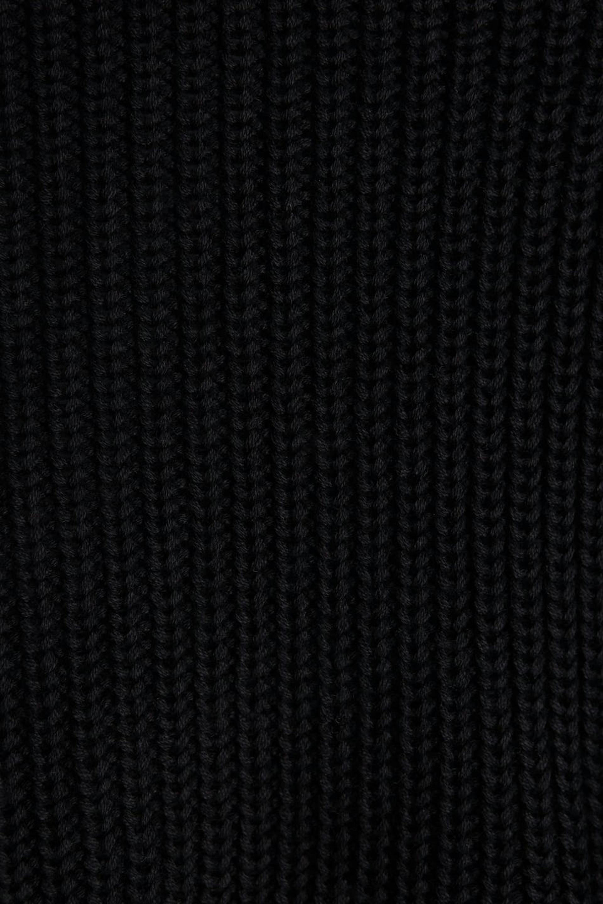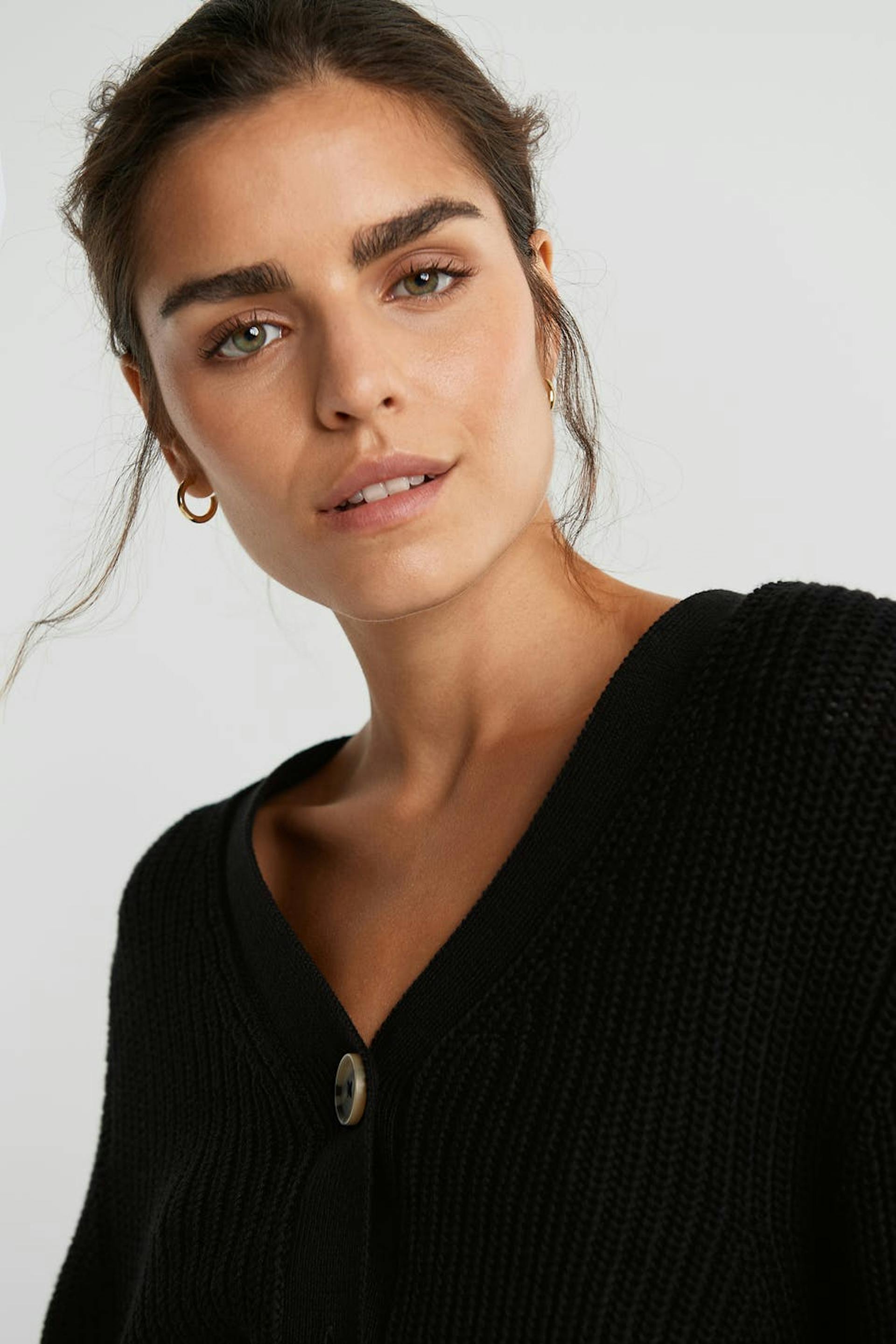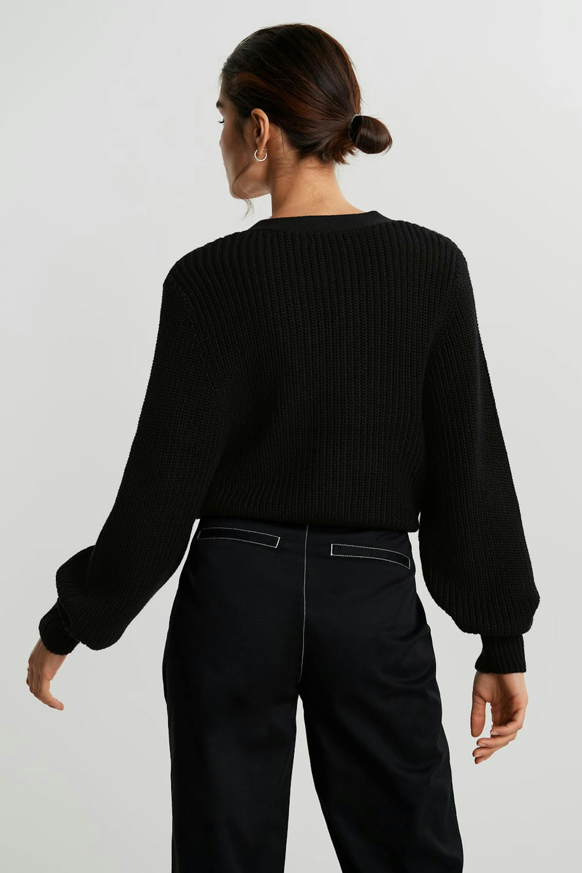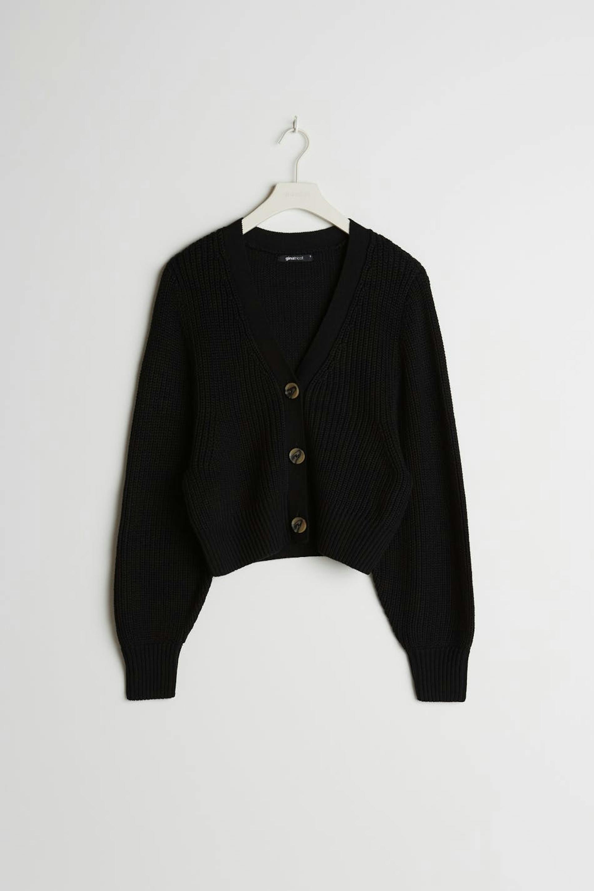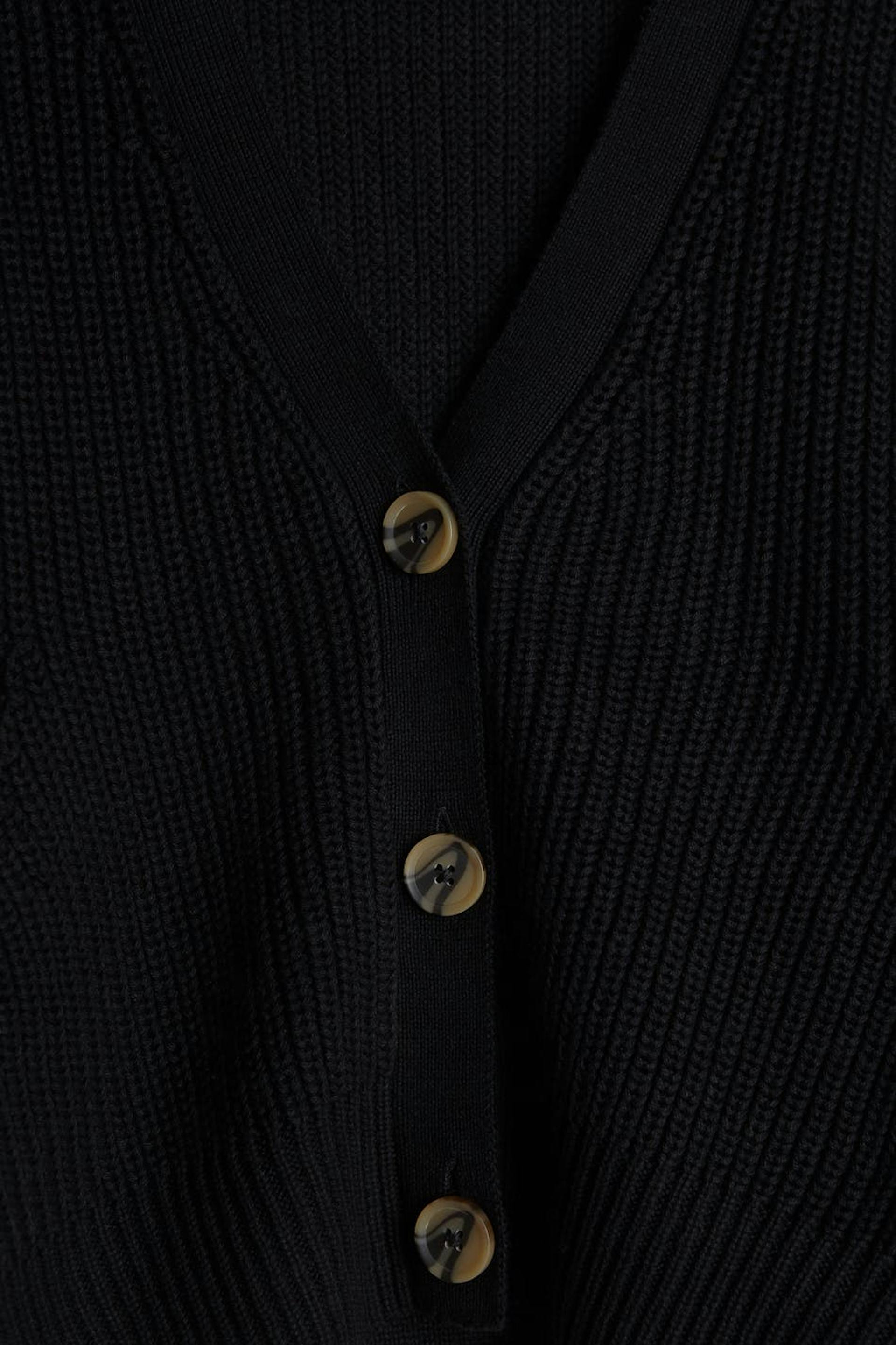 Knitted cardigan with a long rib knit on the sleeves. The cardigan is black and has a V-neck.