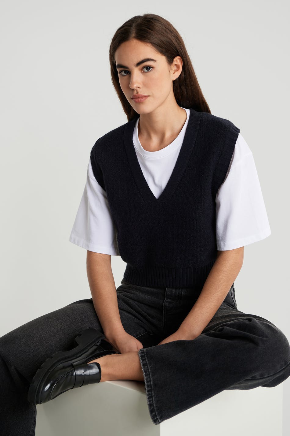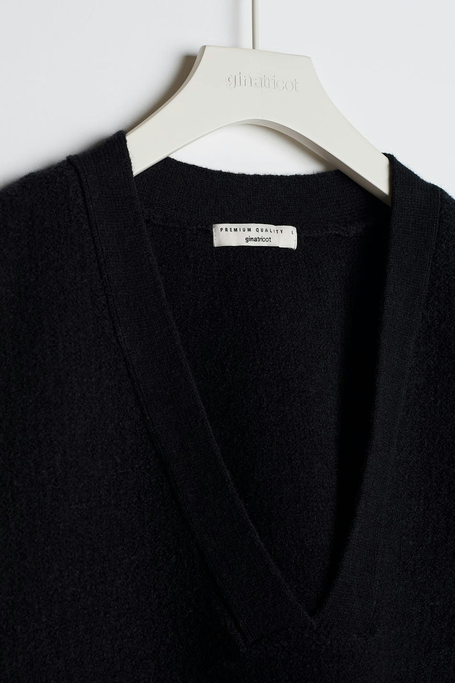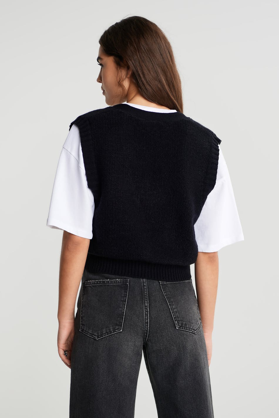 Knitted gilet with a spacious fit. The waistcoat is black and knitted and has a V-neck.