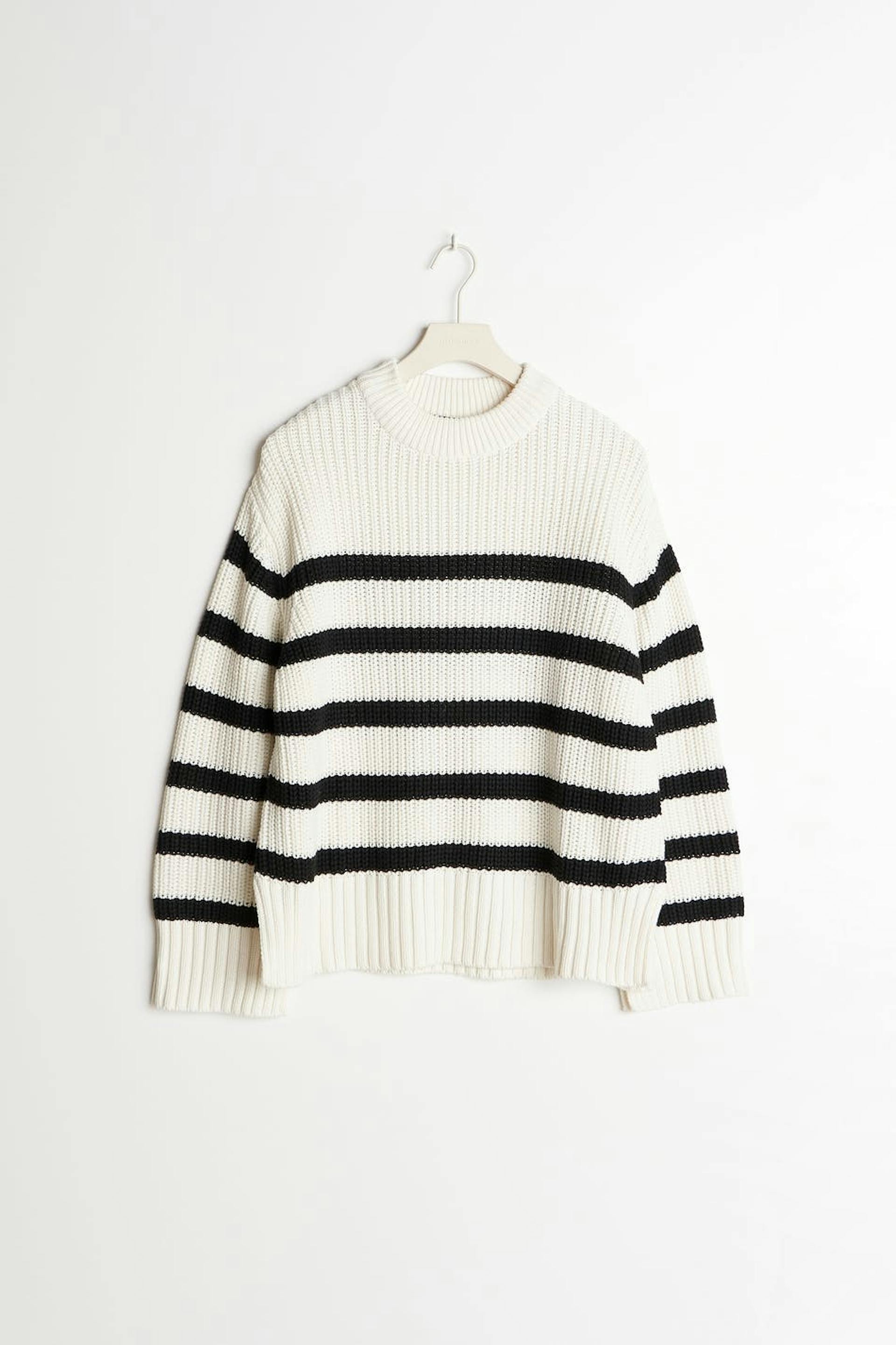 Knitted jumper with slit on the sides. The jumper is white and has a high neckline. It has a ribbed hem and a loose, oversize fit.