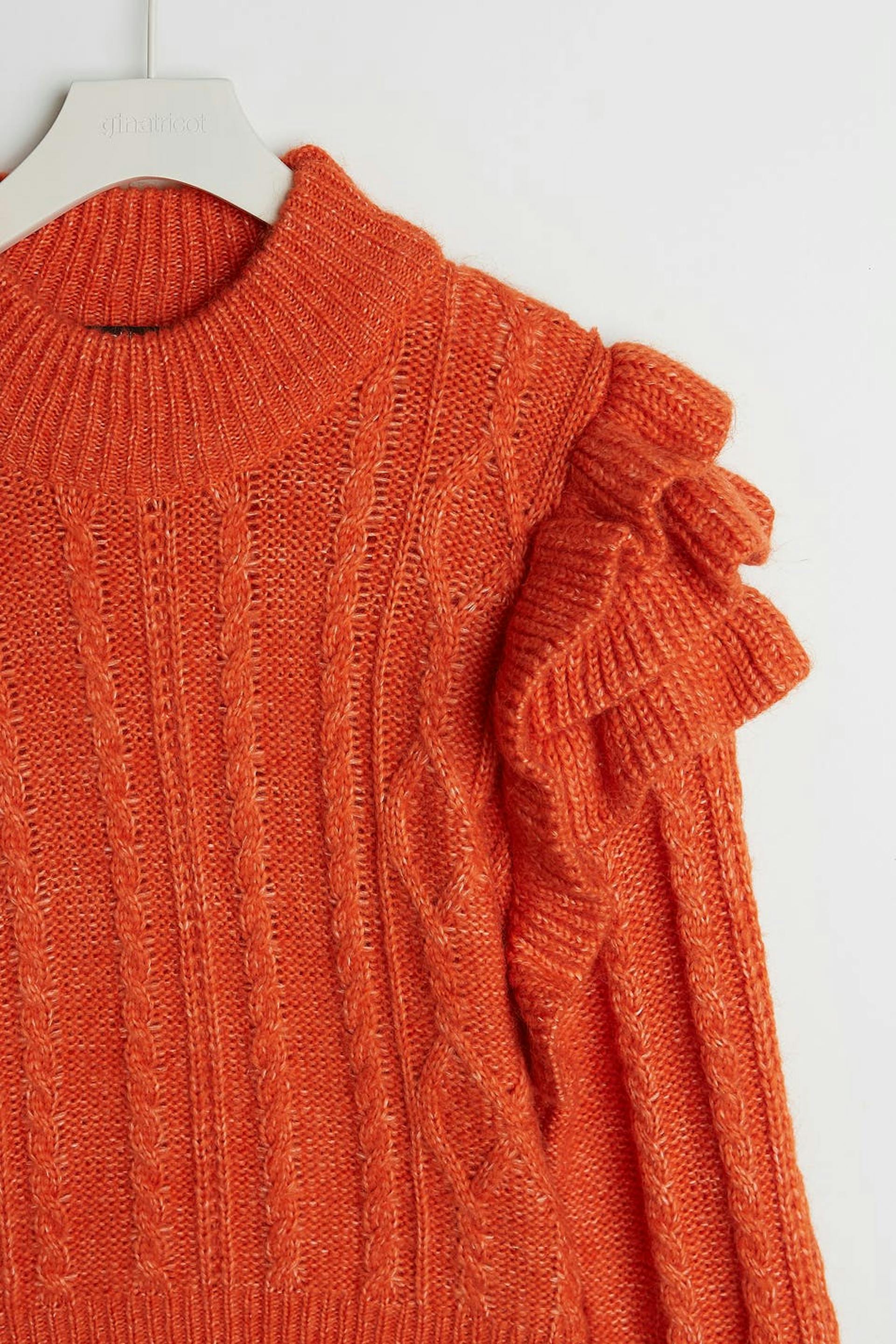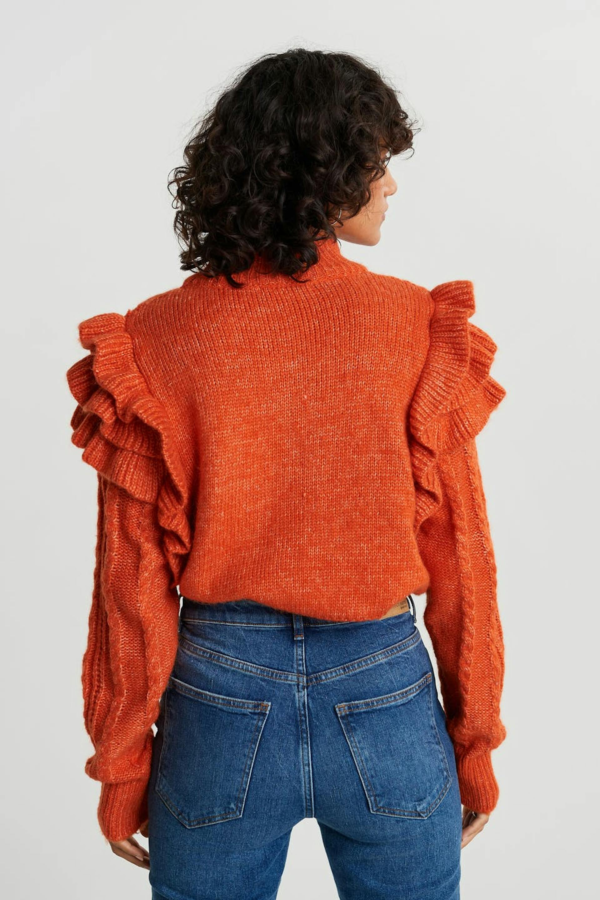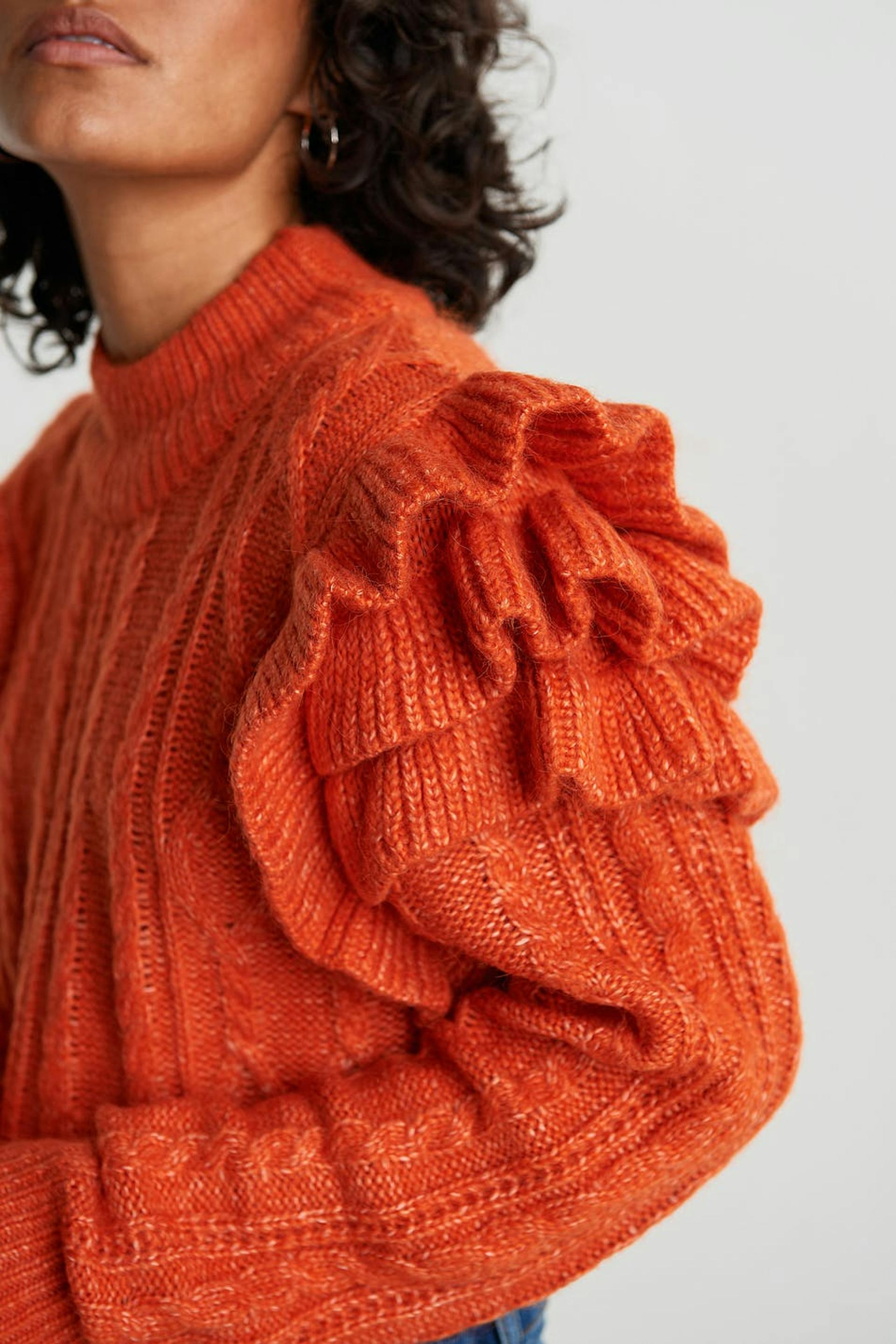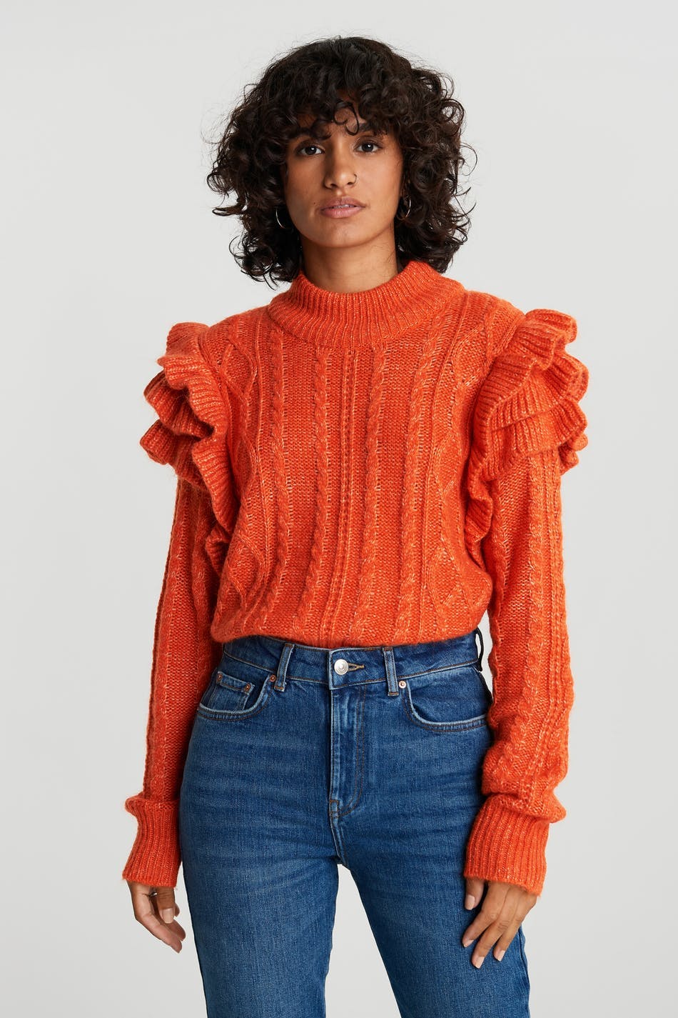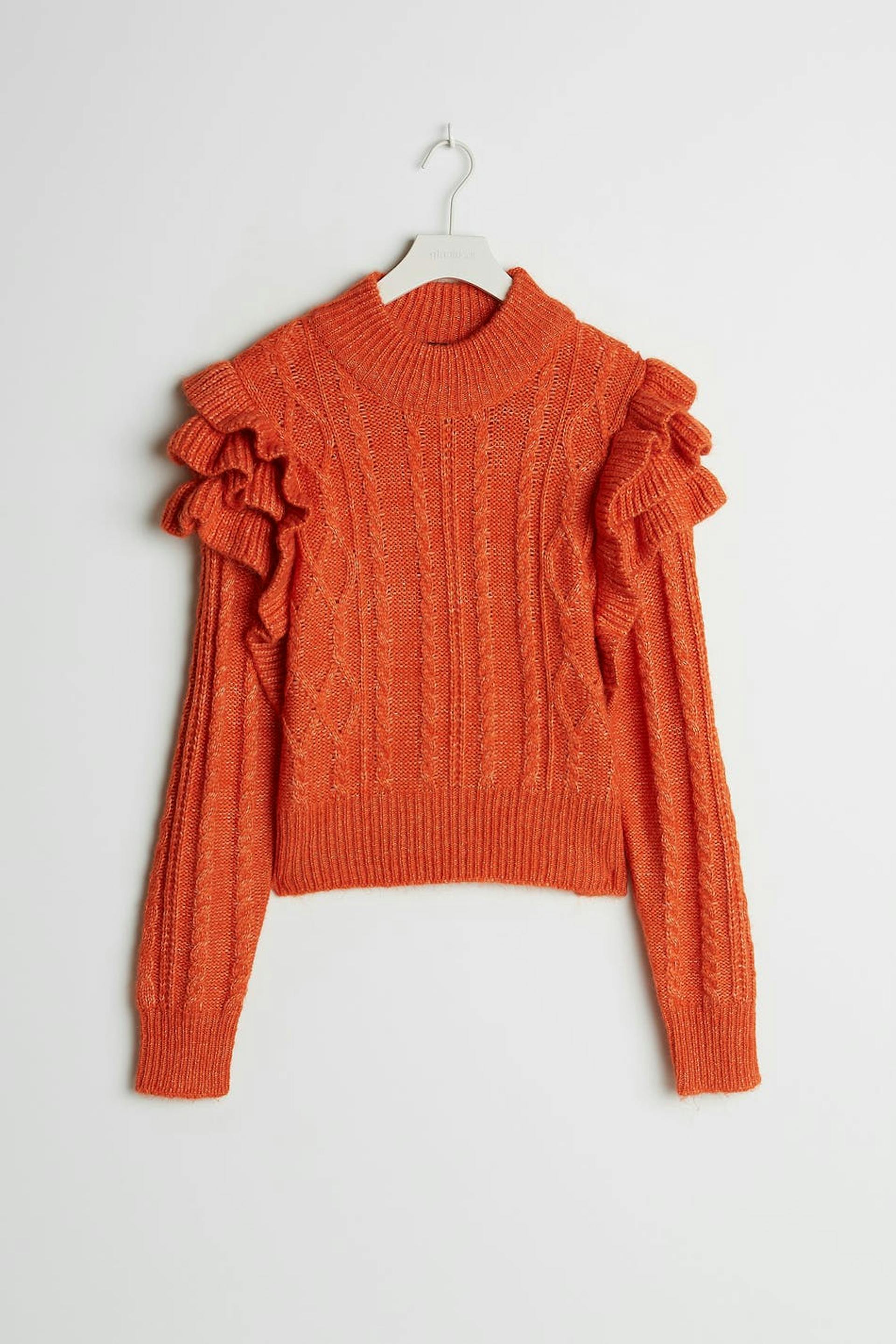 Knitted jumper with frills at the shoulders. The jumper is orange and knitted and has cable knit details.