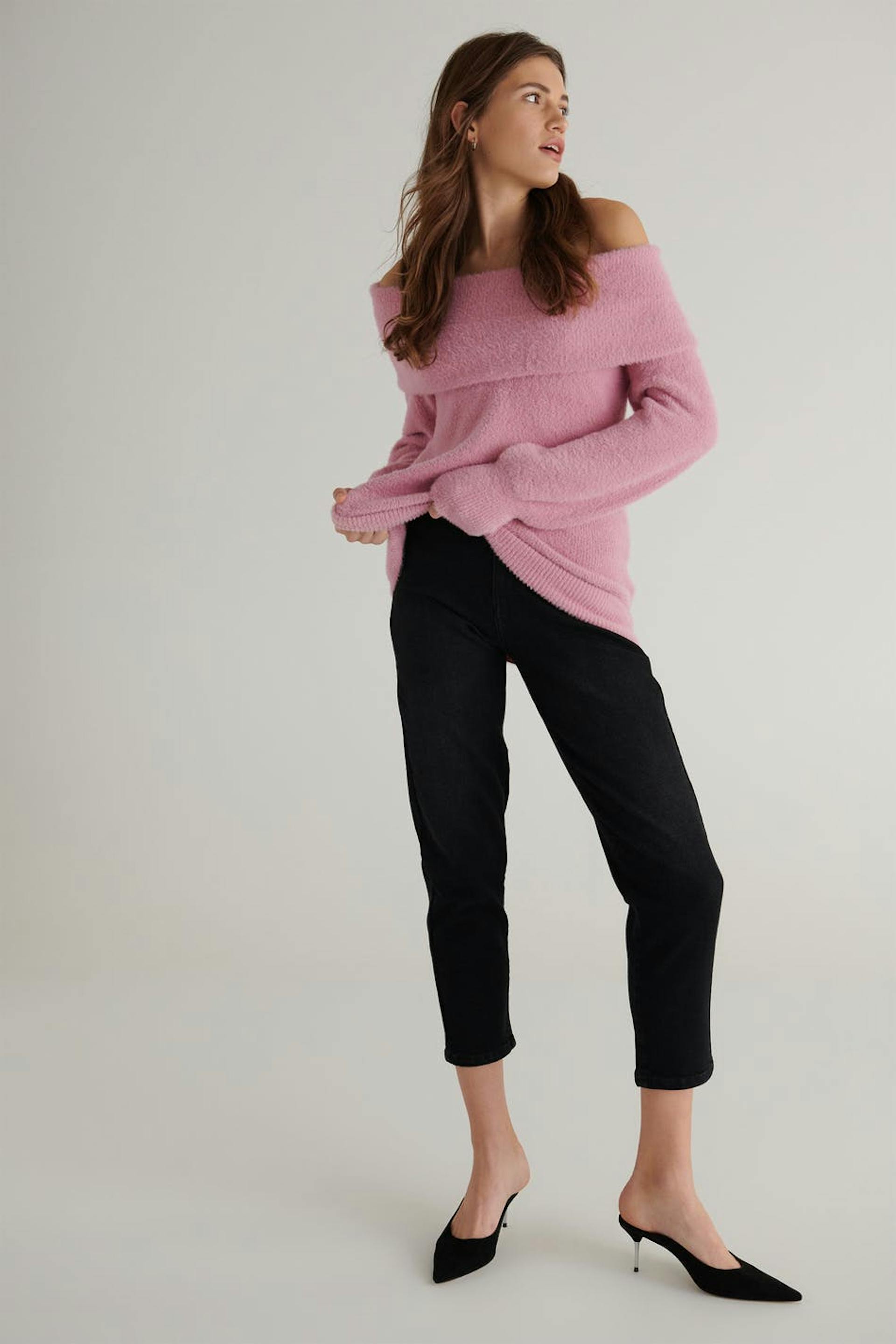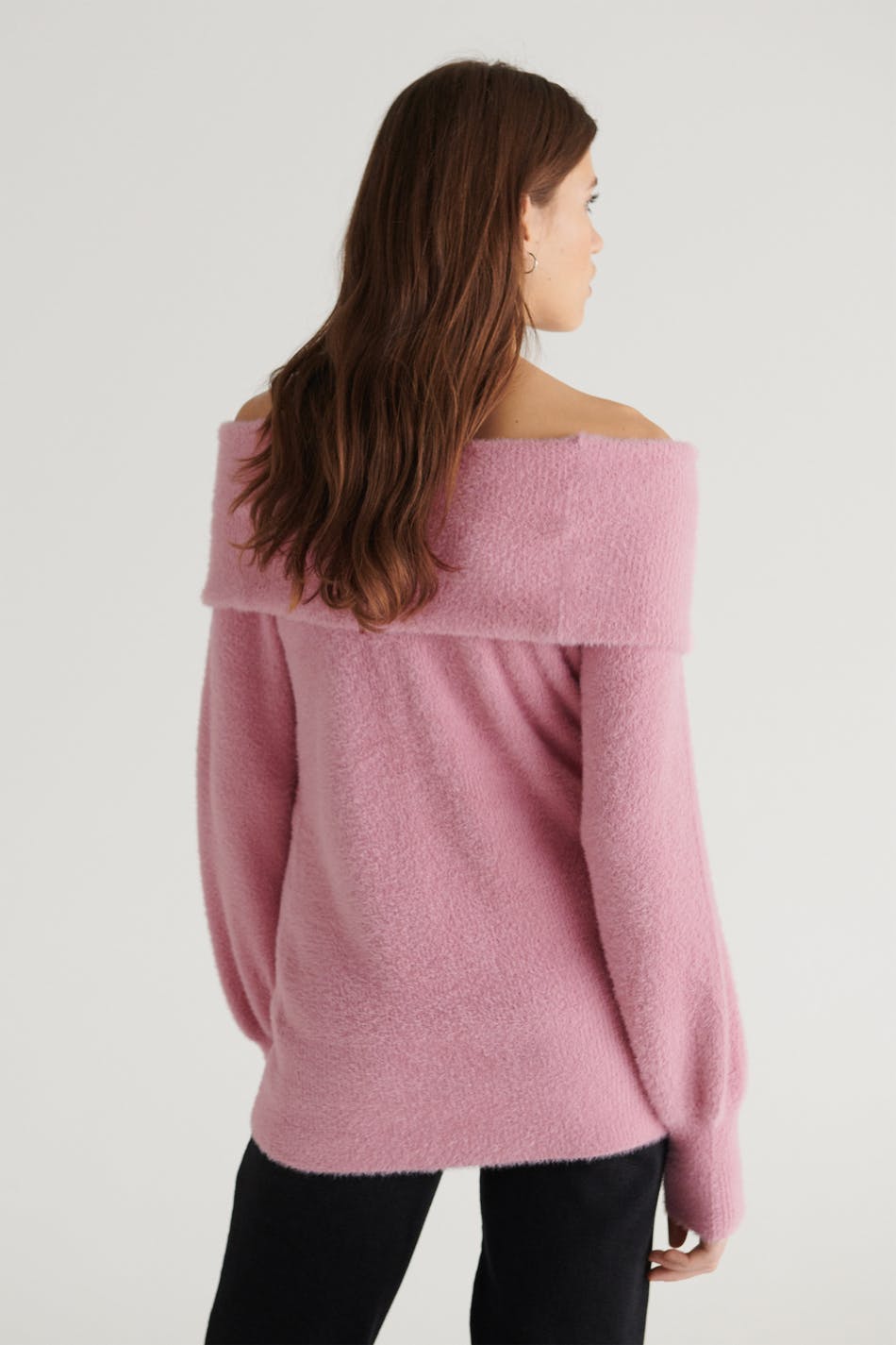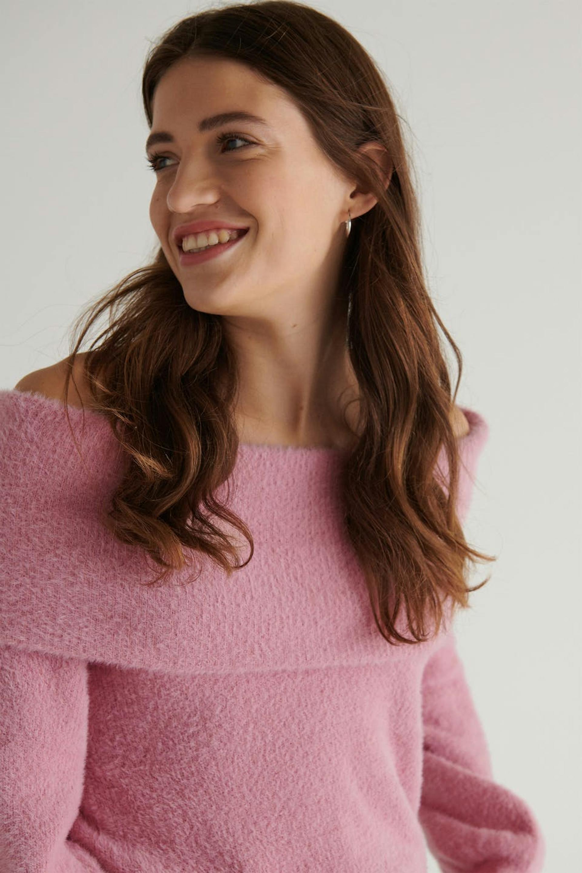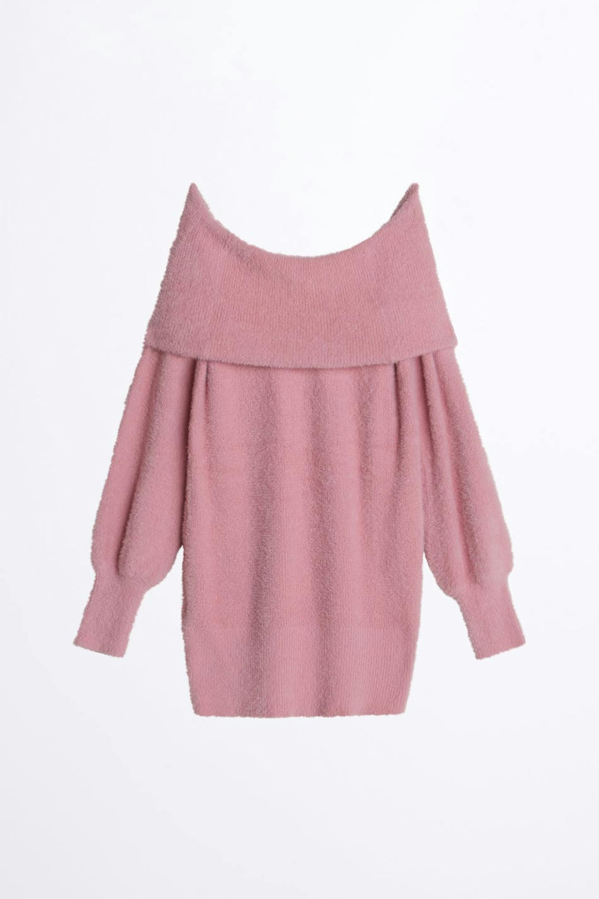 Knitted jumper with a turn-down edge at the top. The jumper is pink, knitted and long-sleeved.