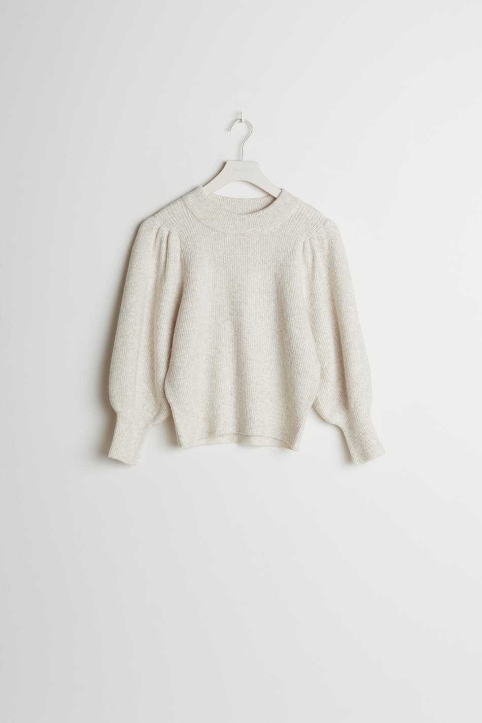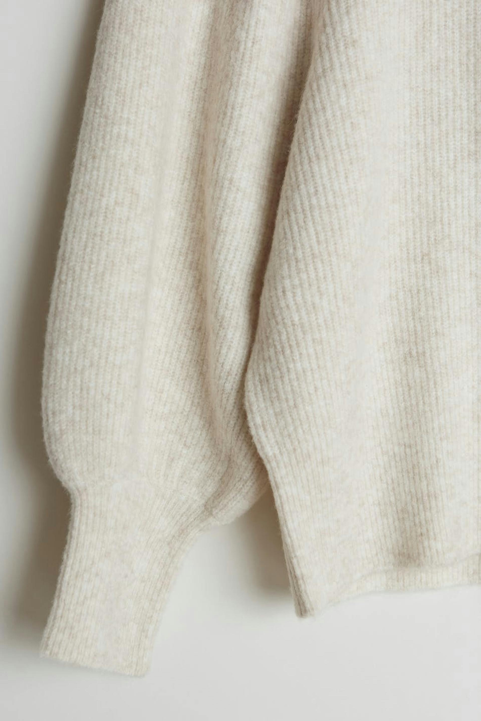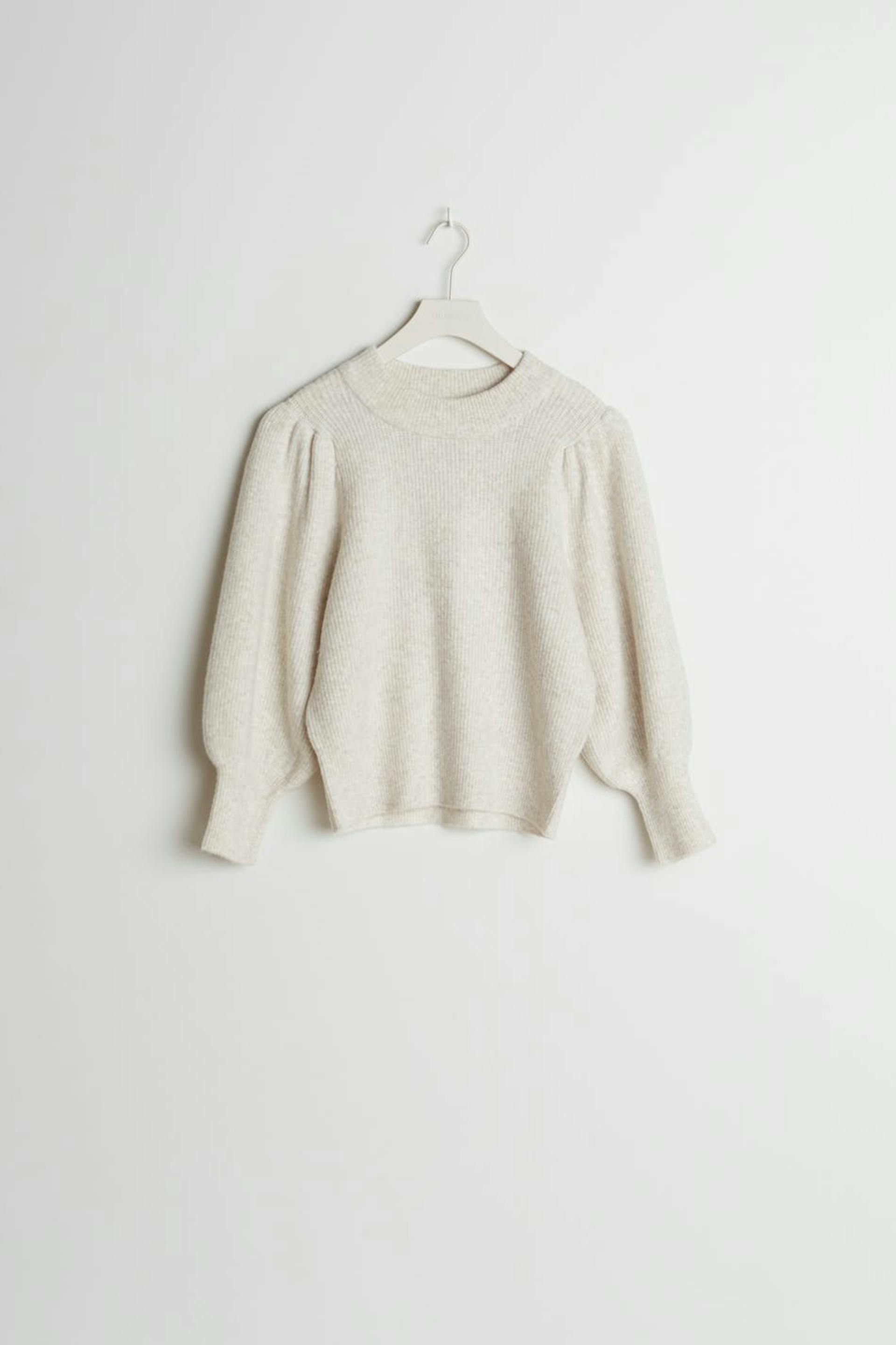 Knitted jumper with spacious sleeves with tapering on the sleeve ends. The jumper is beige and ribbed and has details with gathers at the shoulders.