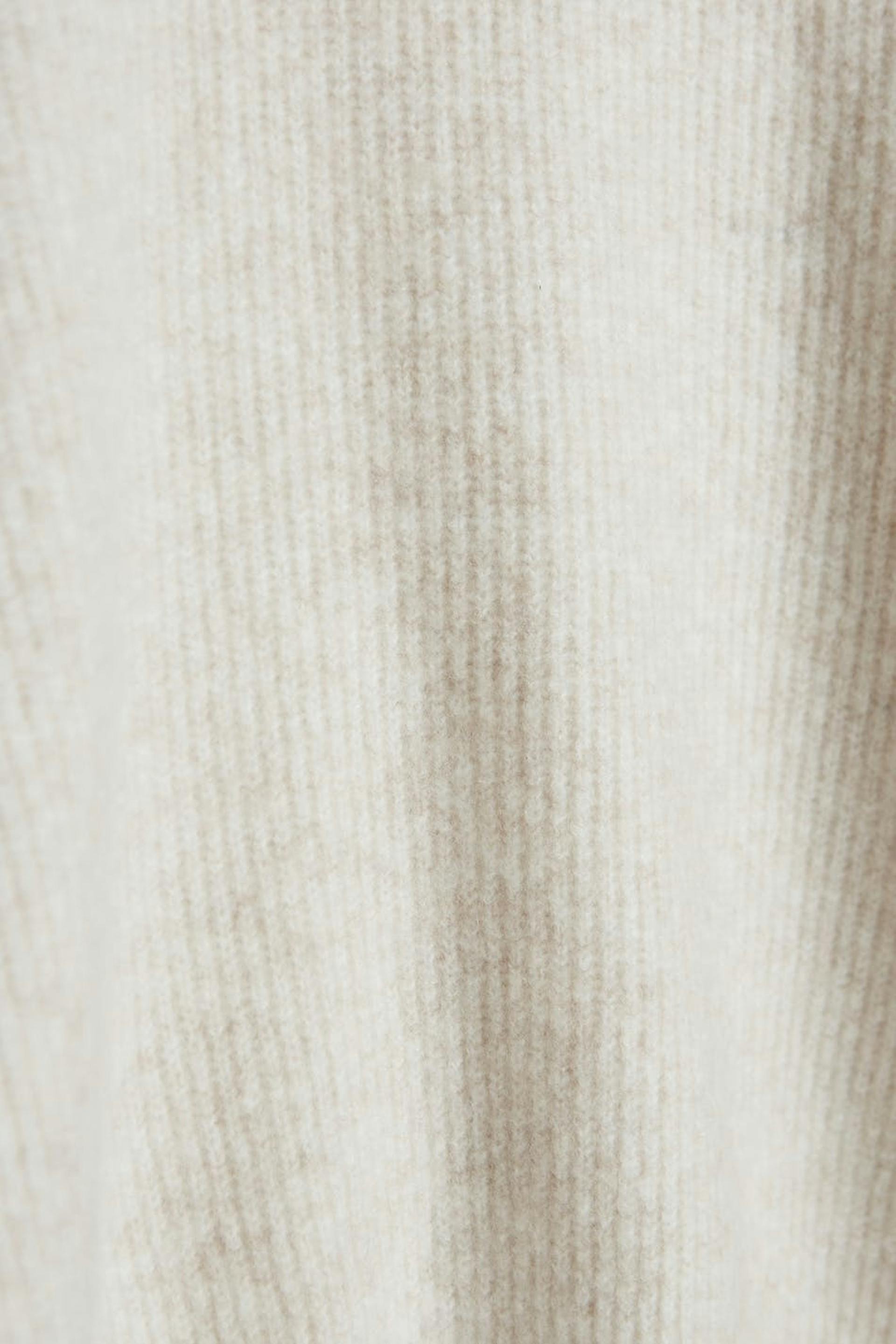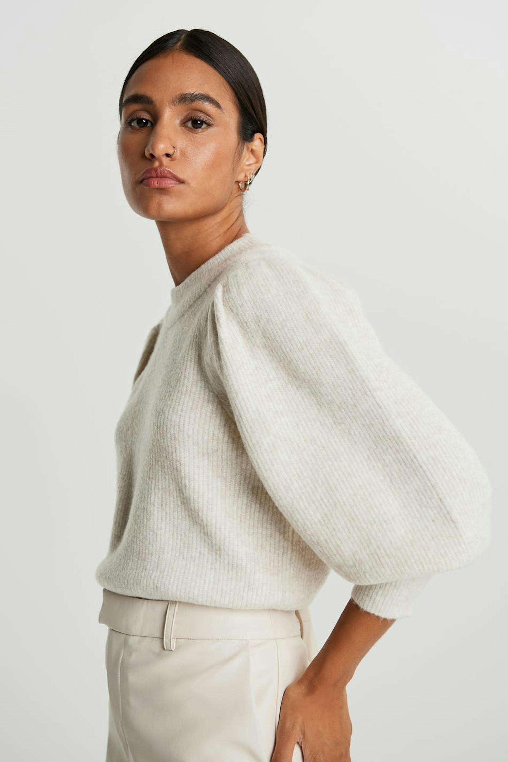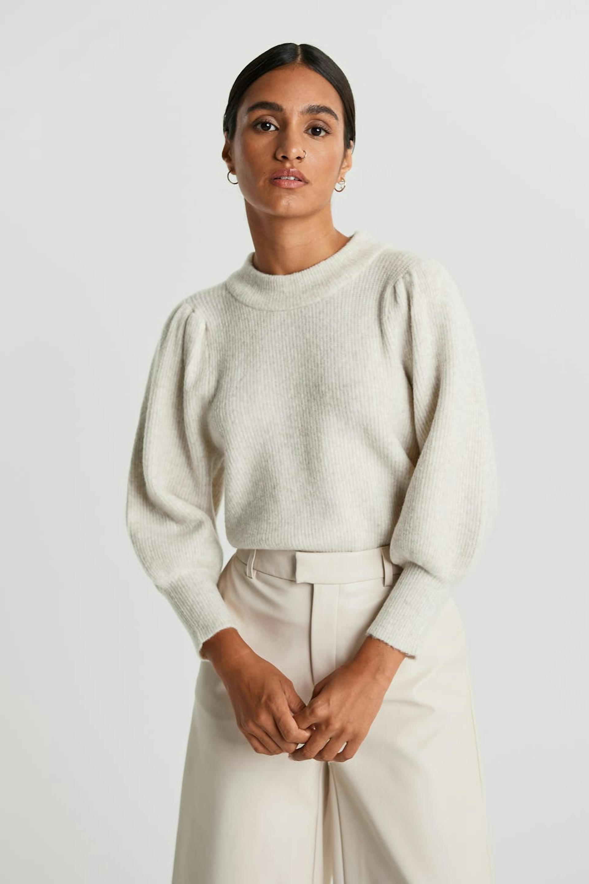 Knitted jumper with spacious sleeves with tapering on the sleeve ends. The jumper is beige and ribbed and has details with gathers at the shoulders.