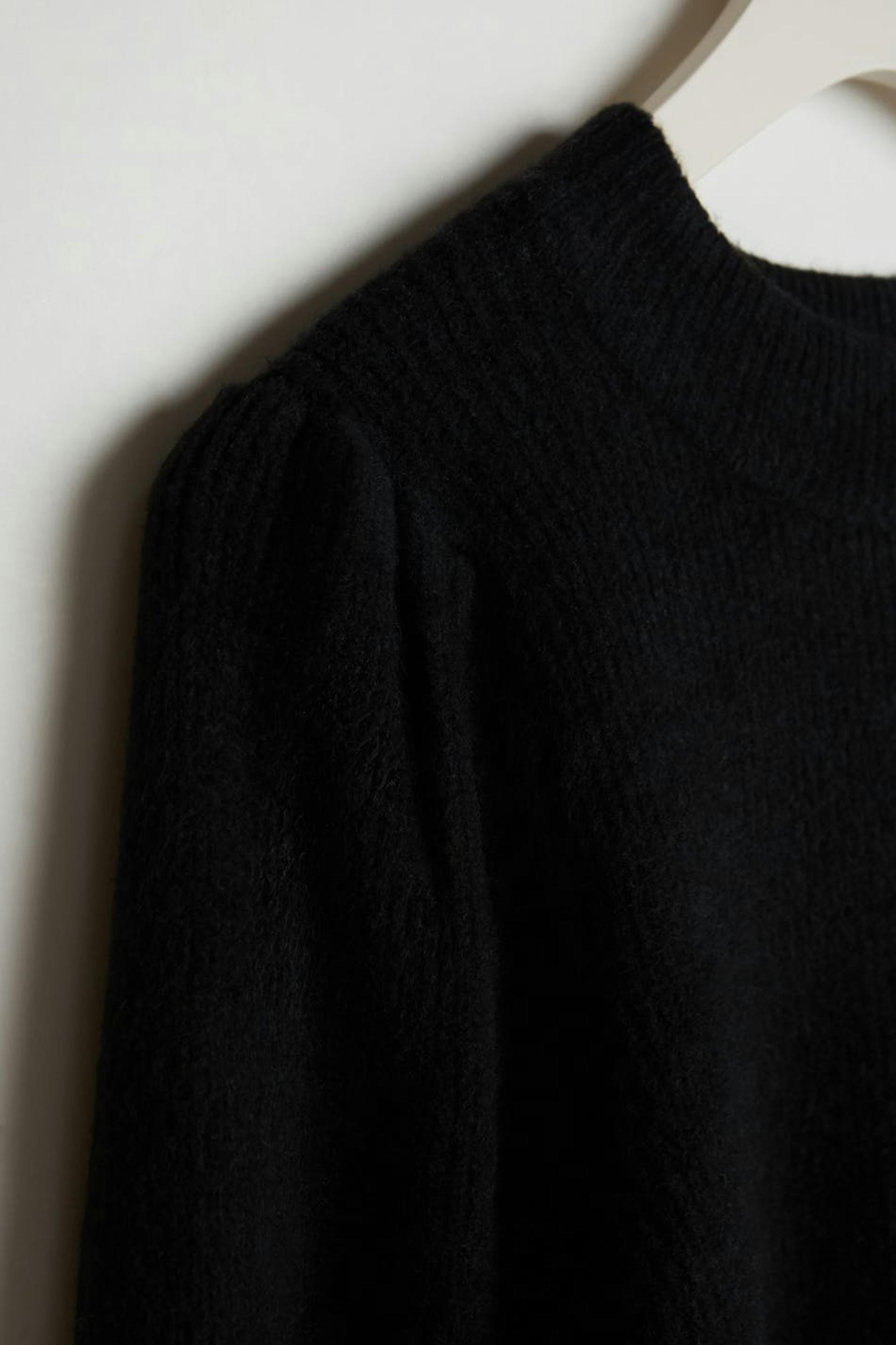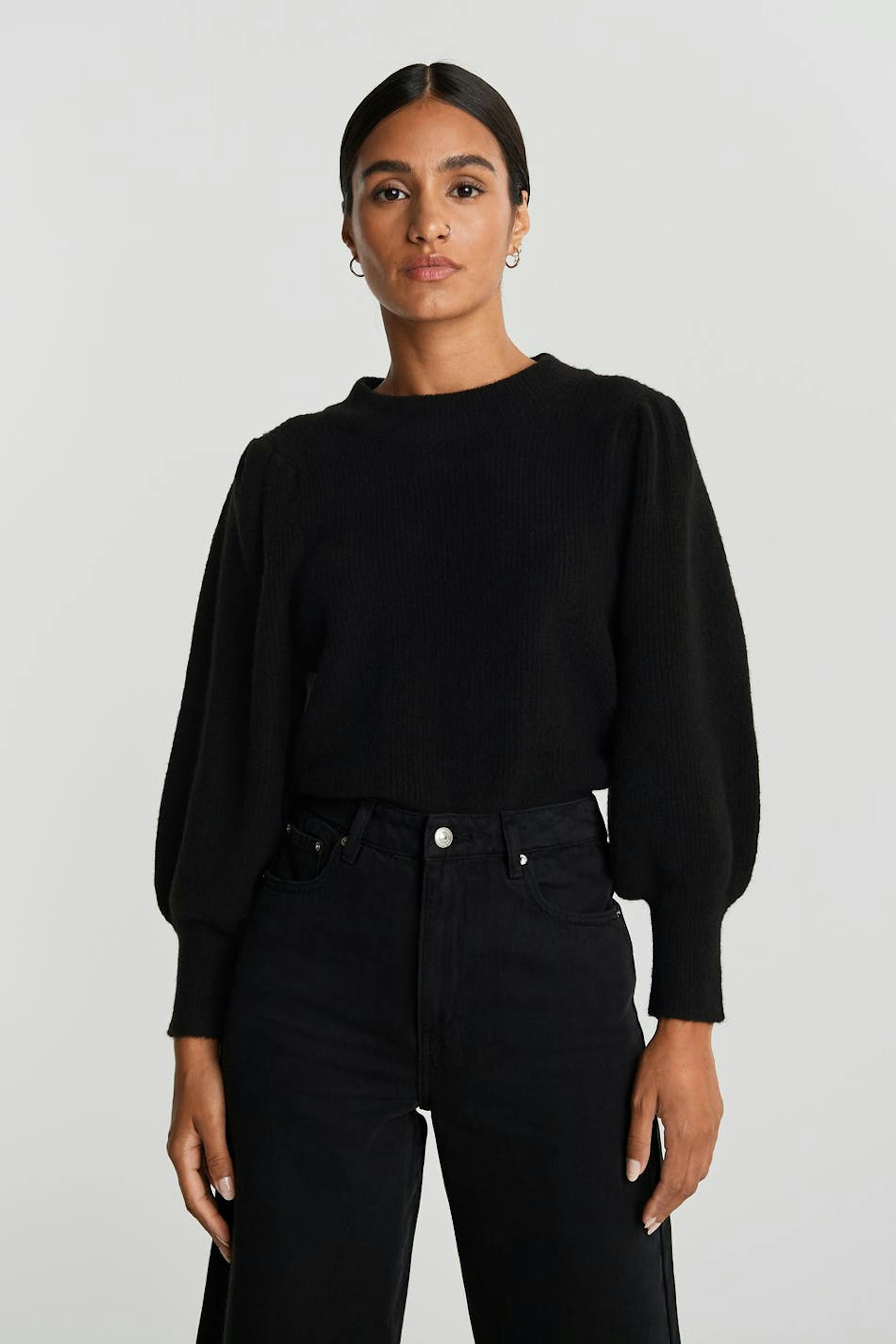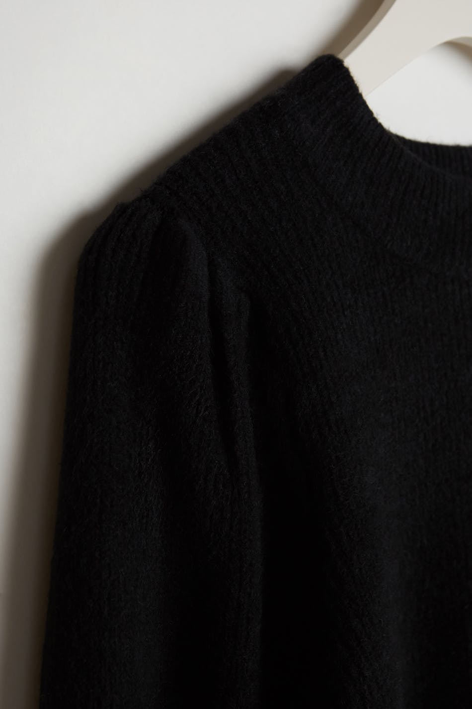 Knitted jumper with spacious sleeves with tapering on the sleeve ends. The jumper is black and ribbed and has details with gathers at the shoulders.