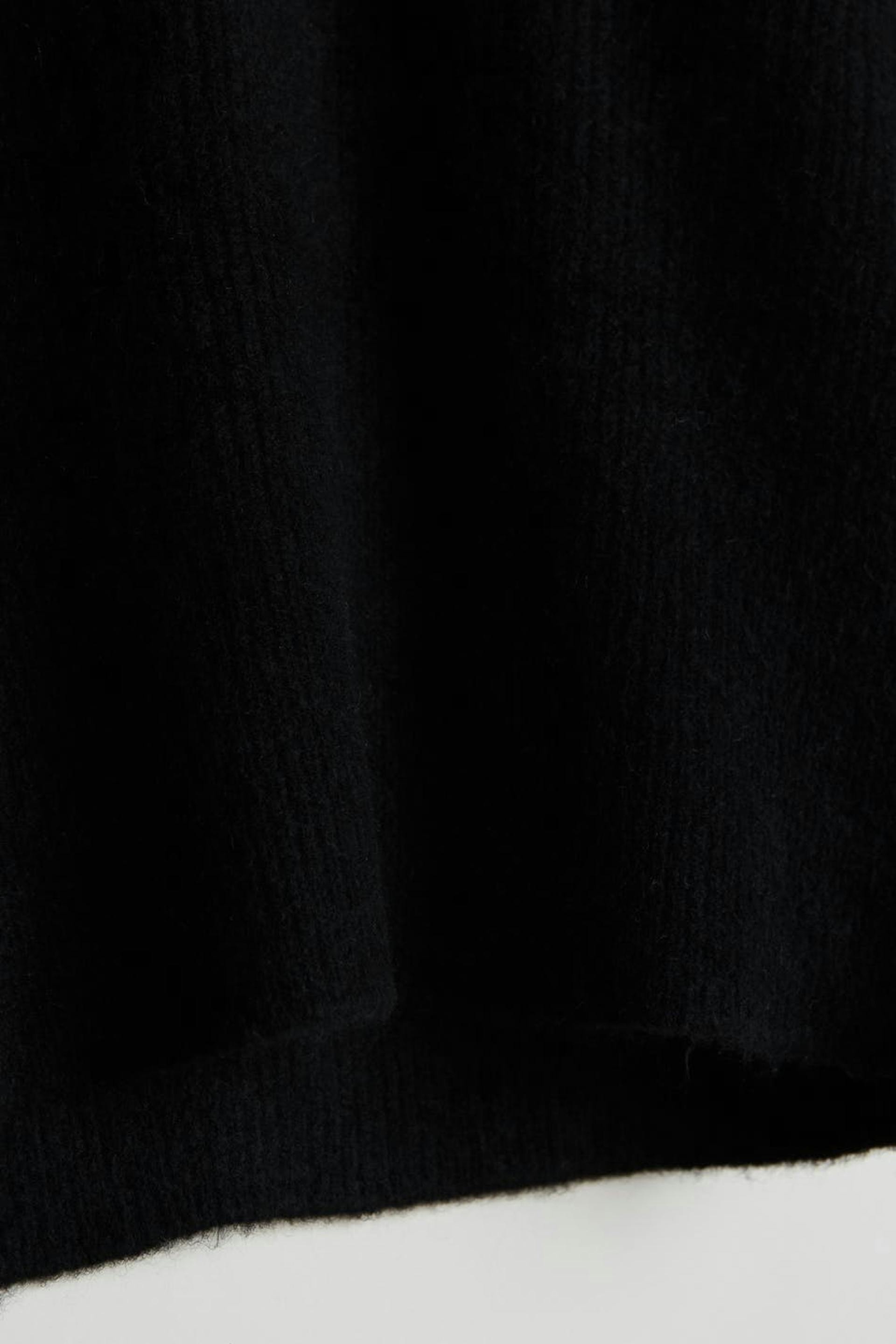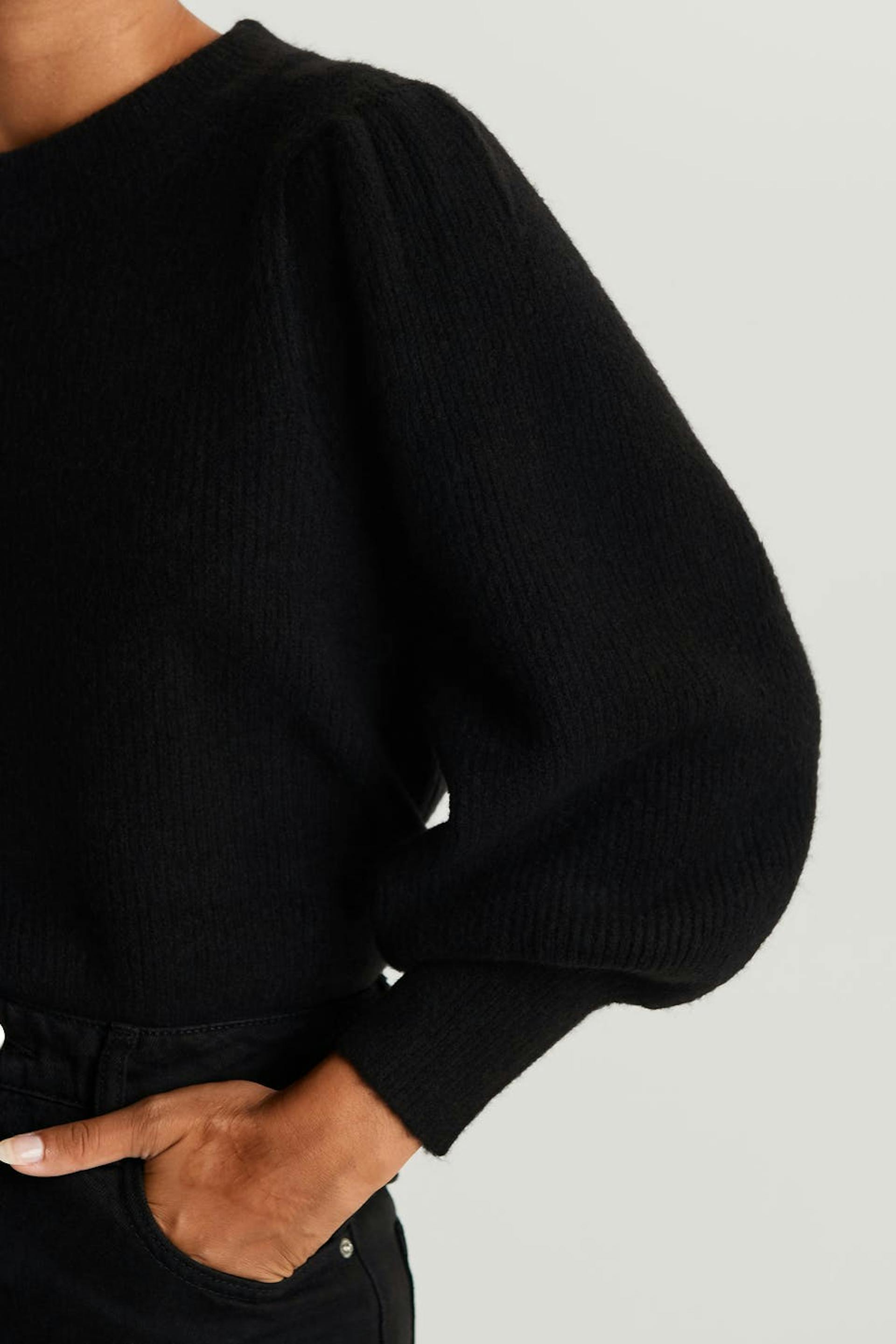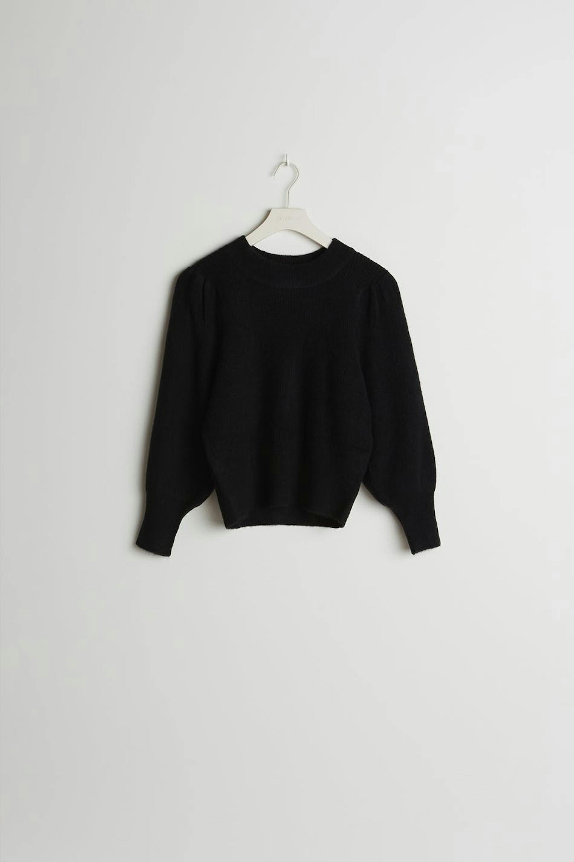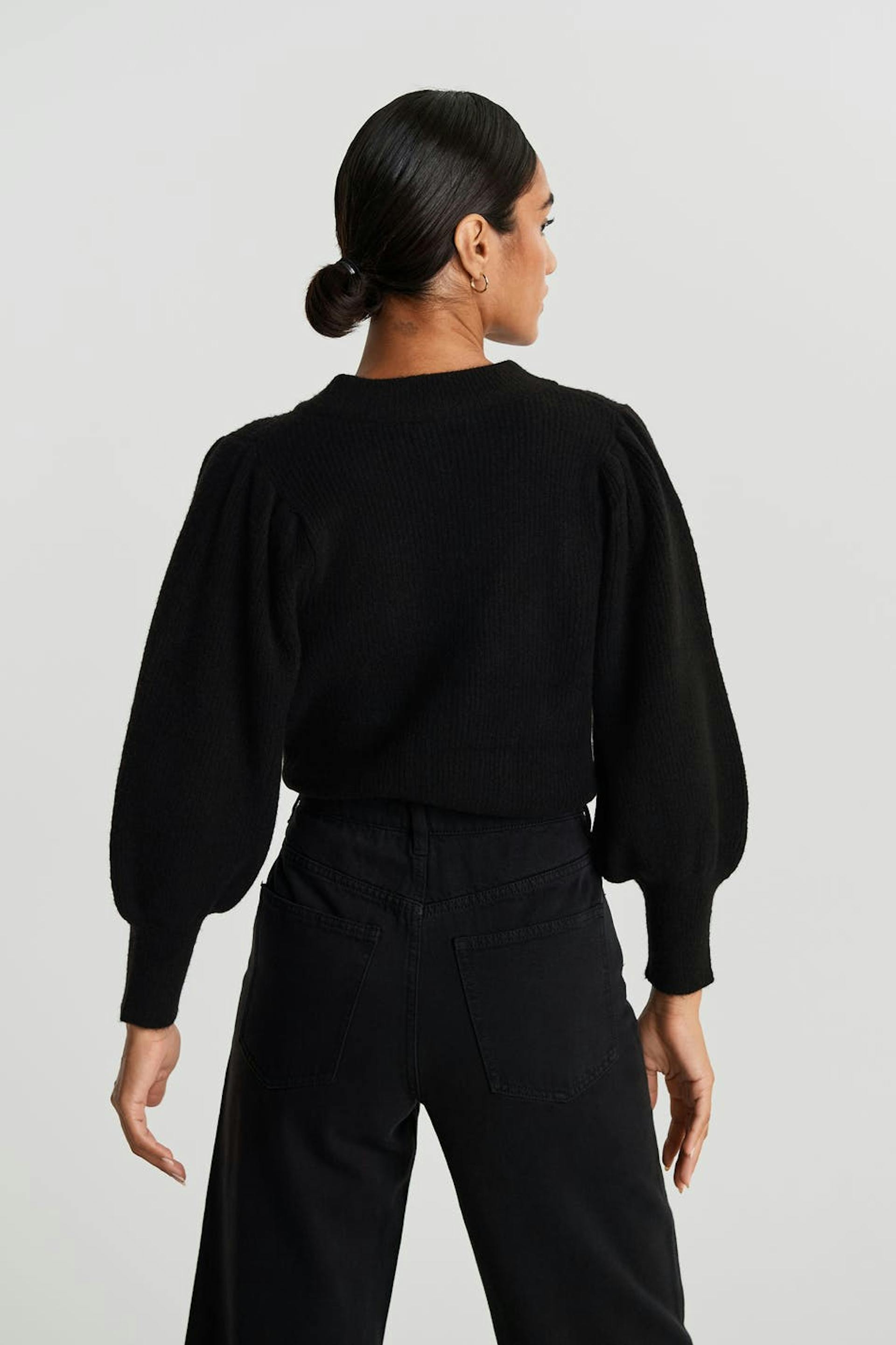 Knitted jumper with spacious sleeves with tapering on the sleeve ends. The jumper is black and ribbed and has details with gathers at the shoulders.