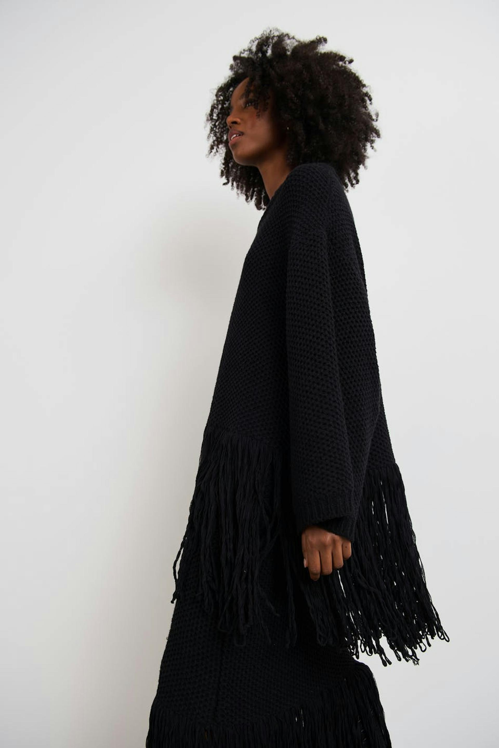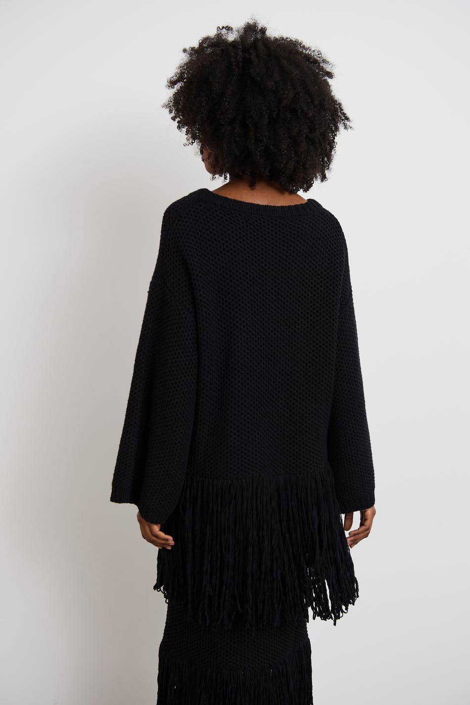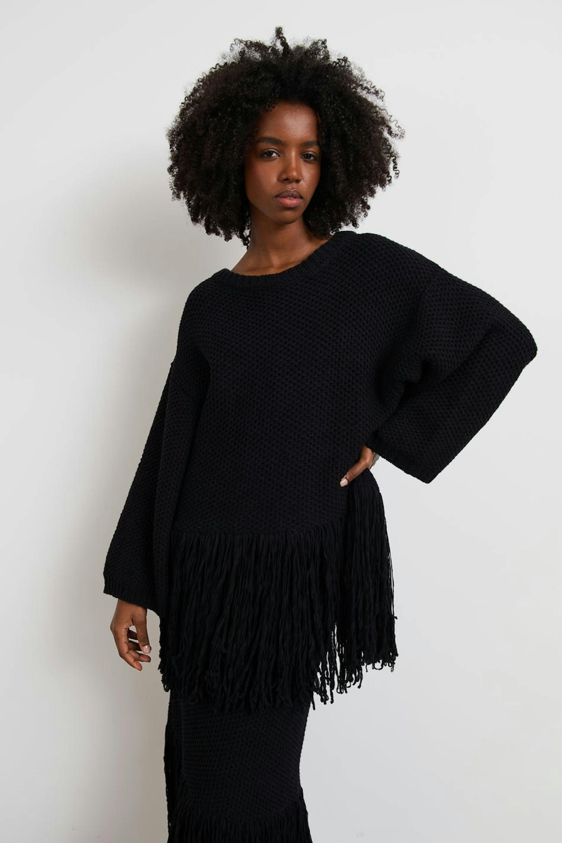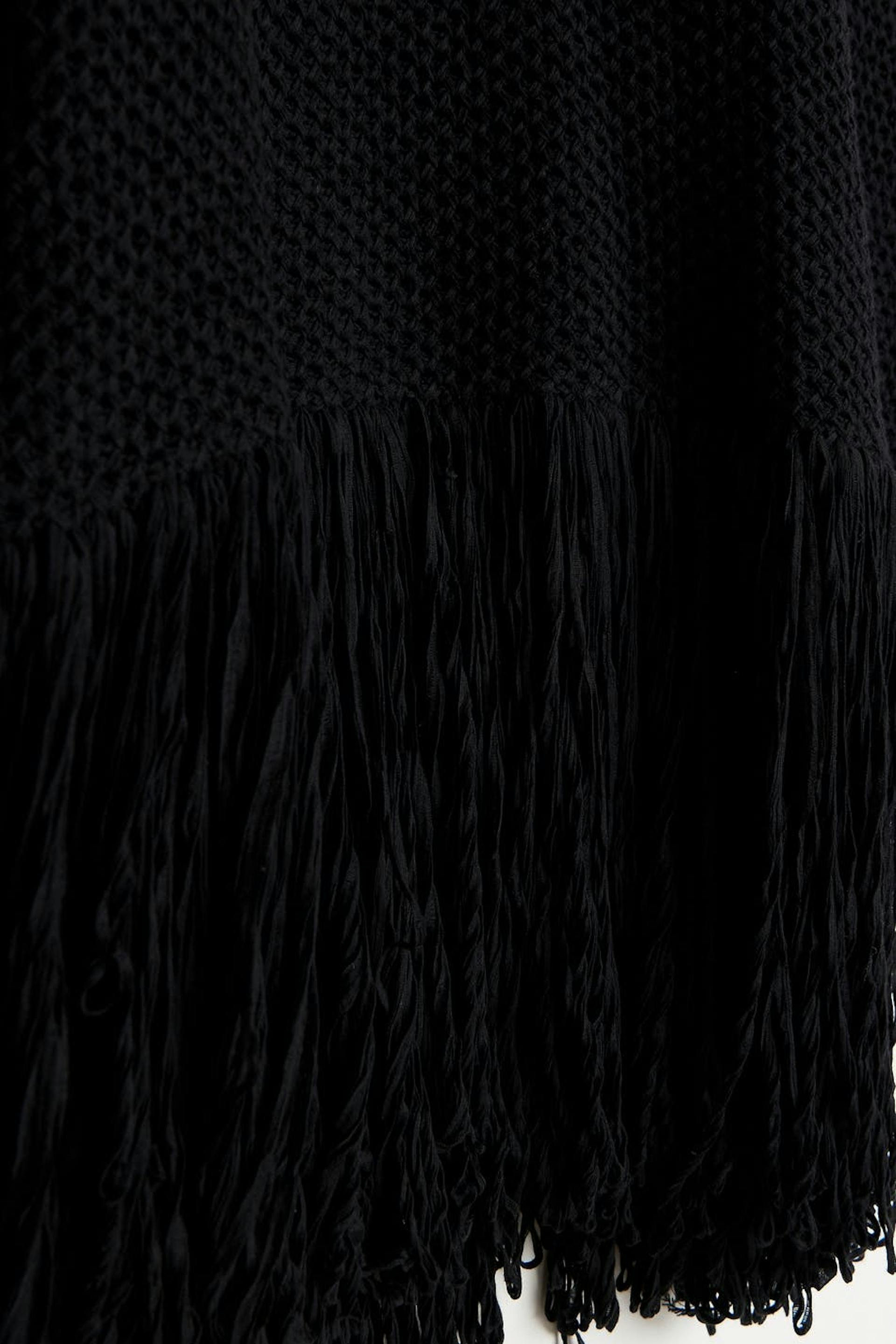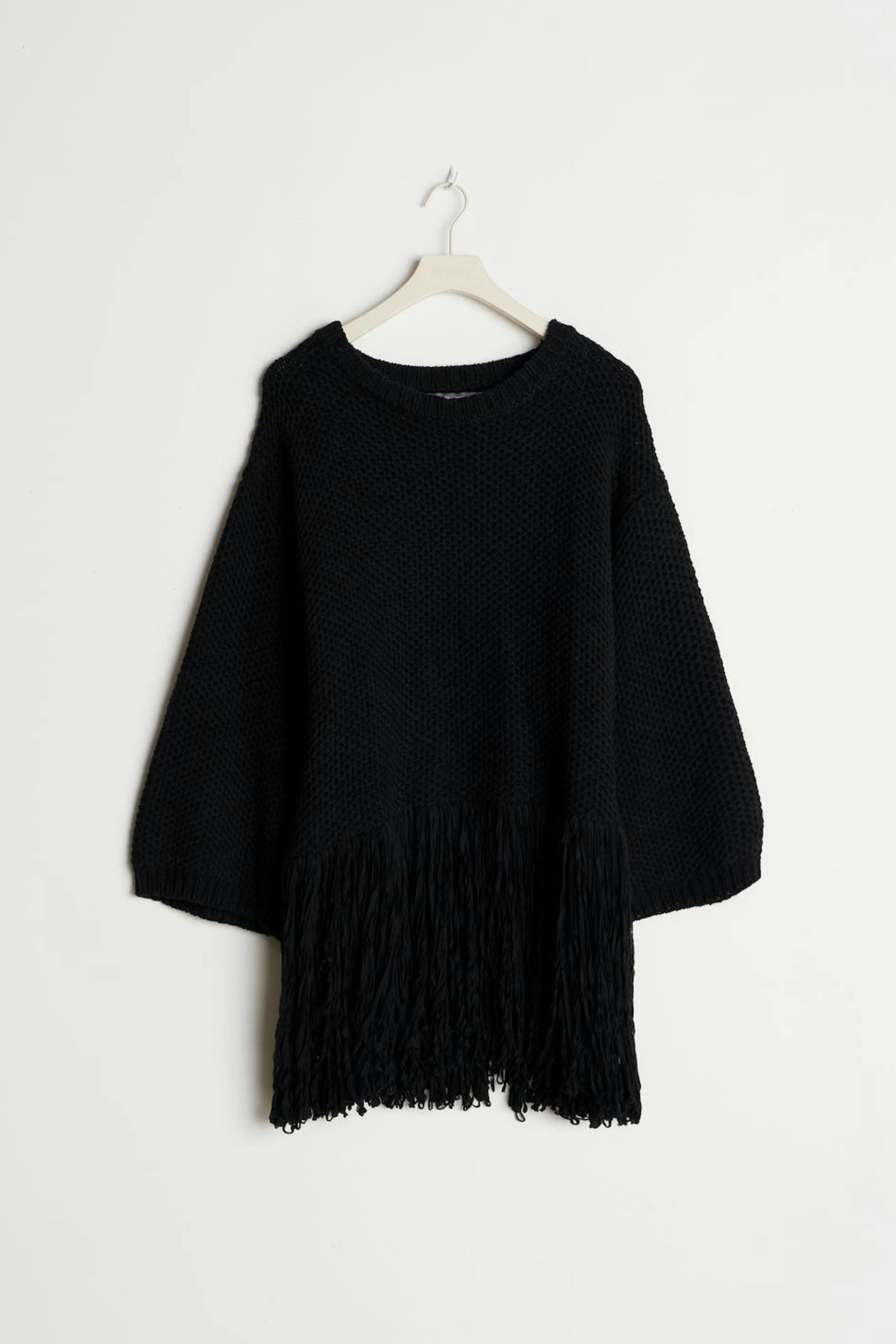 Knitted jumper with loose-fitting style. The jumper is black and has fringes at the bottom. It has a rounded neckline and spacious sleeves.