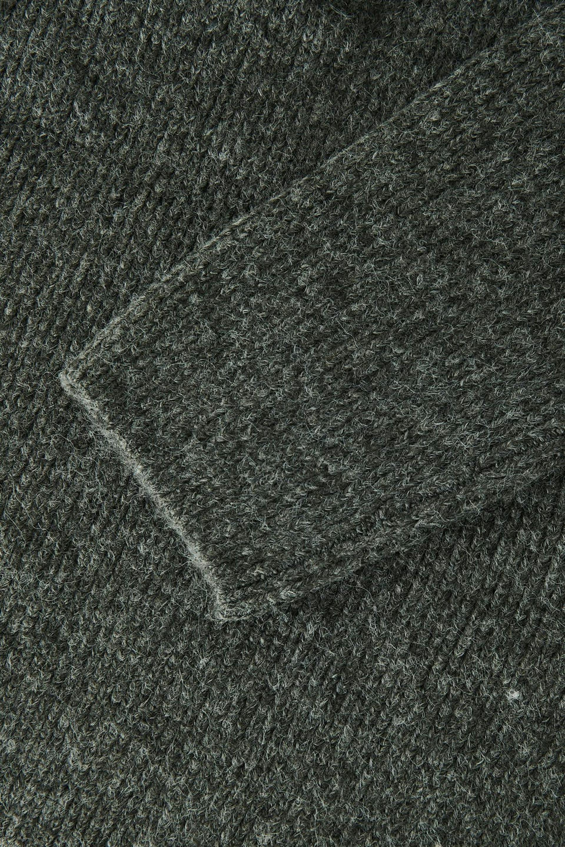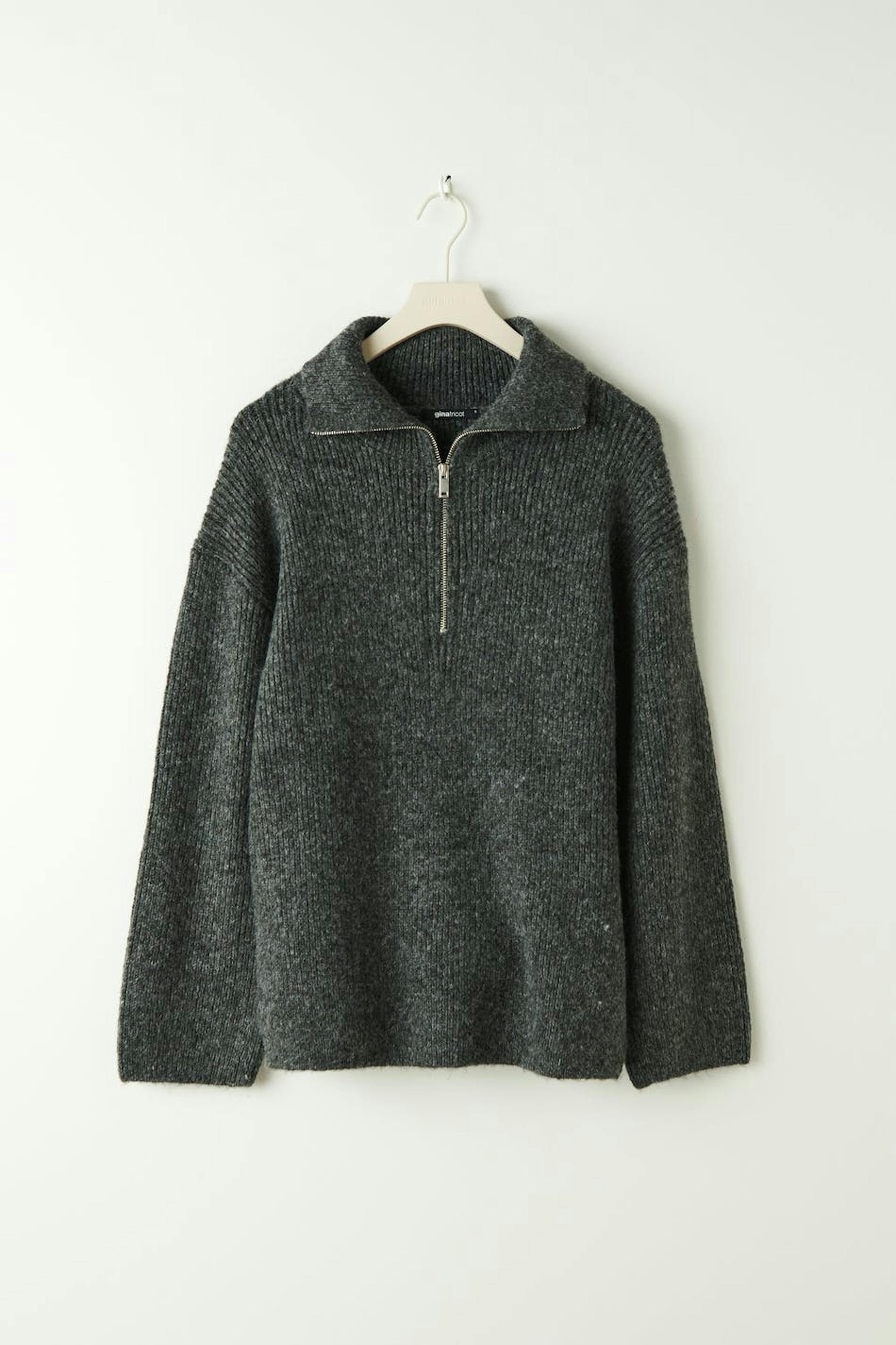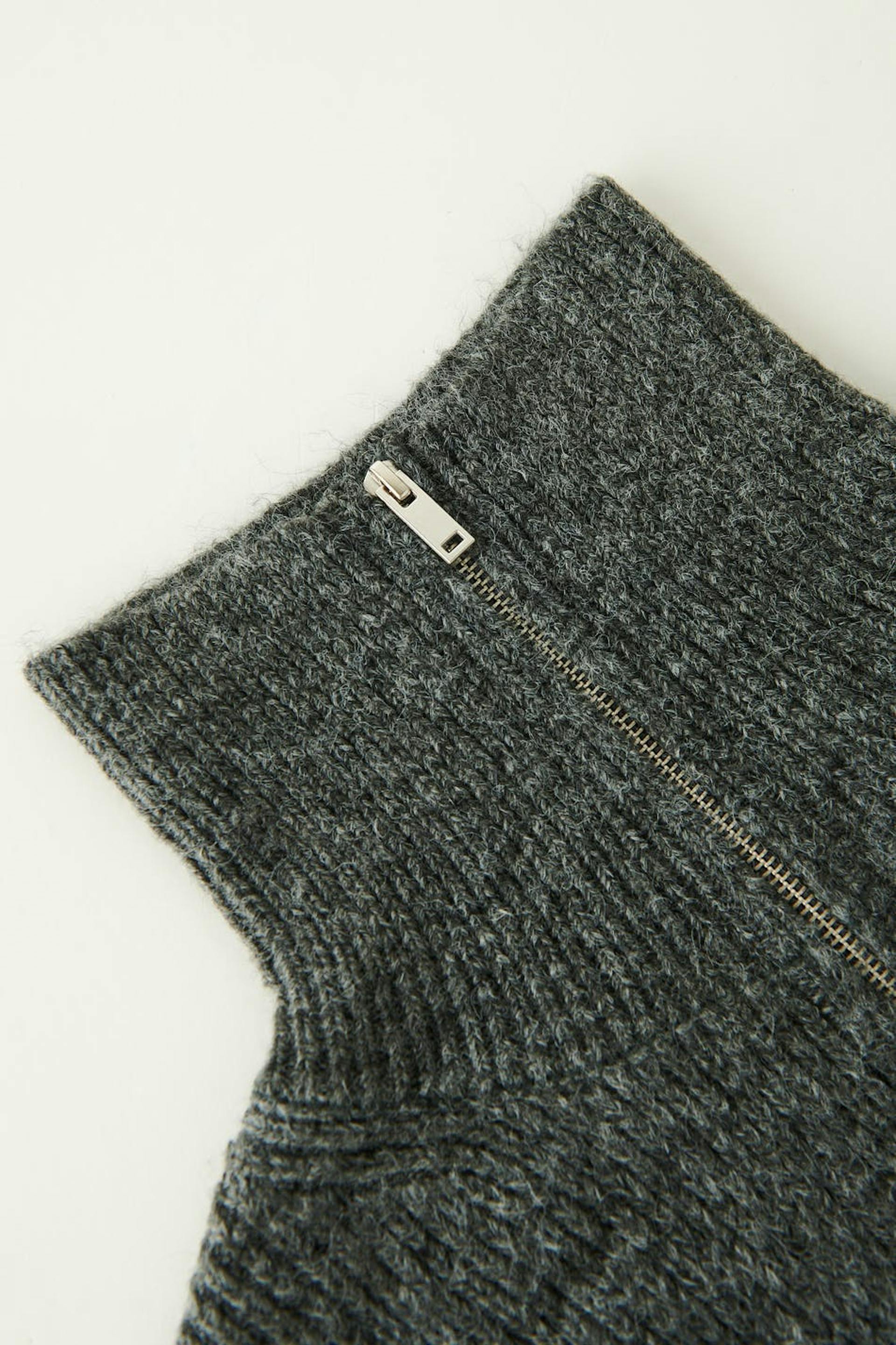 Knitted jumper with slit in the sides. The jumper is grey, long-sleeved and ribbed. It has high neck with half-up zip and dropped shoulders.