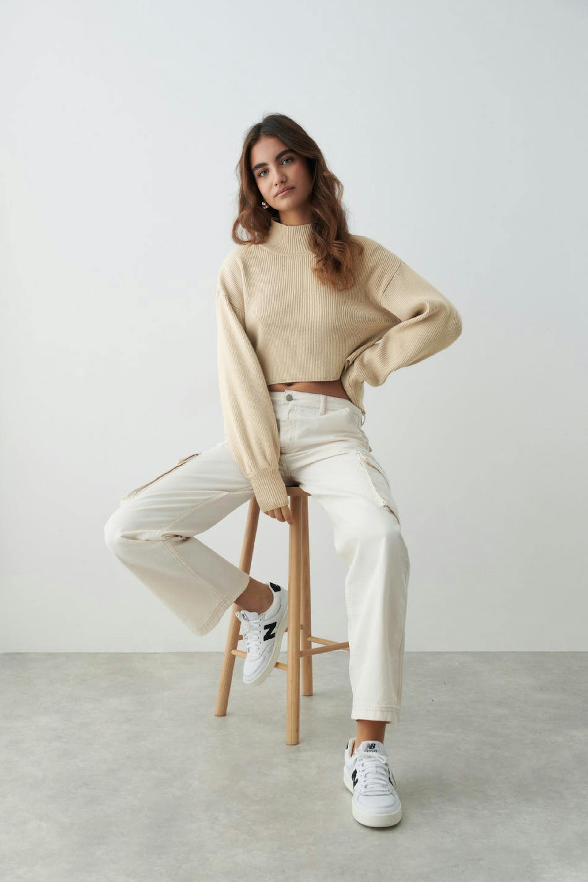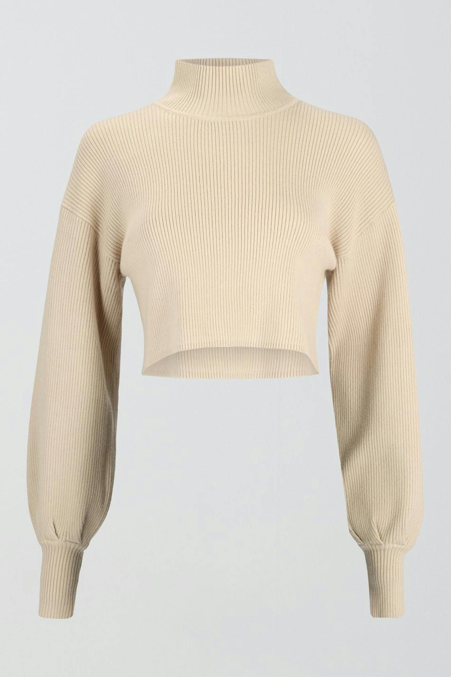 Cropped knitted sweater with turtleneck. The sweat is beige, ribbed and long-sleeved. It has voluminous sleeves and ribbing on the sleeve ends.