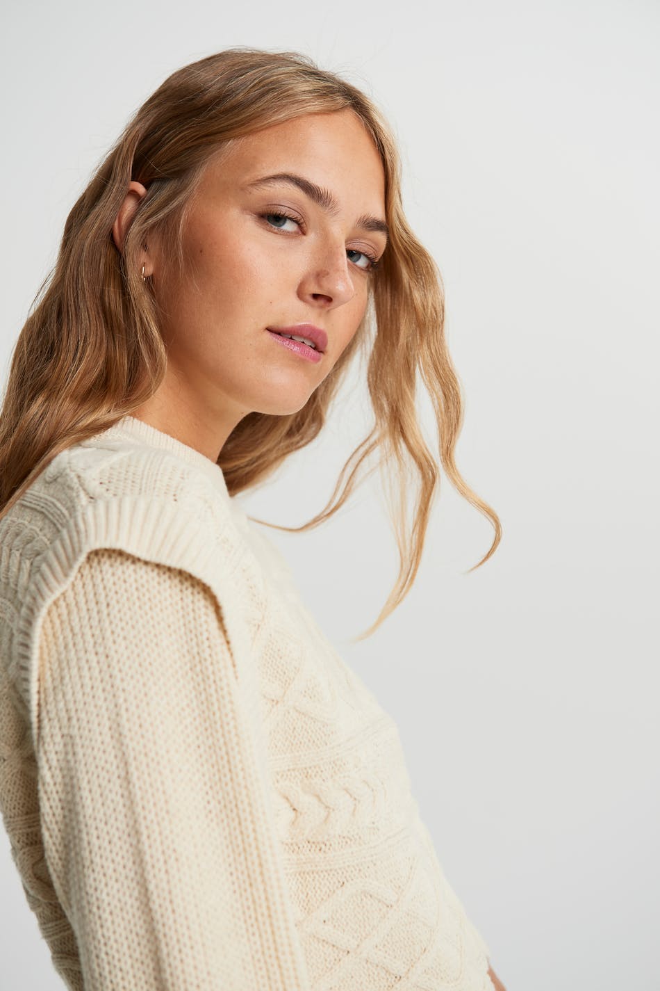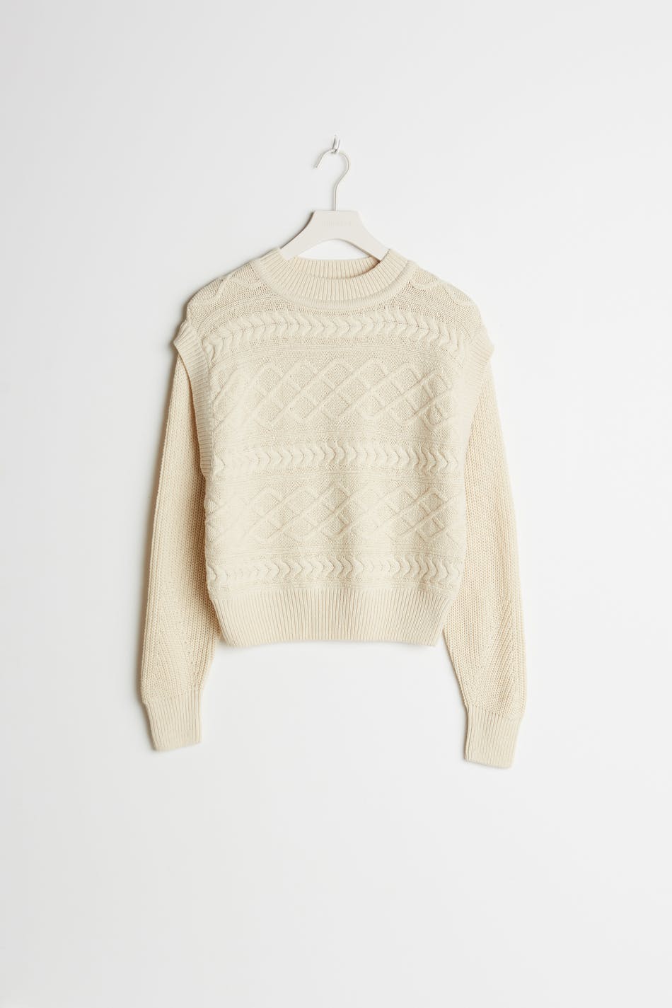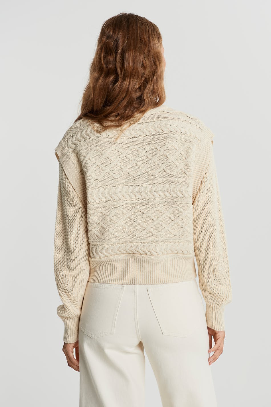 Jumper with a shoulder detail. The jumper is white and has knitted details.