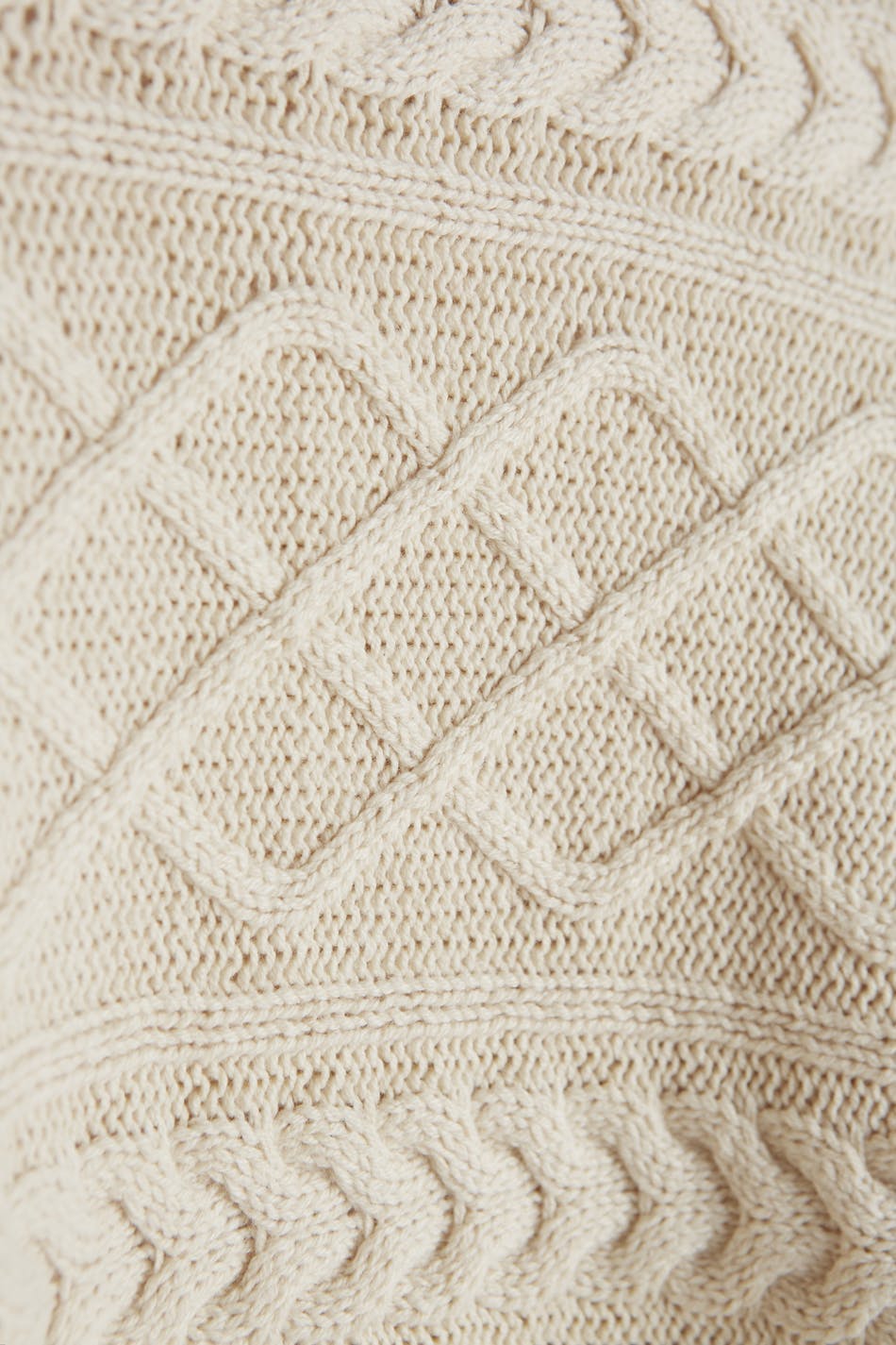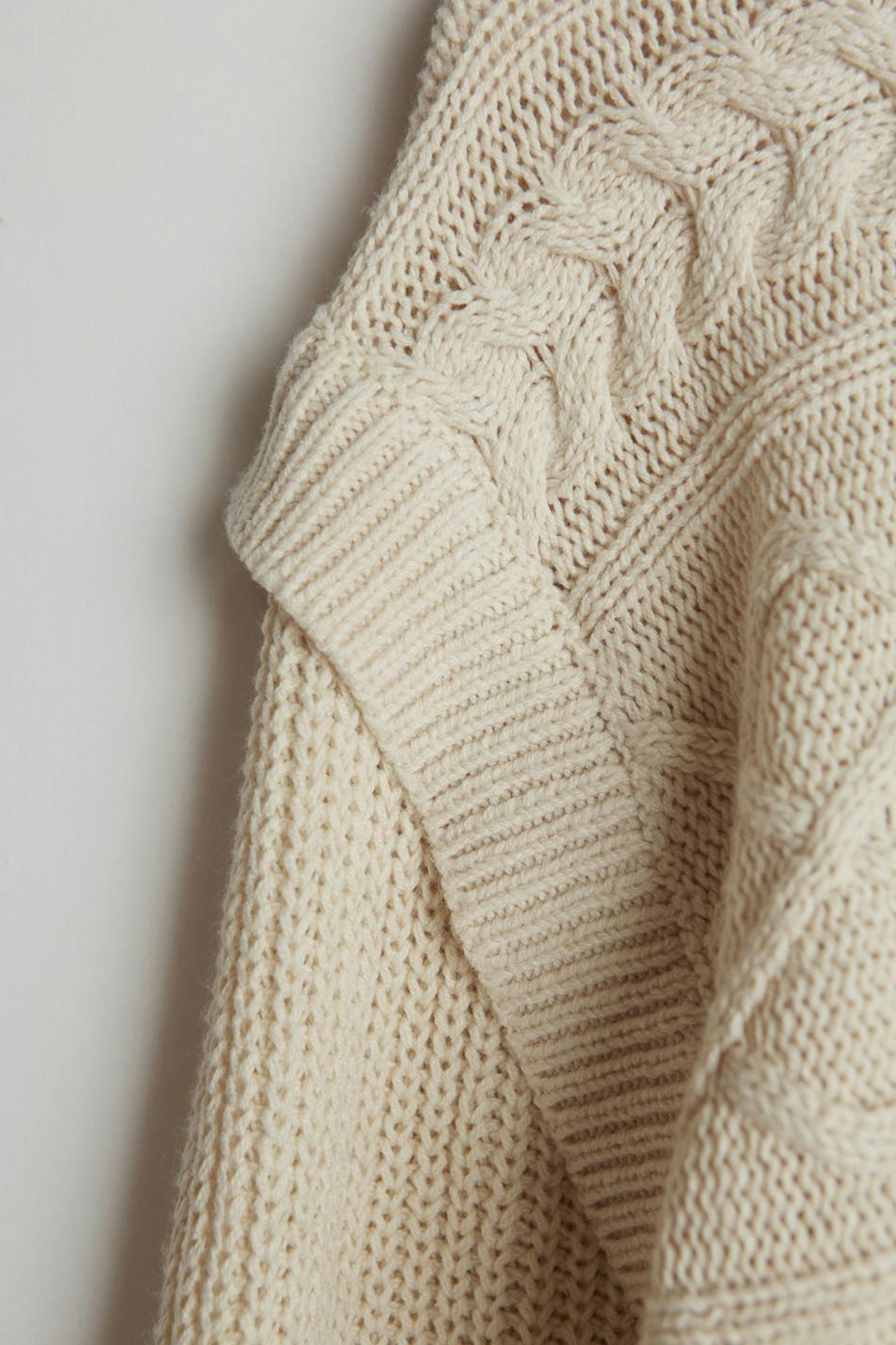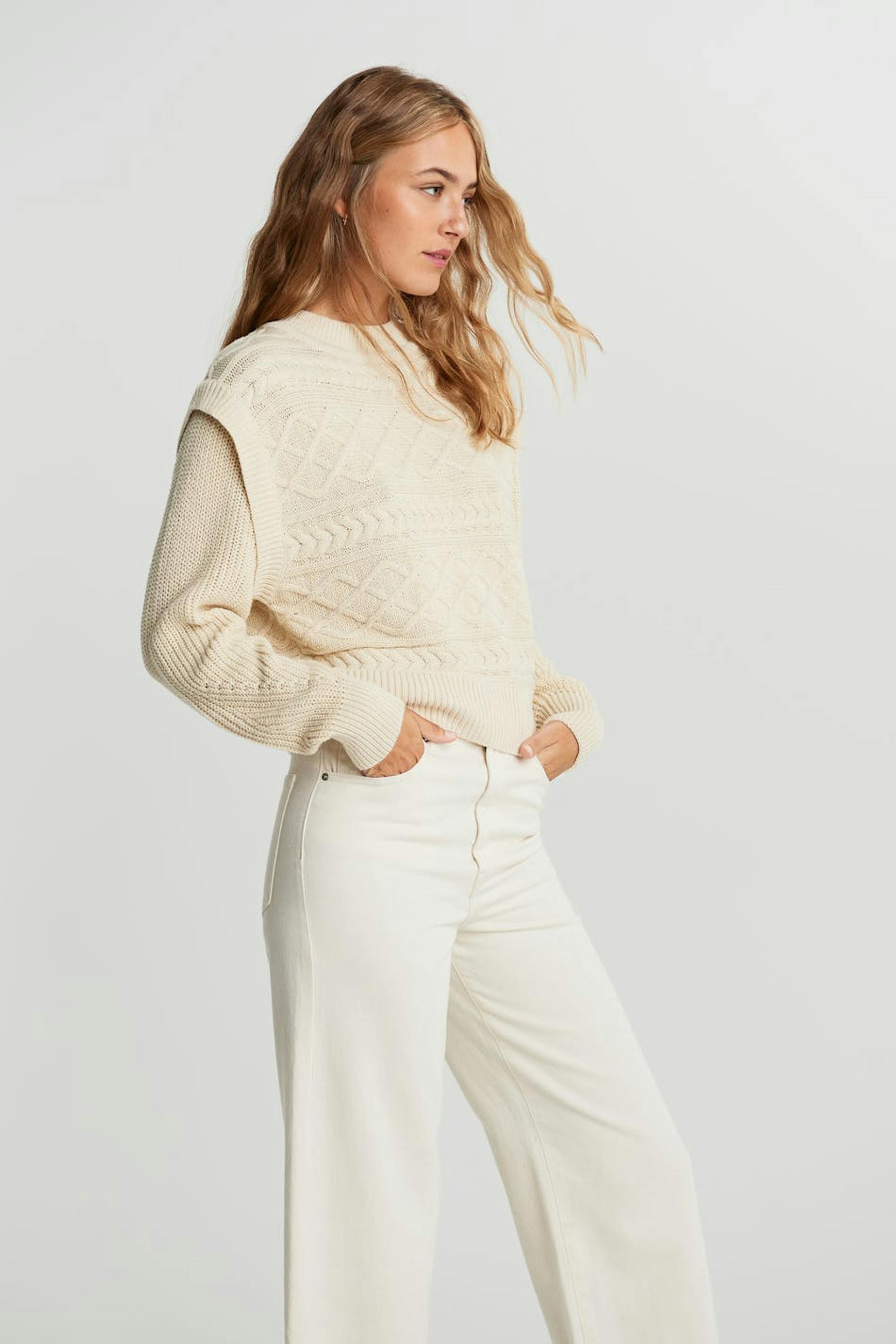 Jumper with a shoulder detail. The jumper is white and has knitted details.