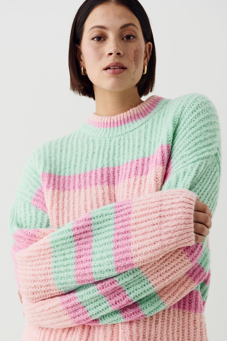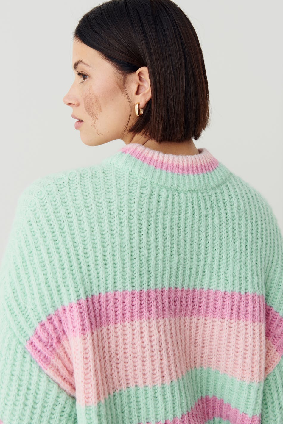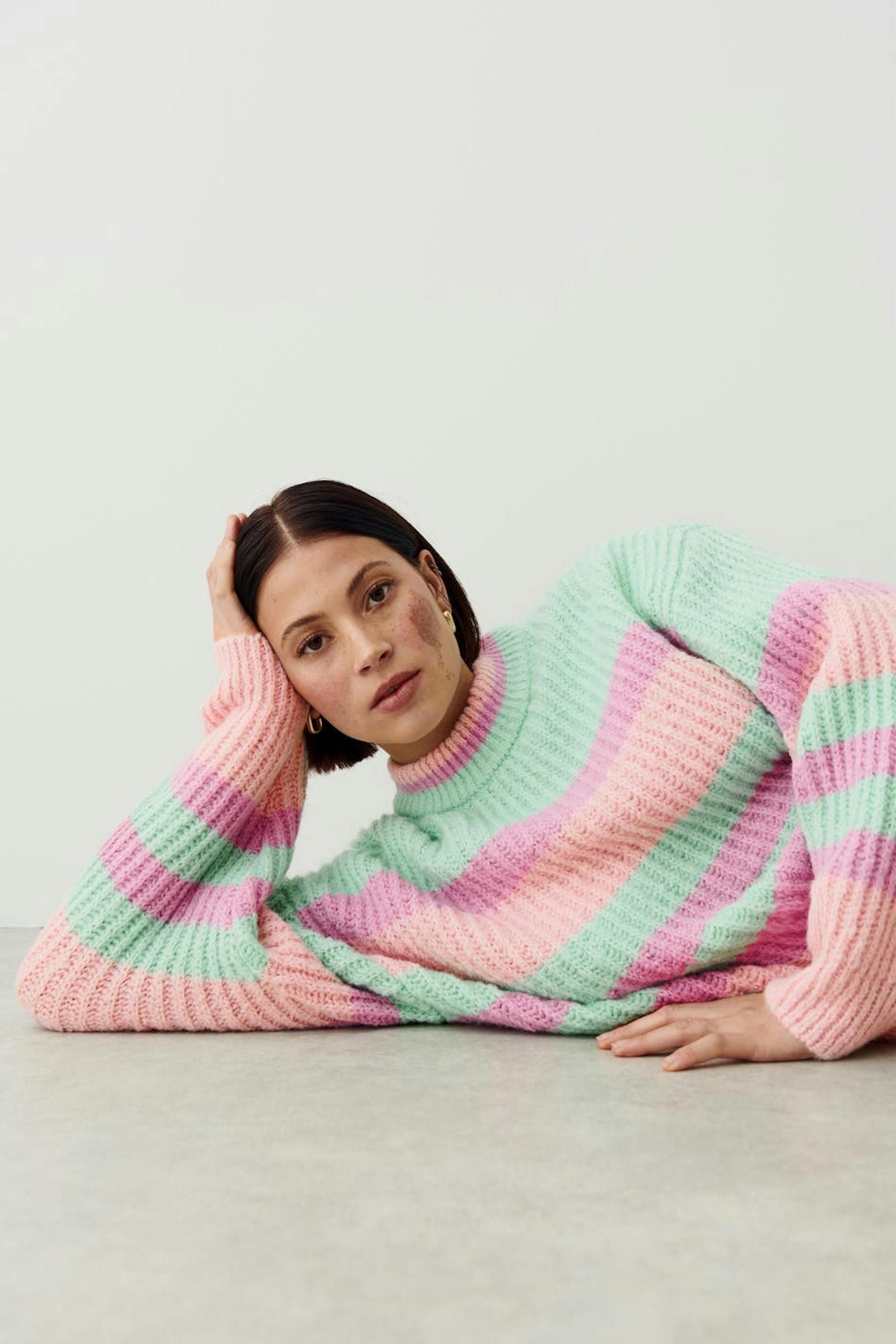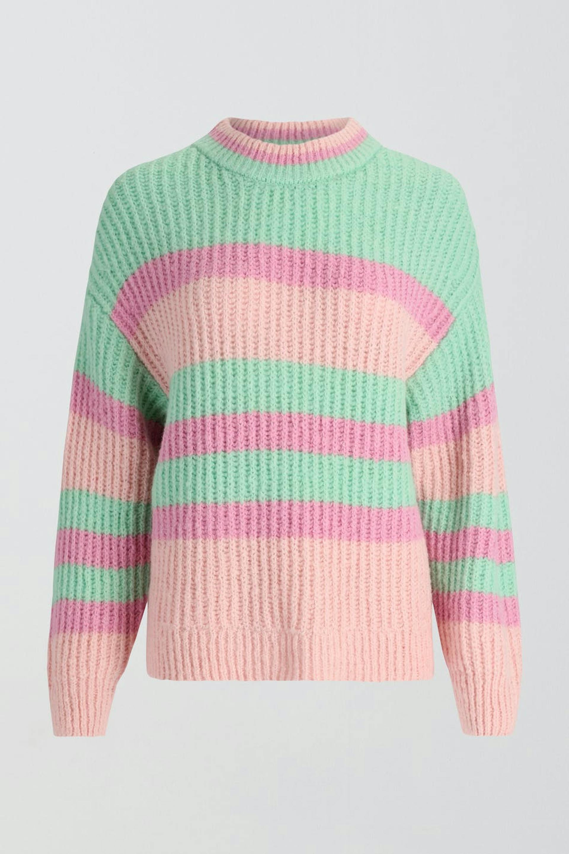 Striped knitted sweater with boxy fit. The sweat is pink and green and has round neckline.