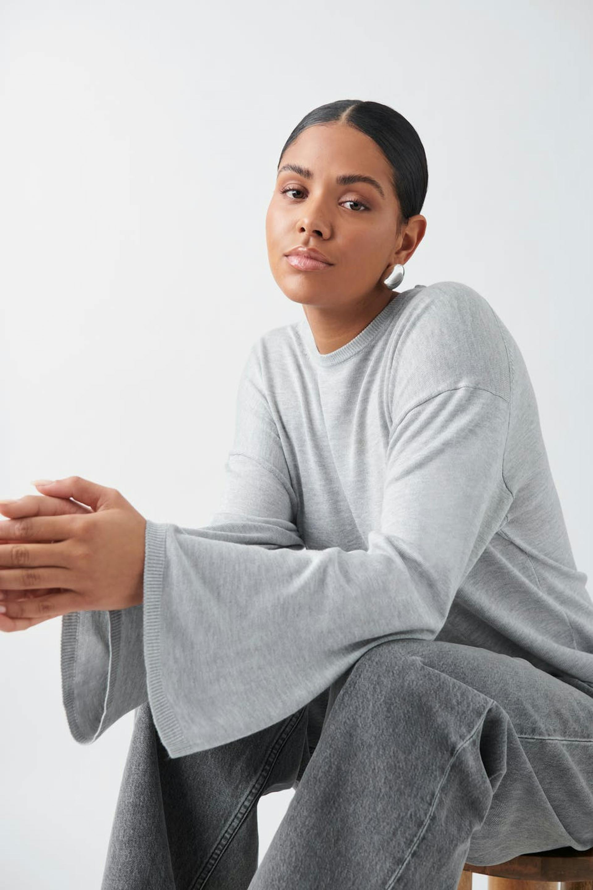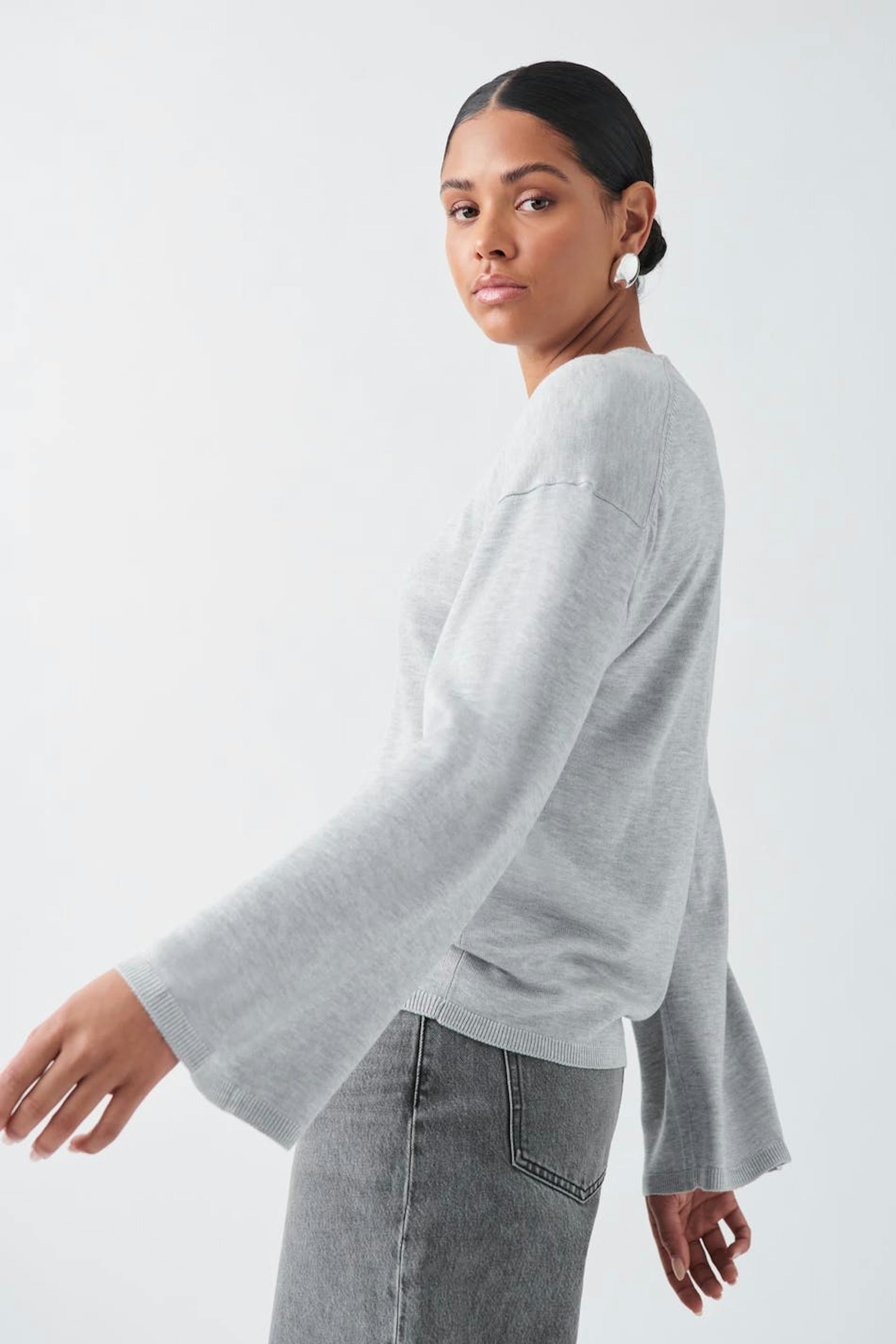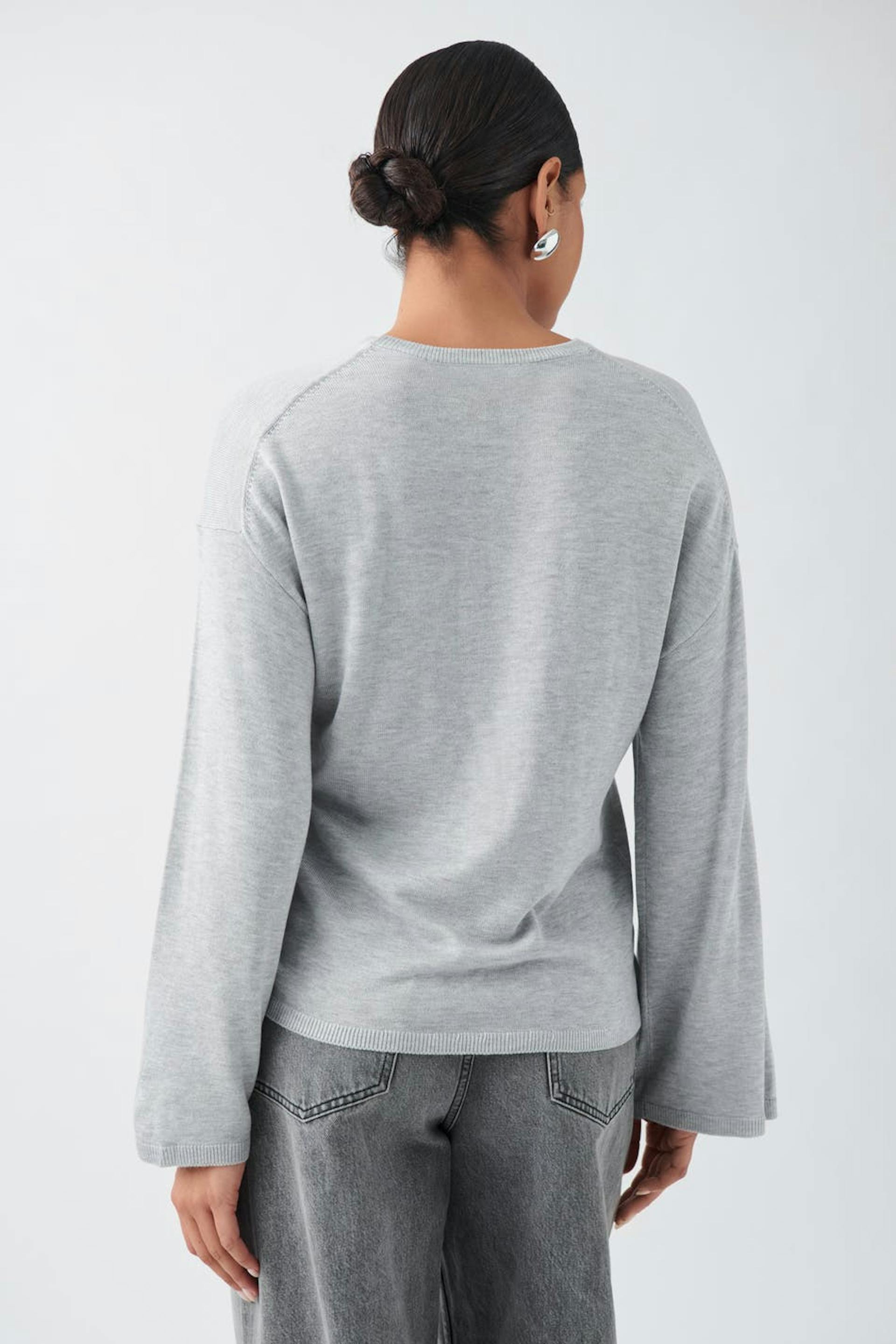 Fine knit jumper with regular fit. The jumper is grey and has round neckline. It has long sleeve, dropped shoulder and rib knit at sleeve ends and at the bottom.