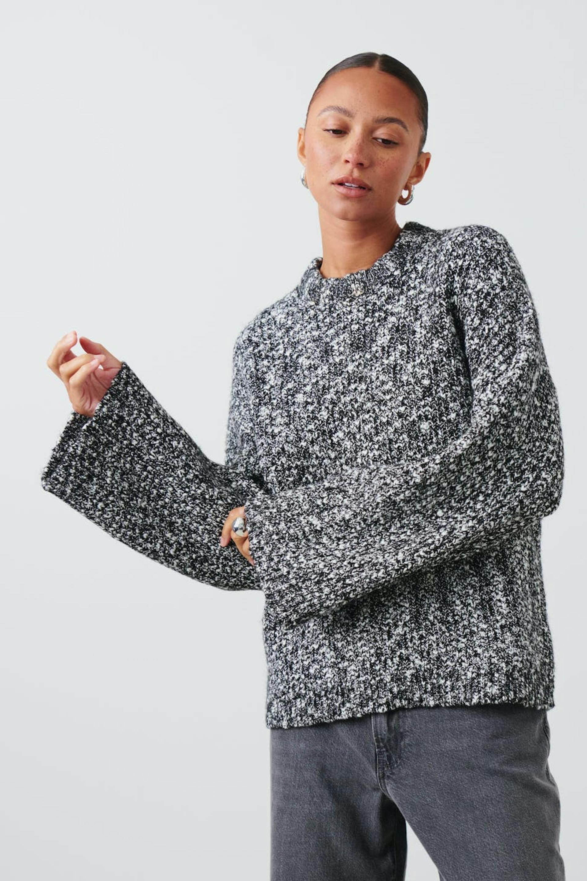 Rib-knit jumper in bouclé with loose-fitting style. The jumper is black and has round neckline.