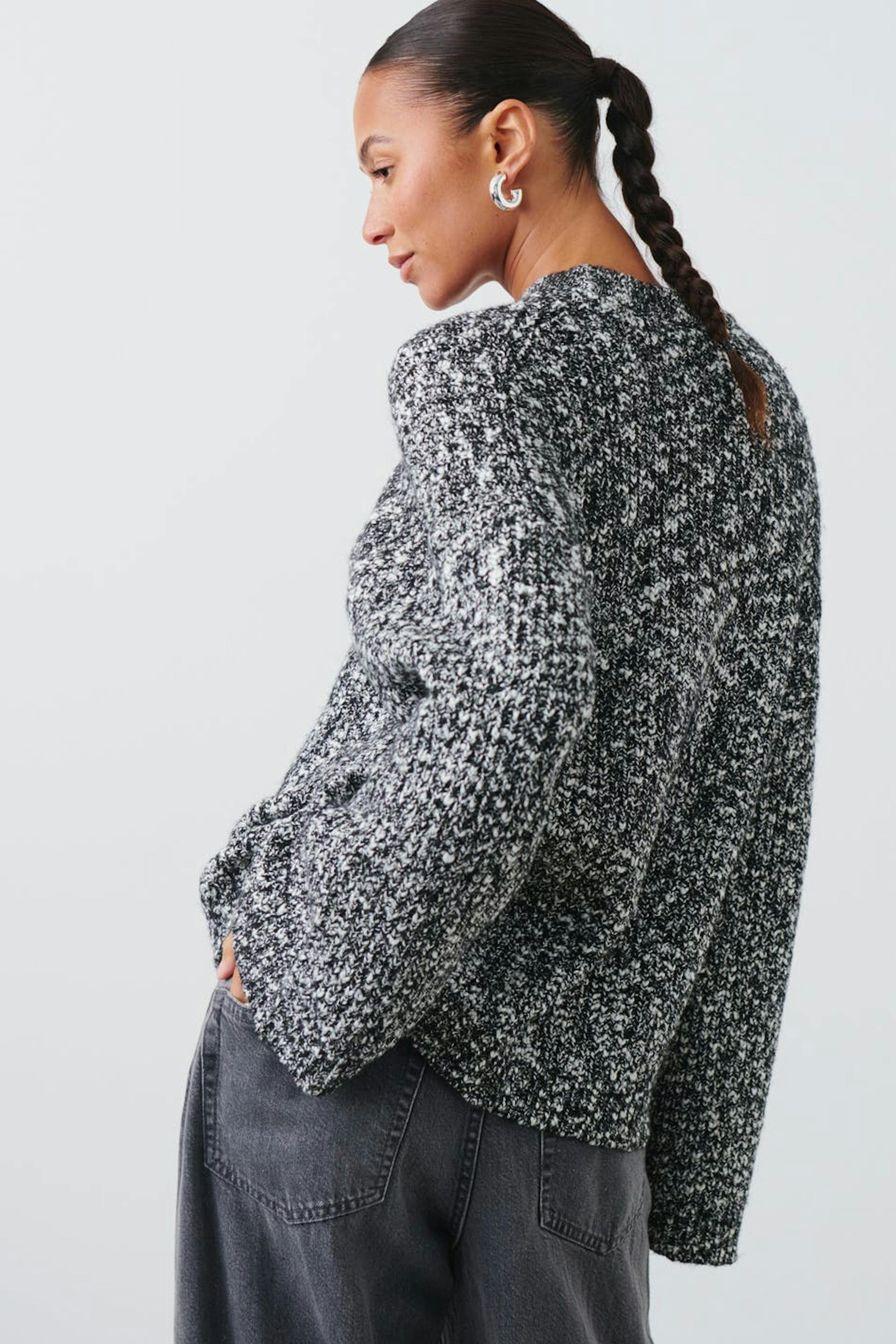 Rib-knit jumper in bouclé with loose-fitting style. The jumper is black and has round neckline.