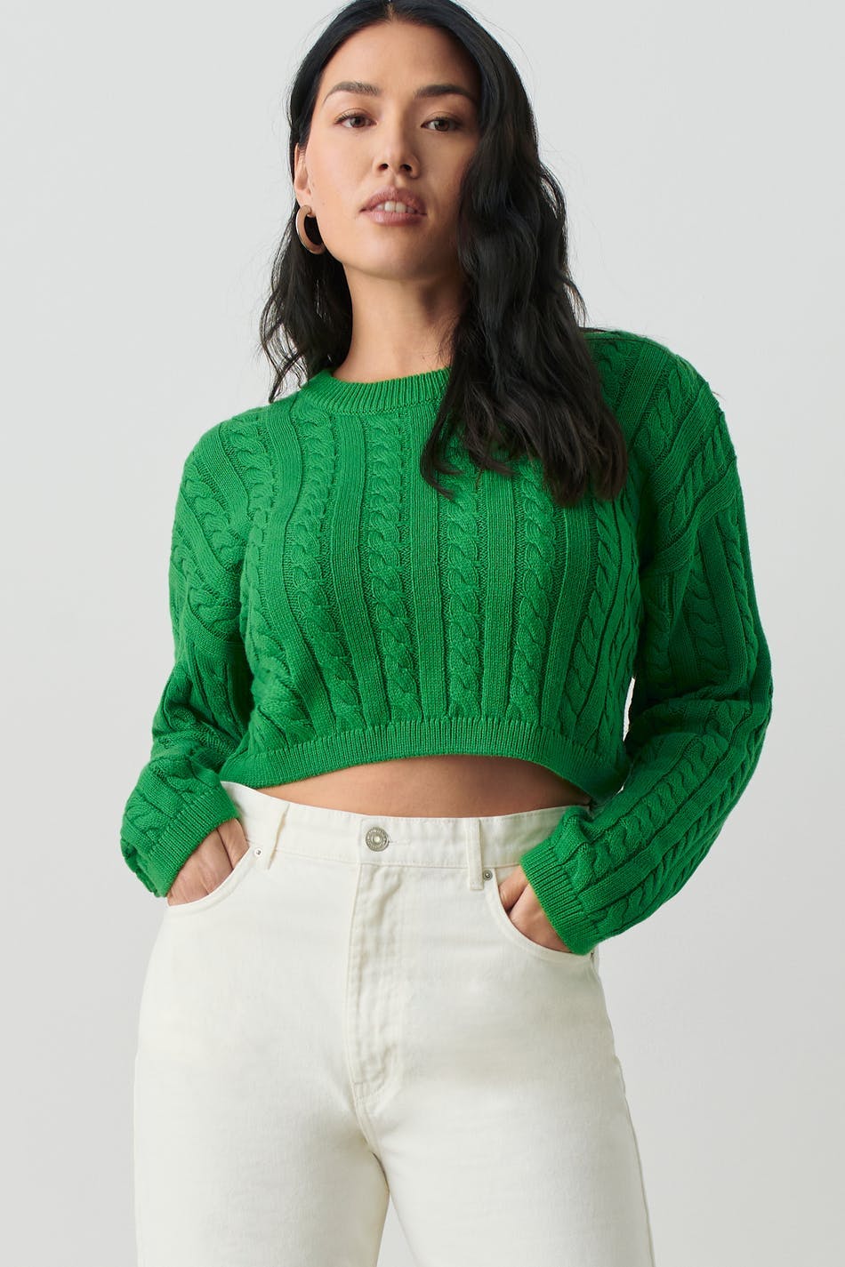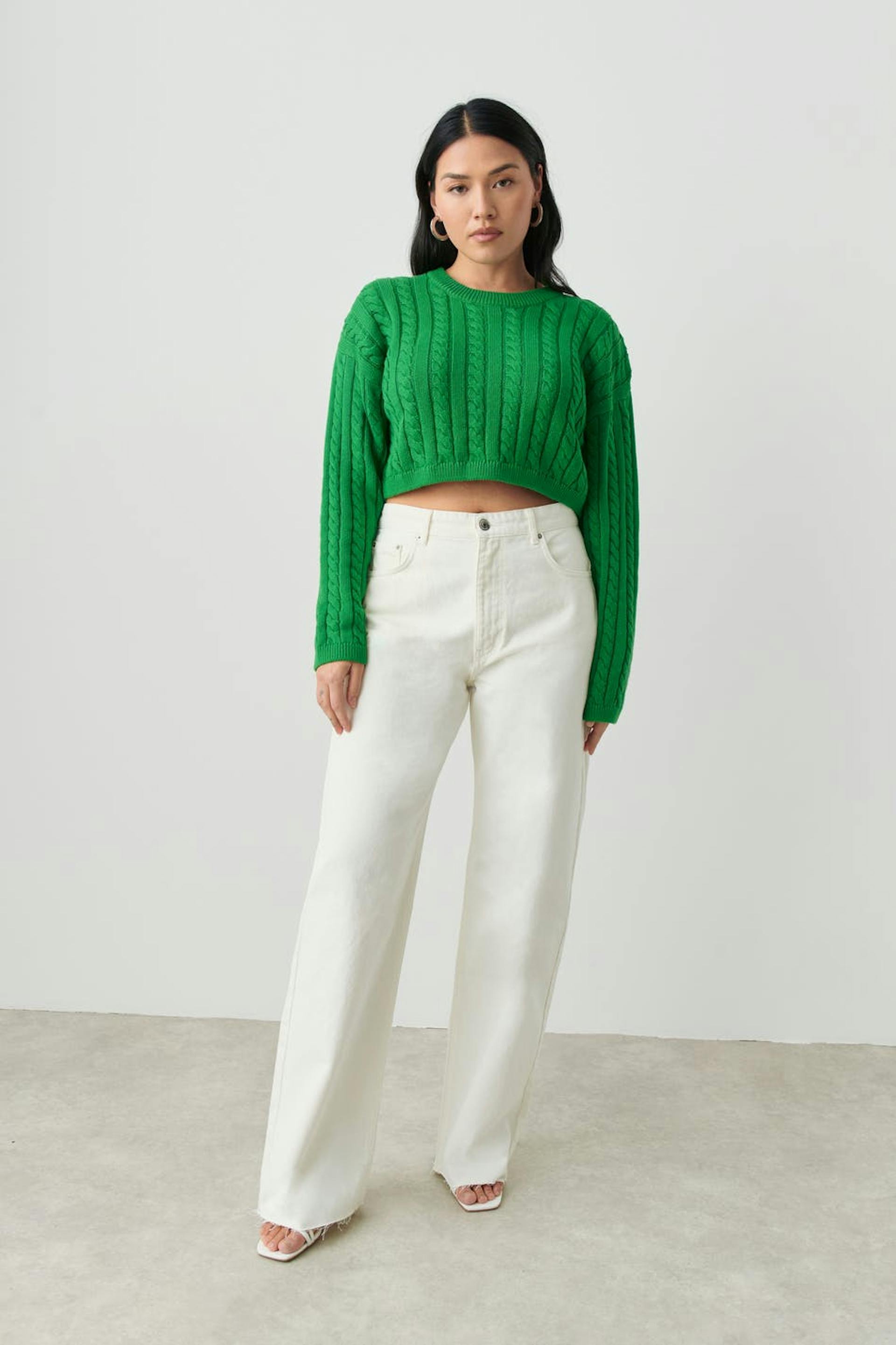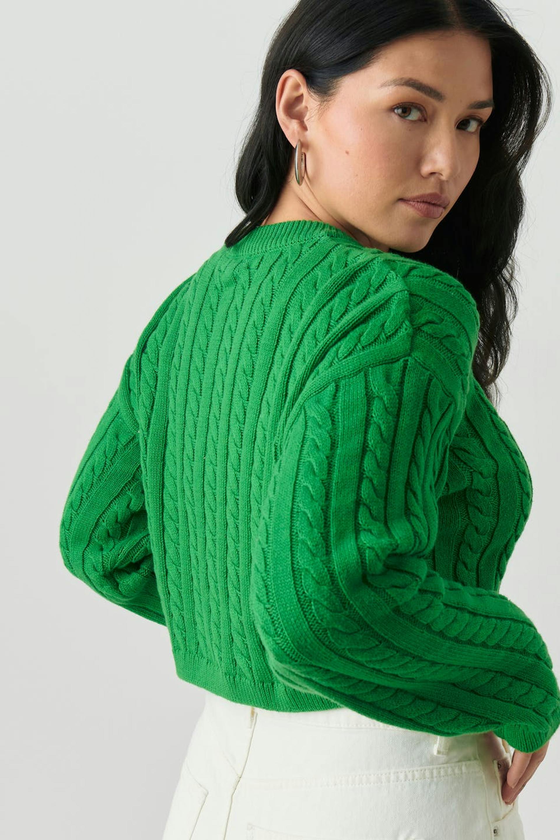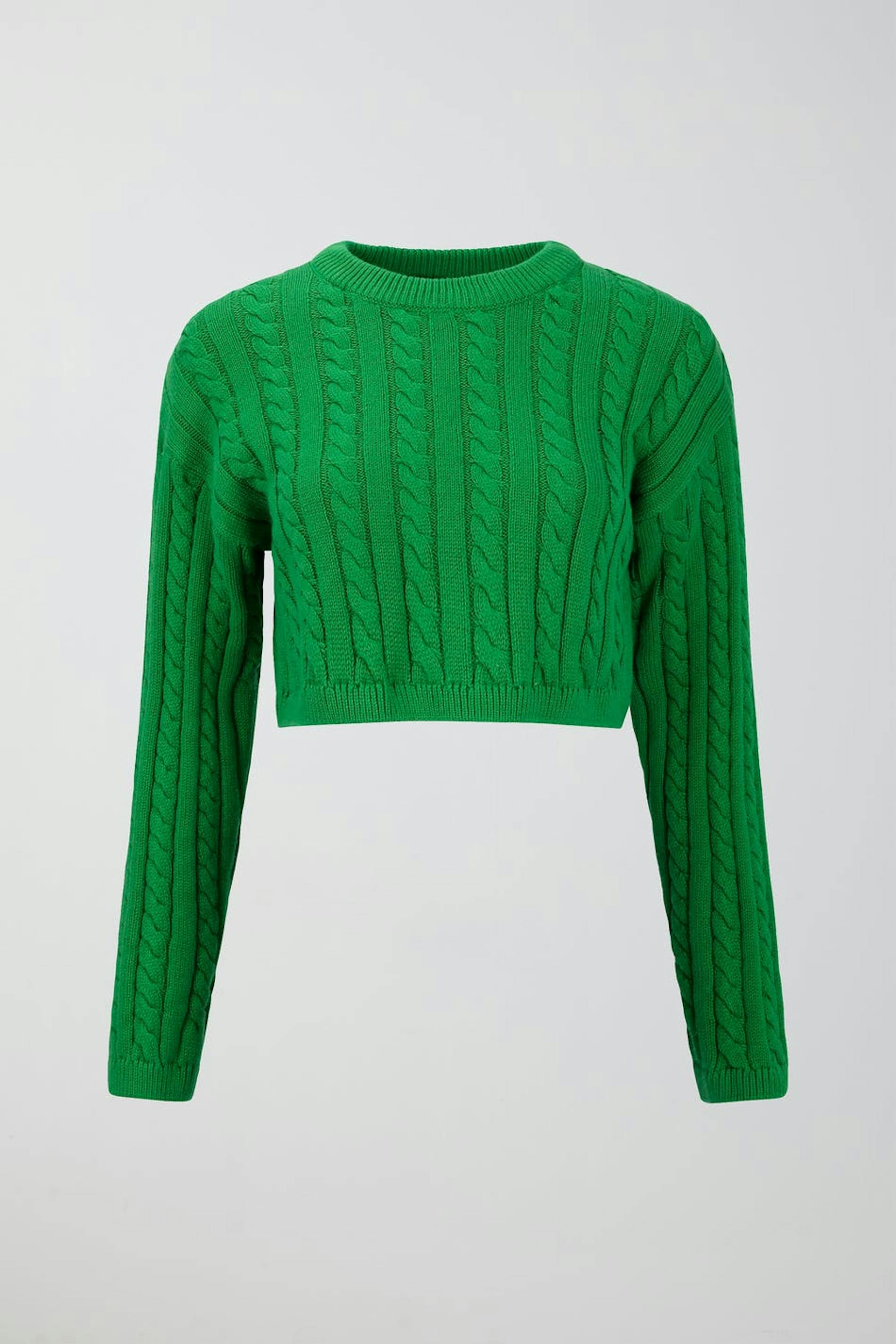 Cable knit jumper with normal fit. The jumper is green, cropped and long-sleeved. It has round neckline and rib-knit hem.