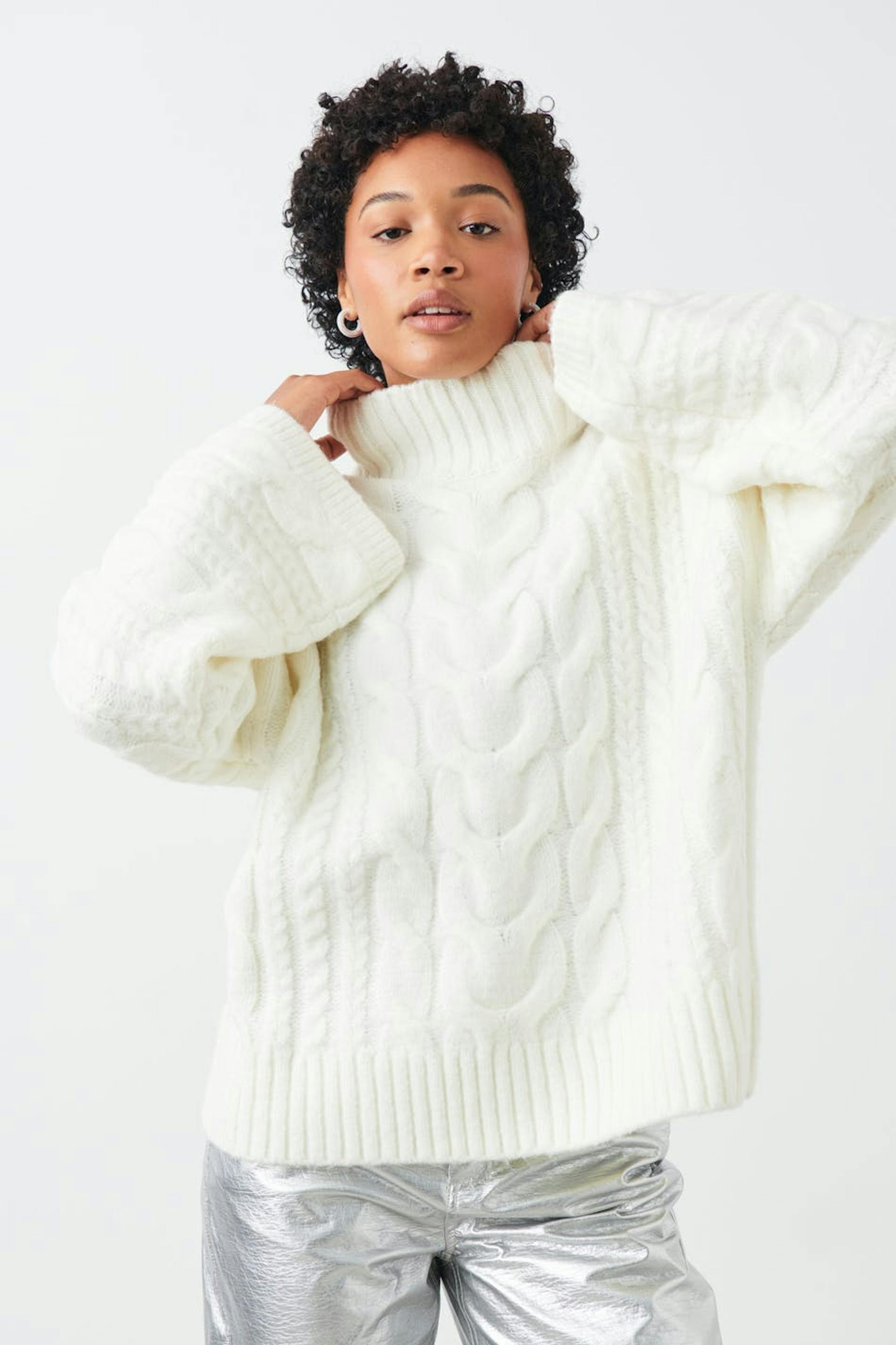 Cable-knit jumper with turtleneck. The jumper is white and has boxy fit. It has straight sleeve and rib knit at sleeve ends and at the bottom.