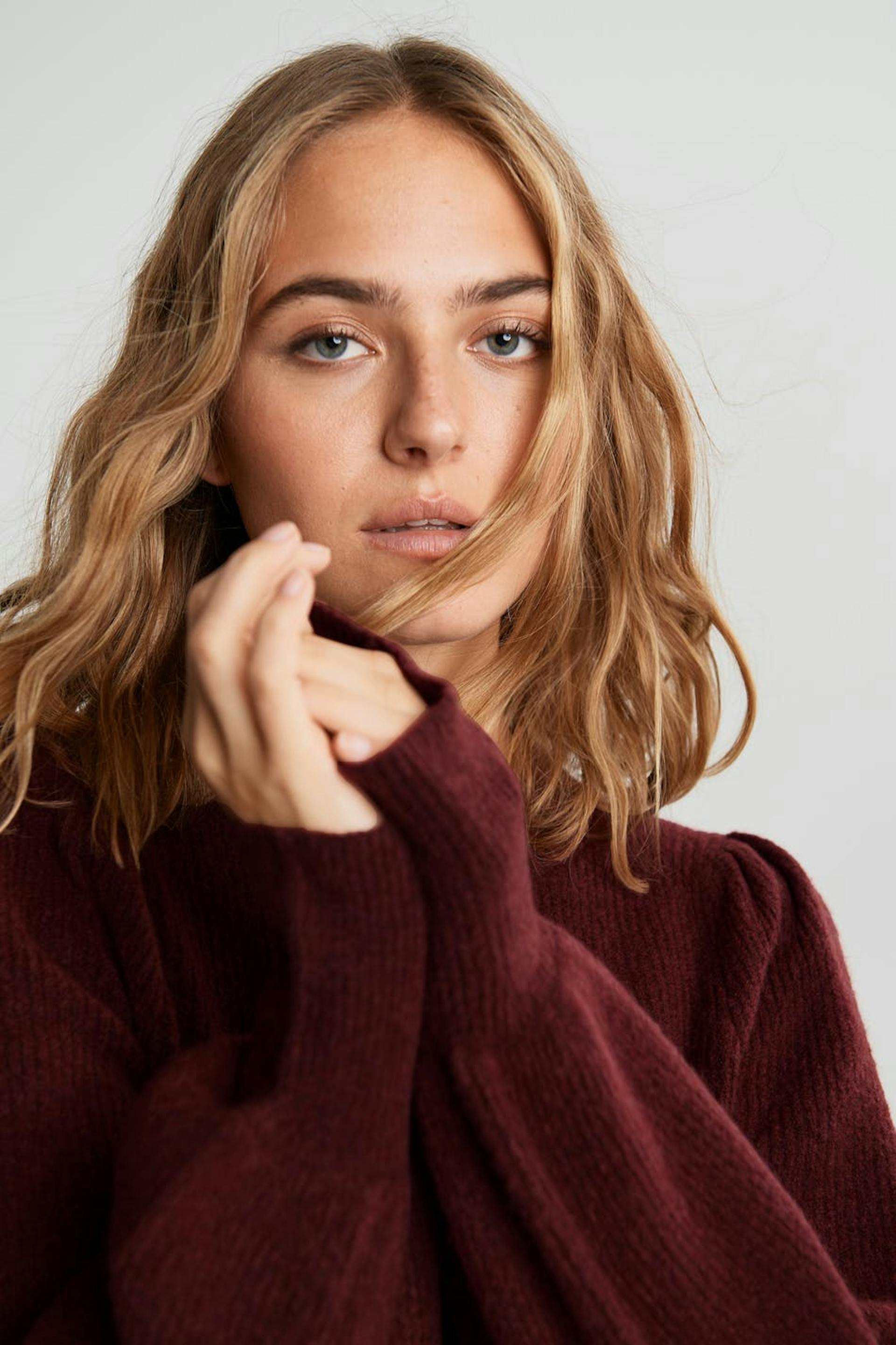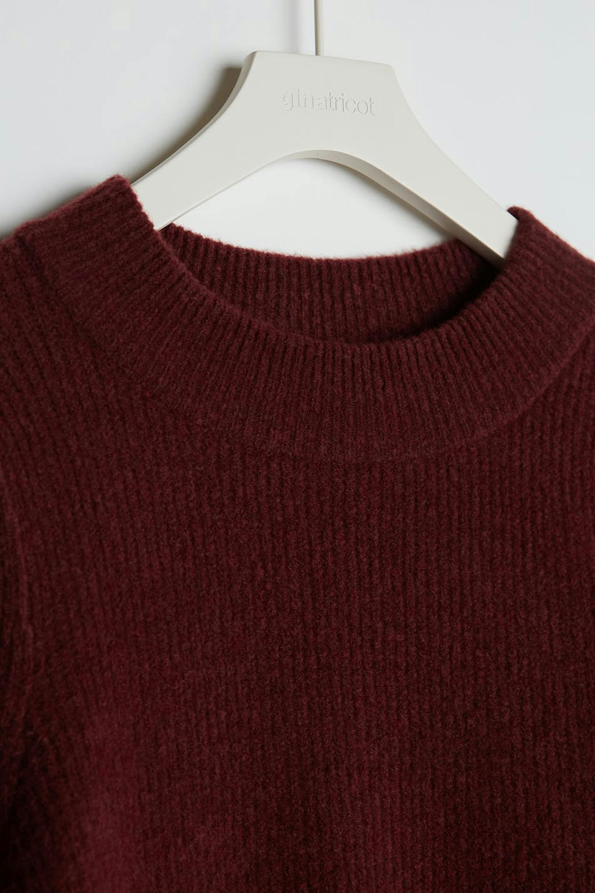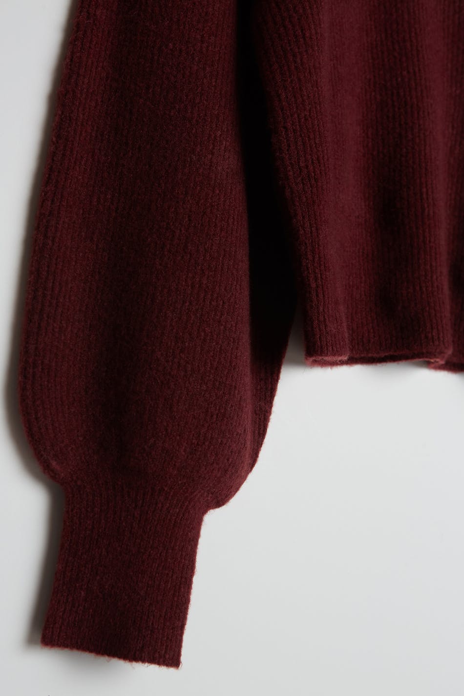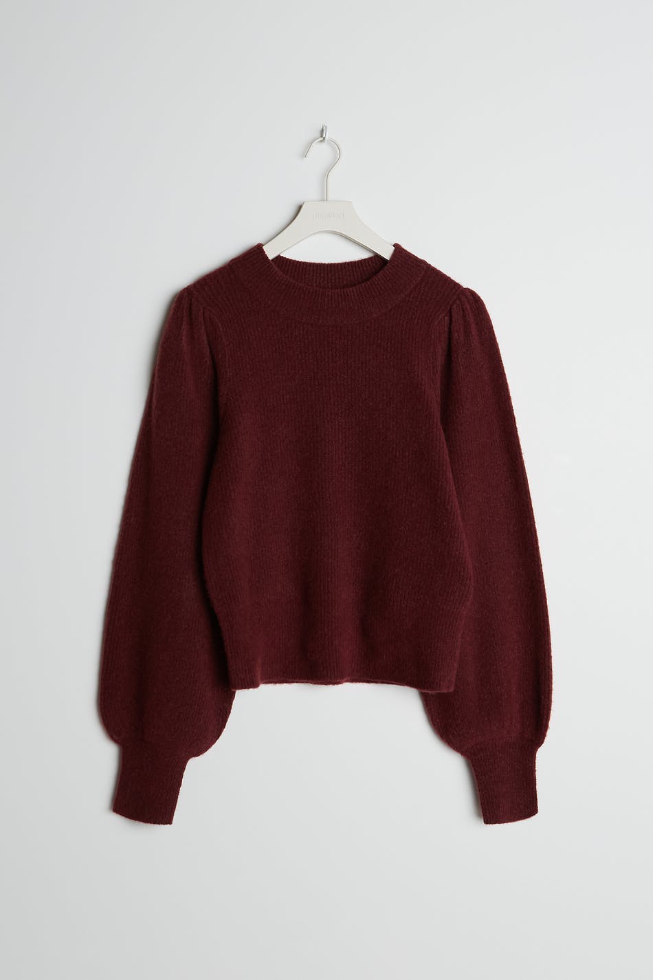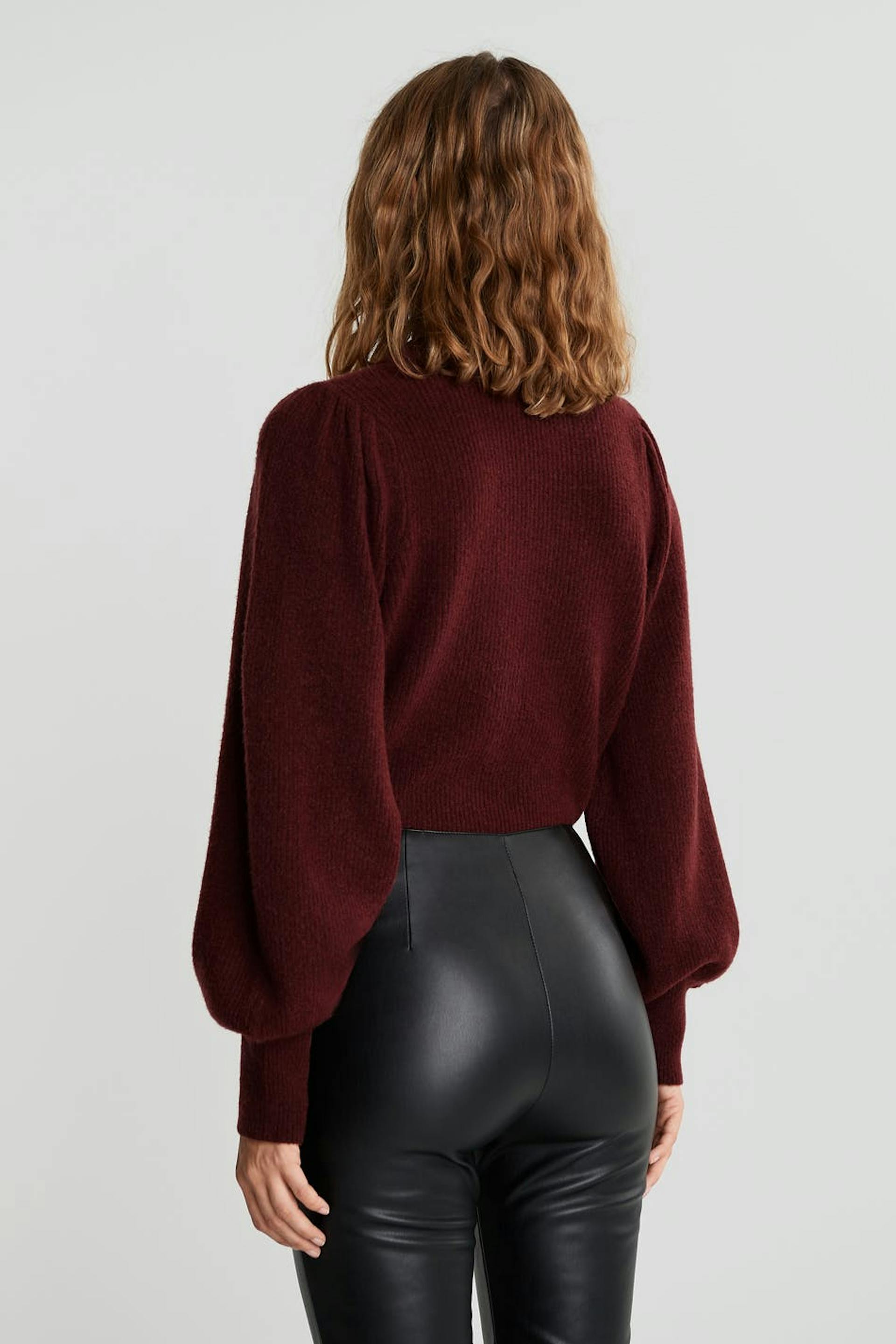 Knitted jumper with puff sleeves with tapering on the sleeve ends. The jumper is red and knitted.