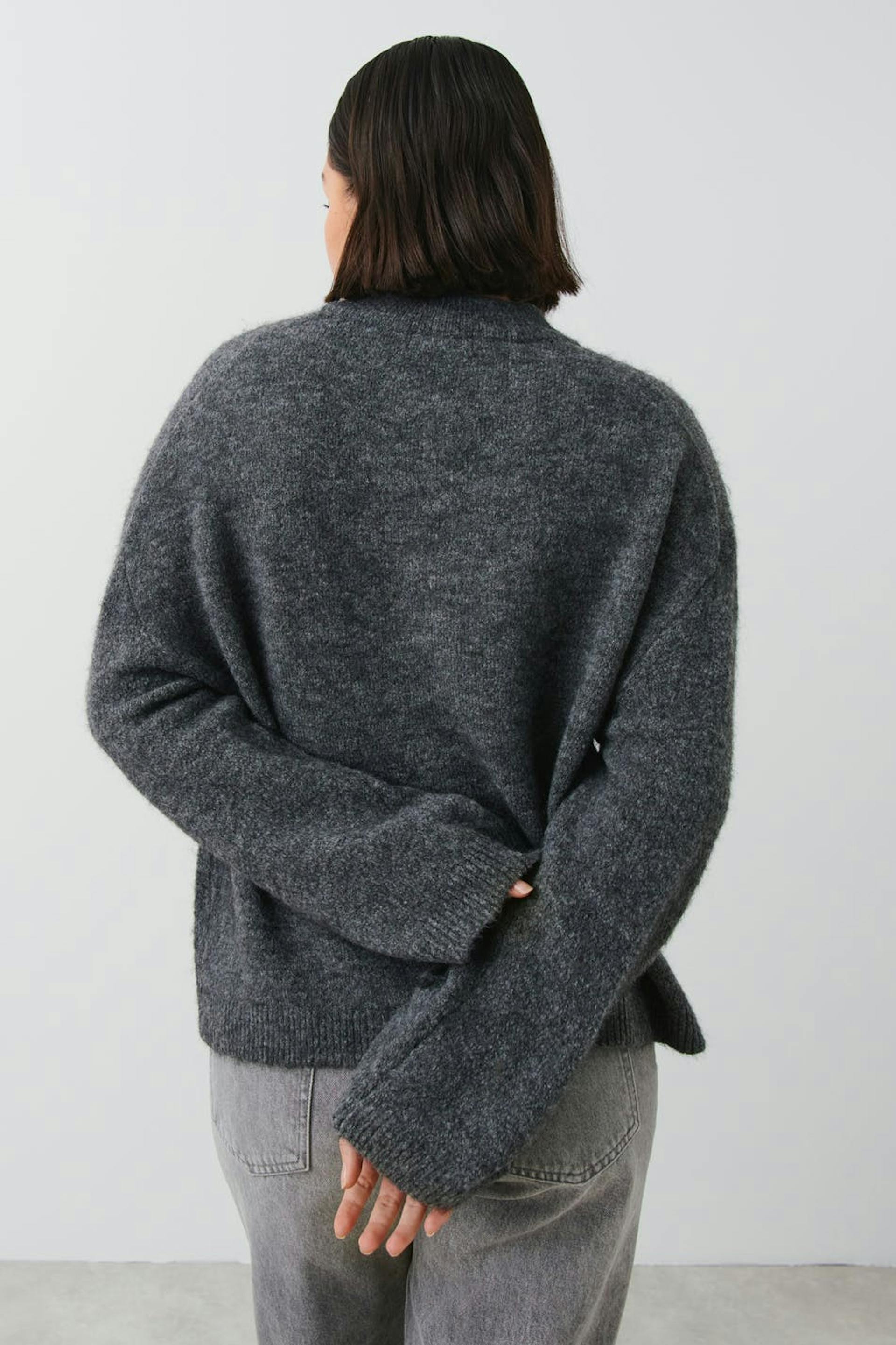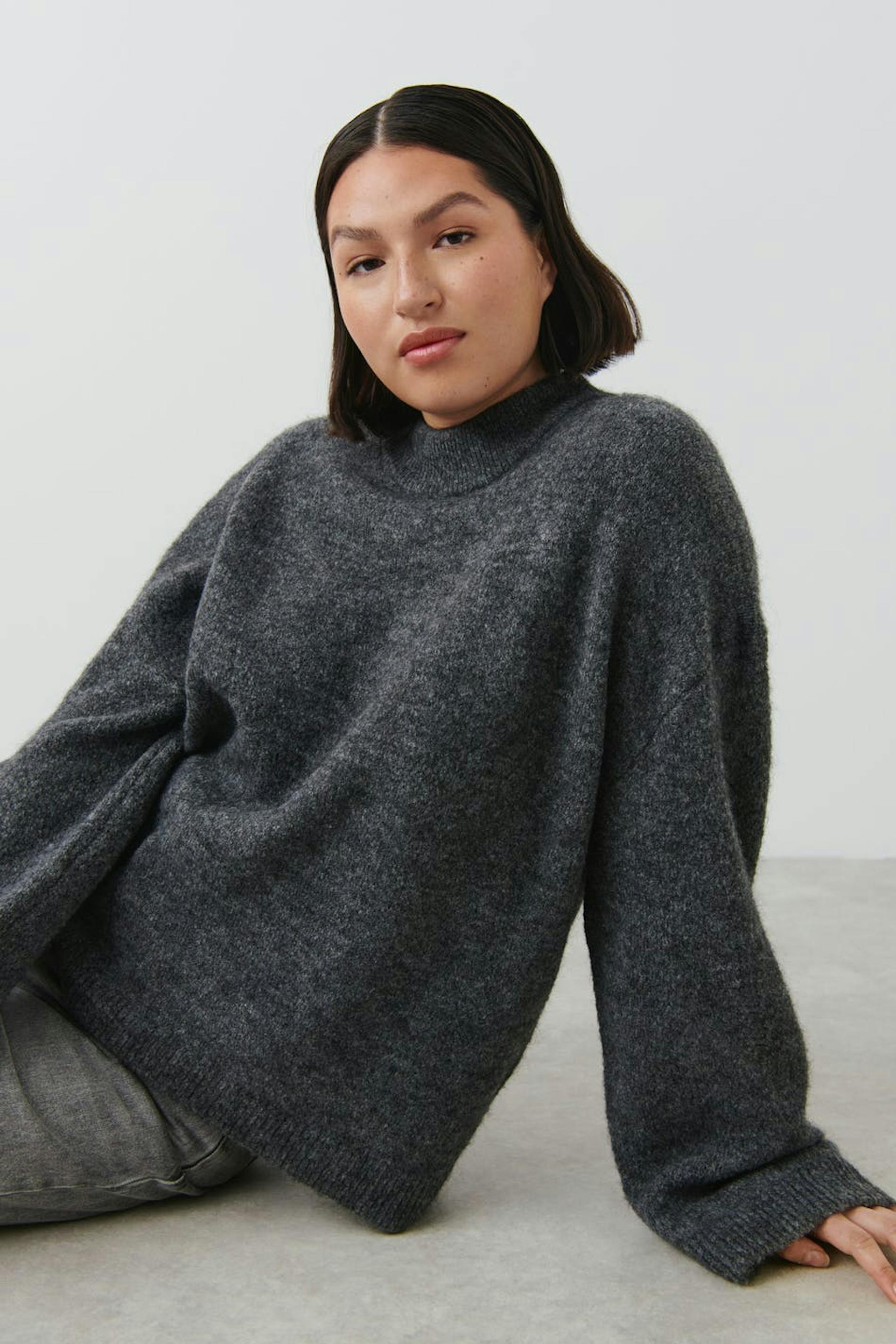Soft knit jumper with boxy fit. The jumper is grey and has round neckline. It has rib knit at sleeve ends and at the bottom.