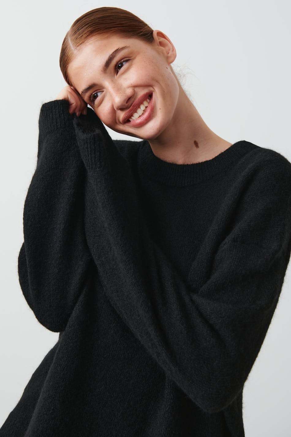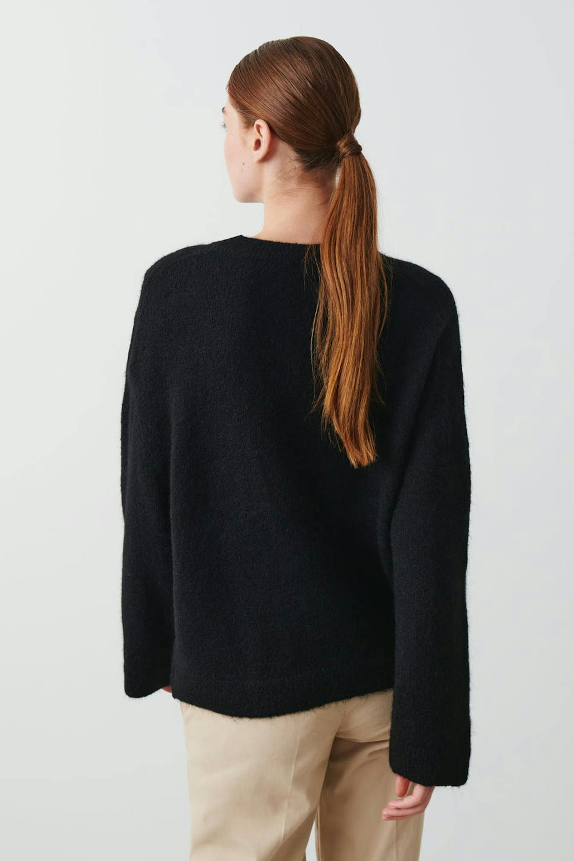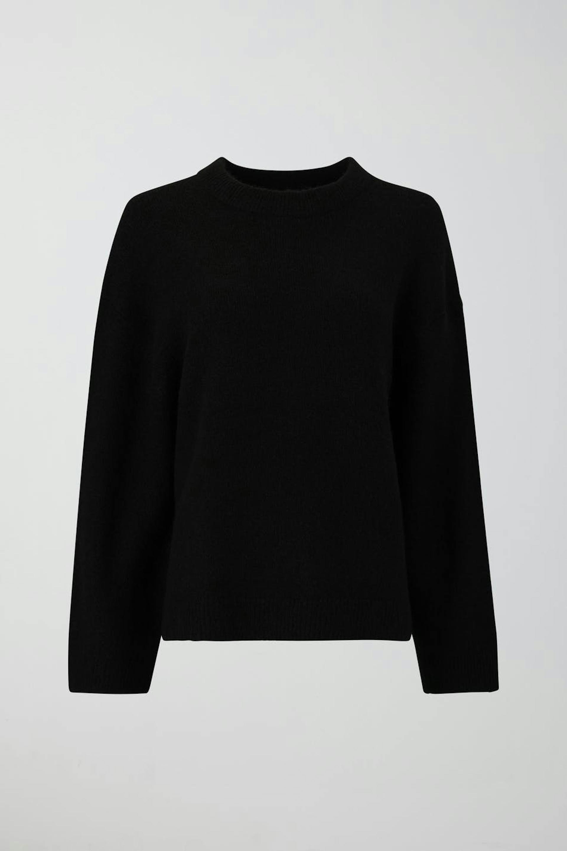 Soft knit jumper in mohair blend with boxy fit. The jumper is black and has round neckline. It has rib knit at sleeve ends and at the bottom.