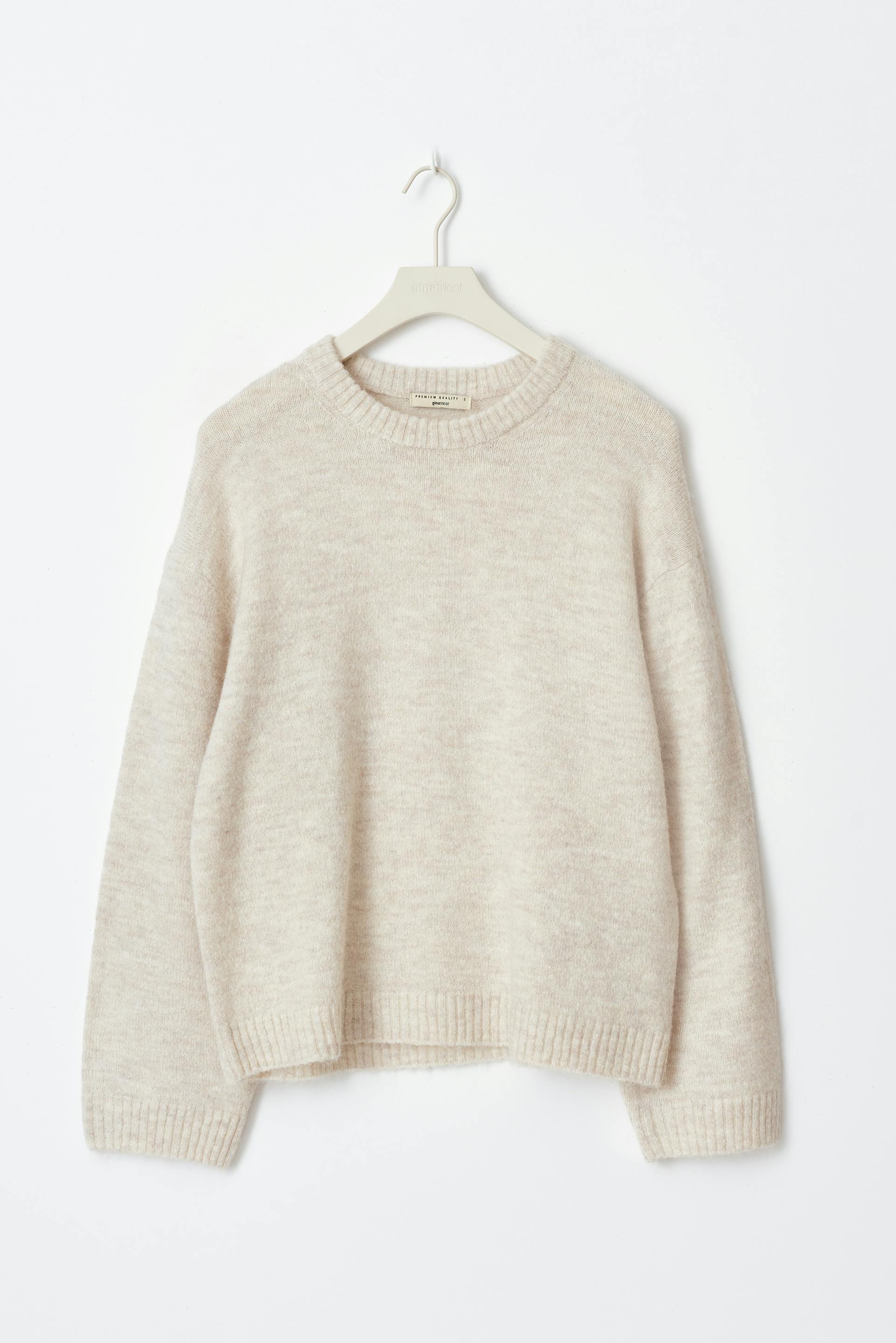 Knitted sweater with crew neckline. The sweat is white and has oversize fit. It has balloon sleeve, regular length and rib knit at sleeve ends and at the bottom.