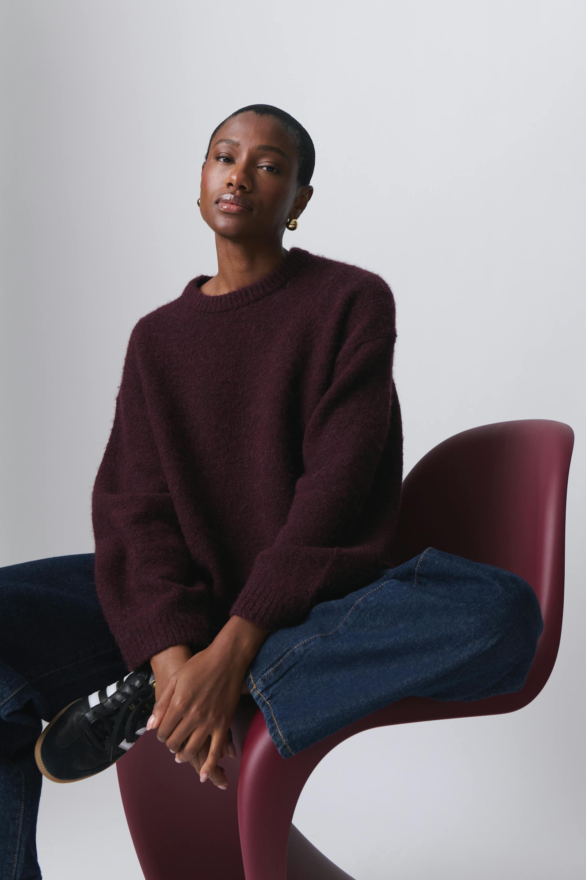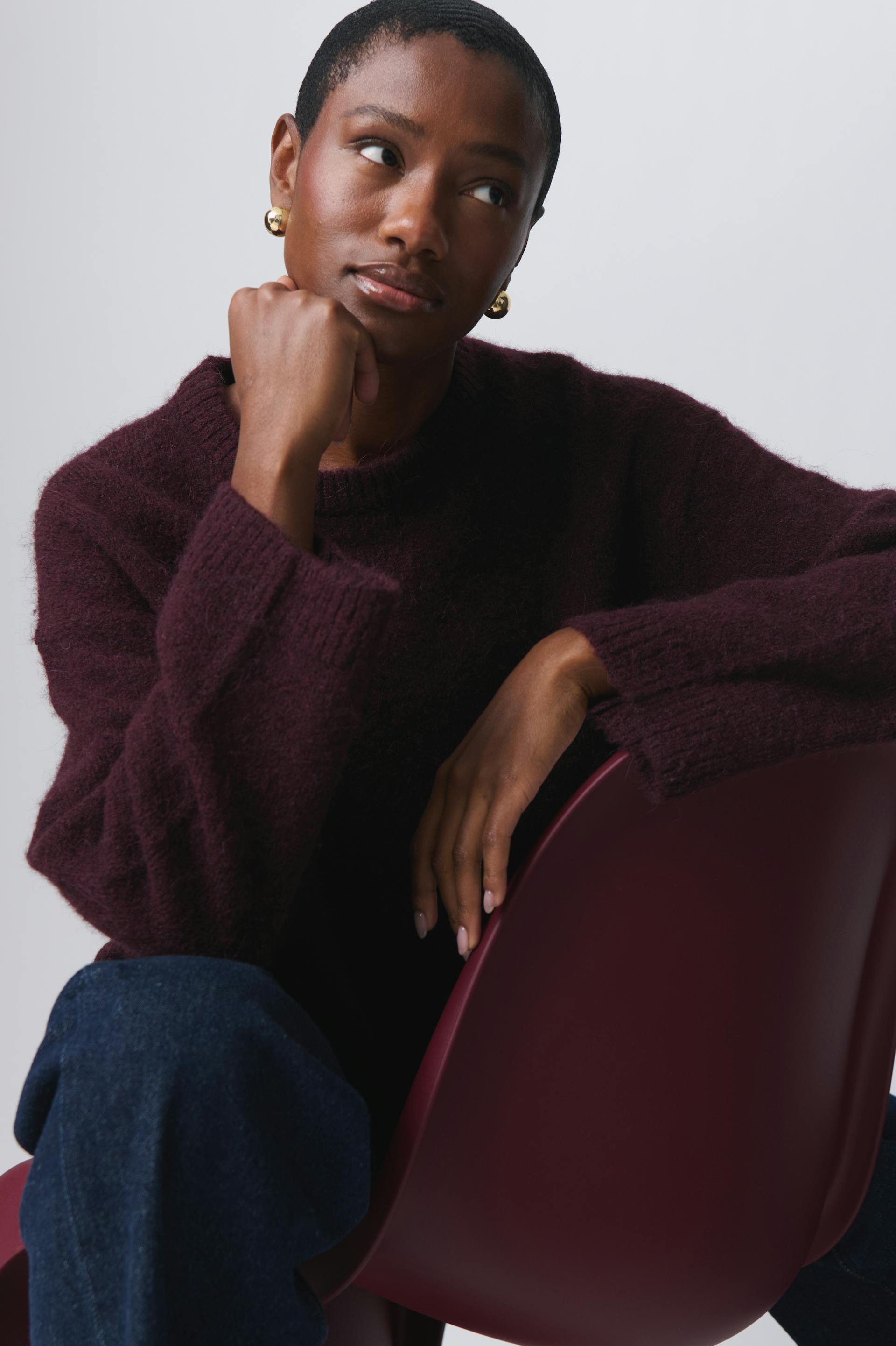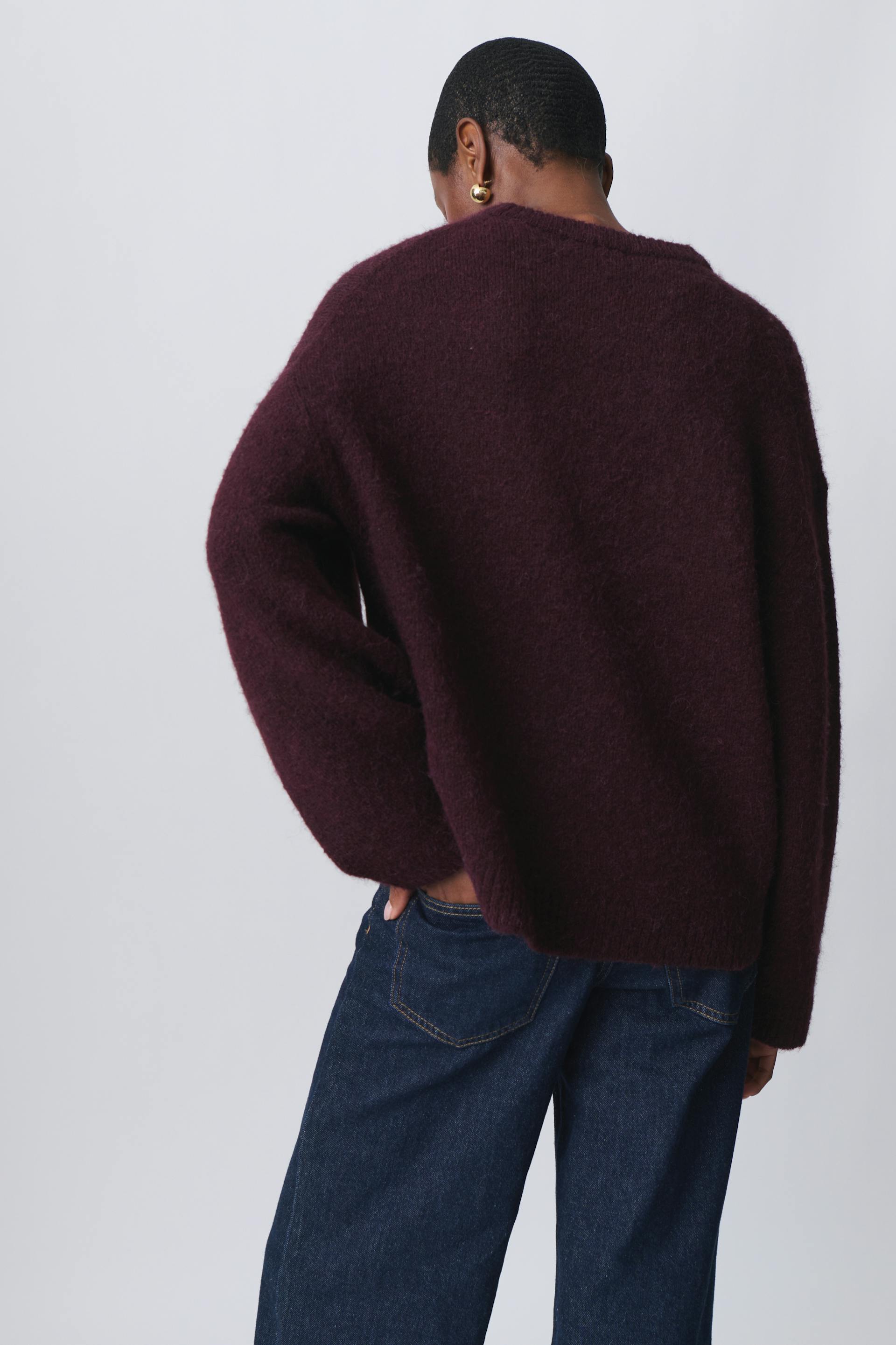 Knitted sweater with crew neckline. The sweat is maroon and has oversize fit. It has balloon sleeve, regular length and rib knit at sleeve ends and at the bottom.