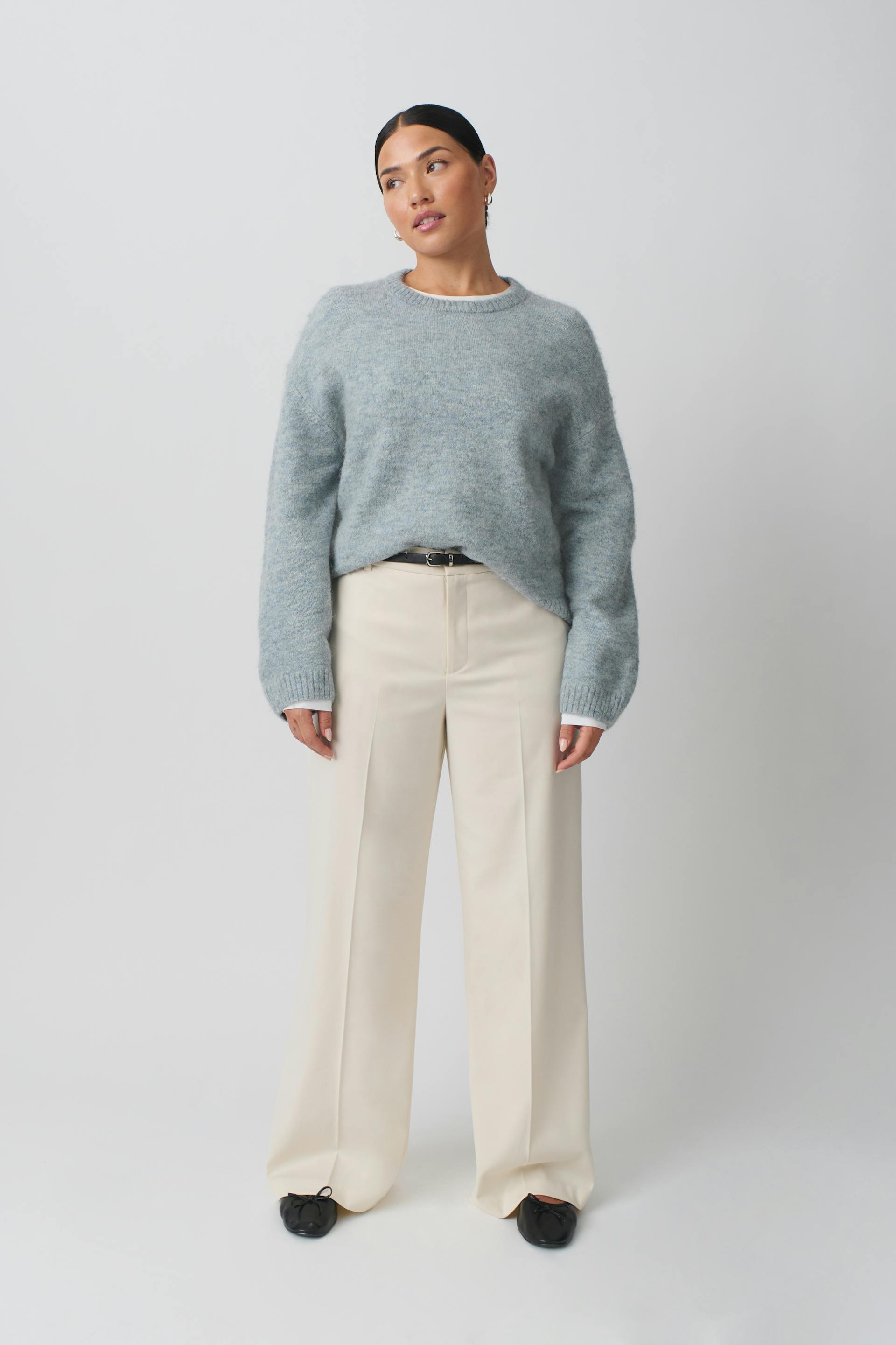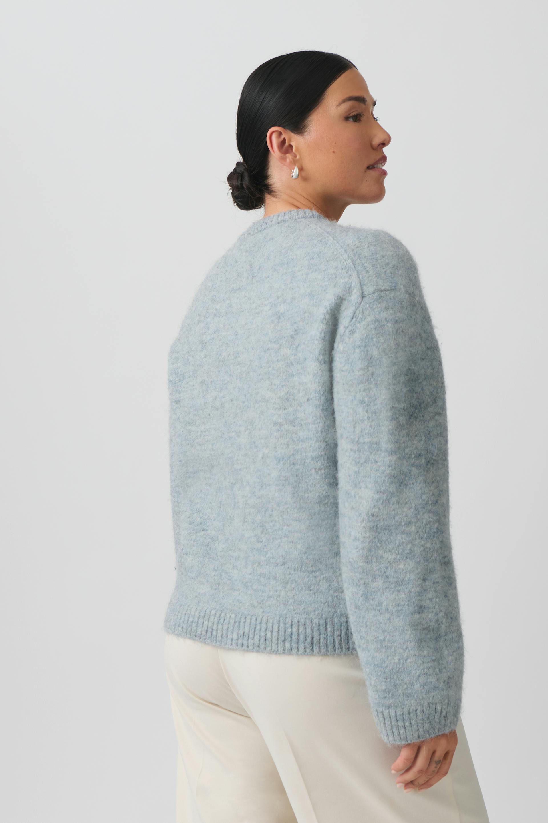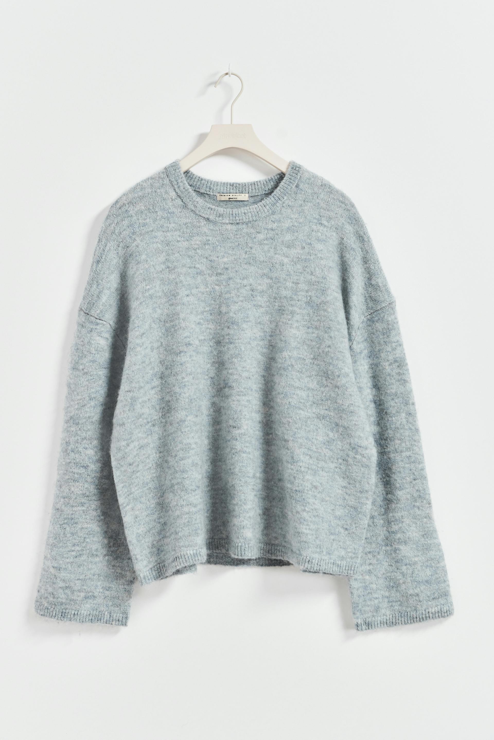 Knitted sweater with crew neckline. The sweat is blue and has oversize fit. It has balloon sleeve, regular length and rib knit at sleeve ends and at the bottom.