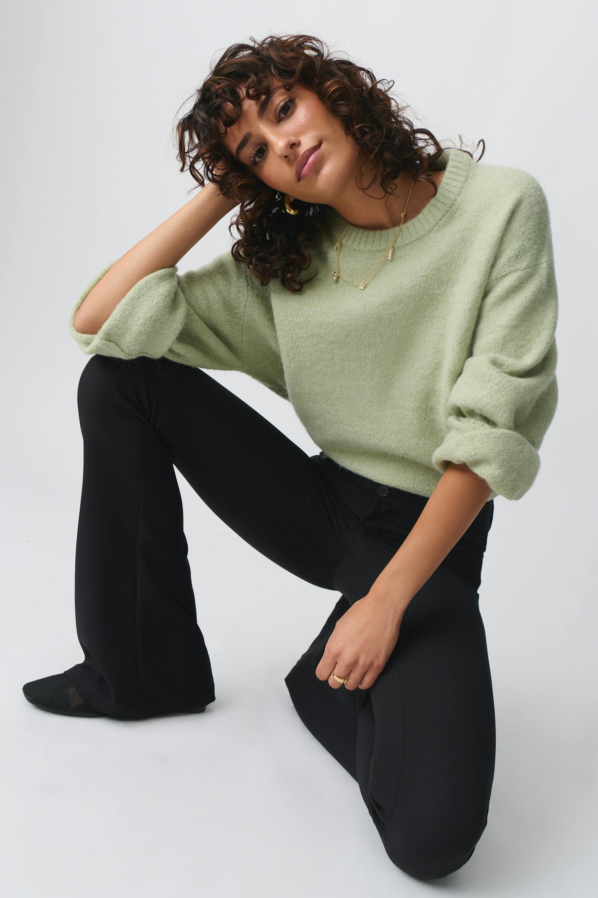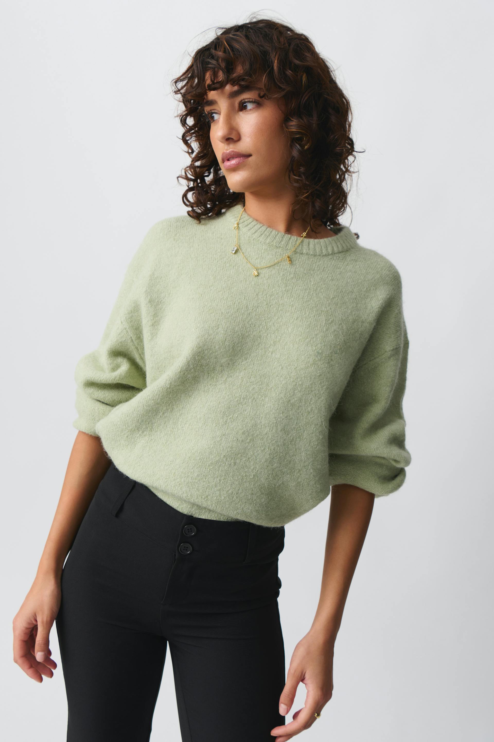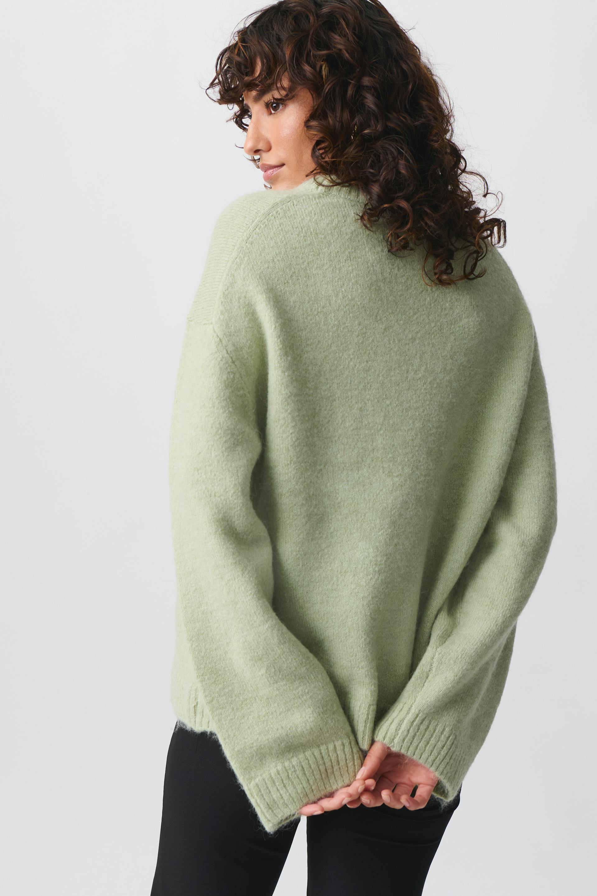 Knitted sweater with crew neckline. The sweat is green and has oversize fit. It has balloon sleeve, regular length and rib knit at sleeve ends and at the bottom.