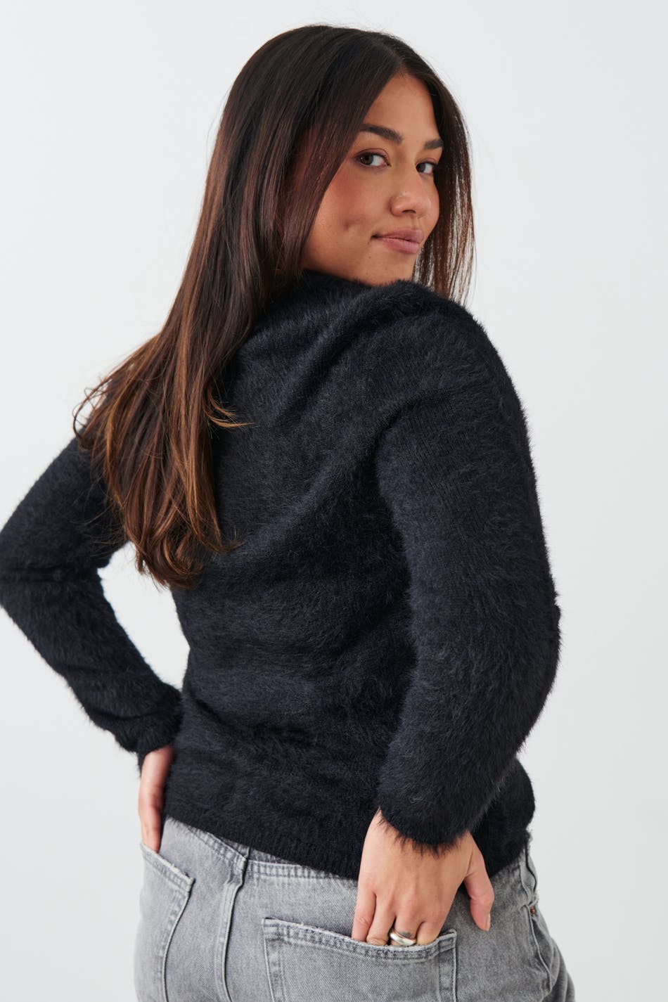 Knitted sweater with heart shaped cut-out detail at the front. The sweat is black and has fluffy quality. It has figure-hugging fit, long sleeve and high neckline.