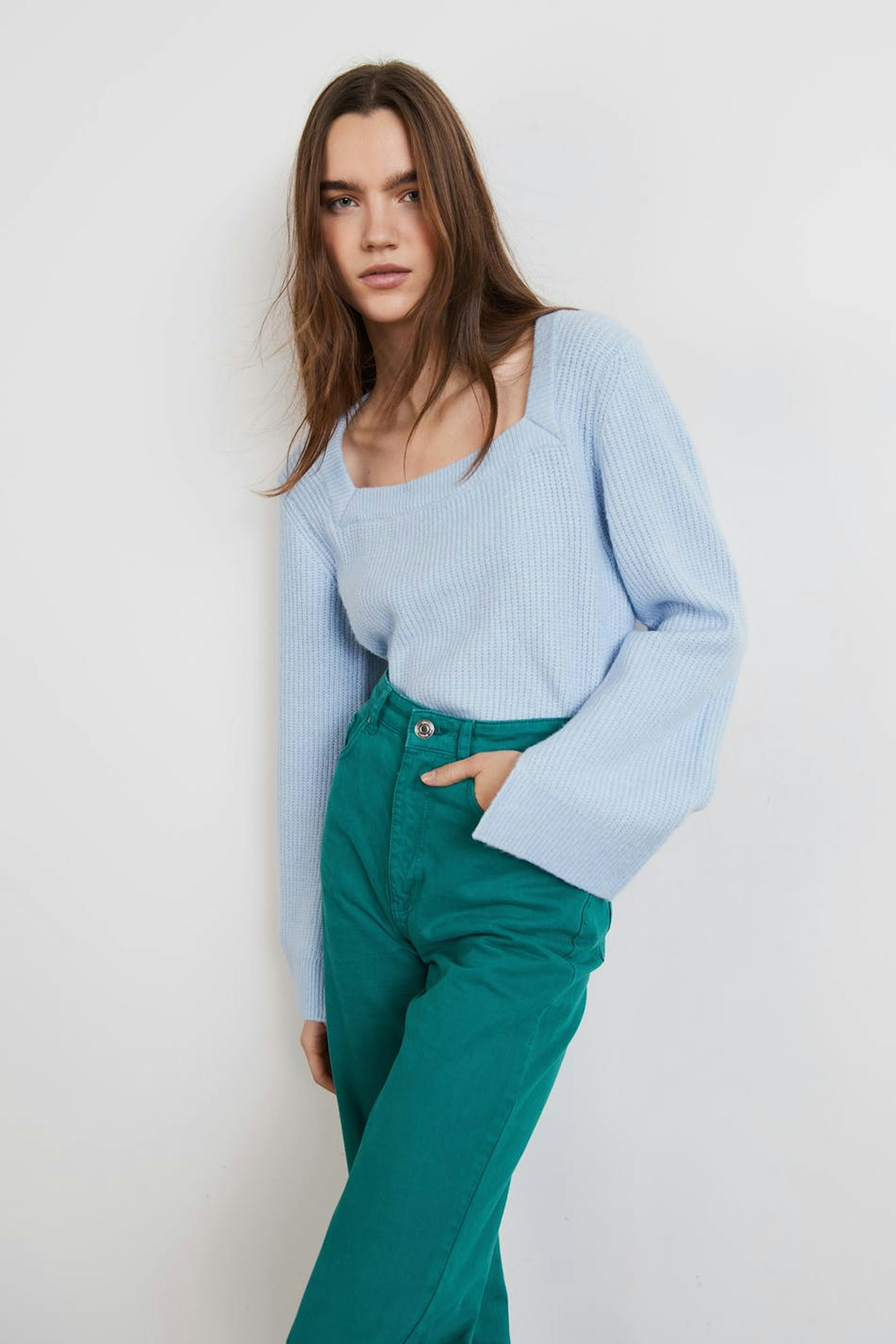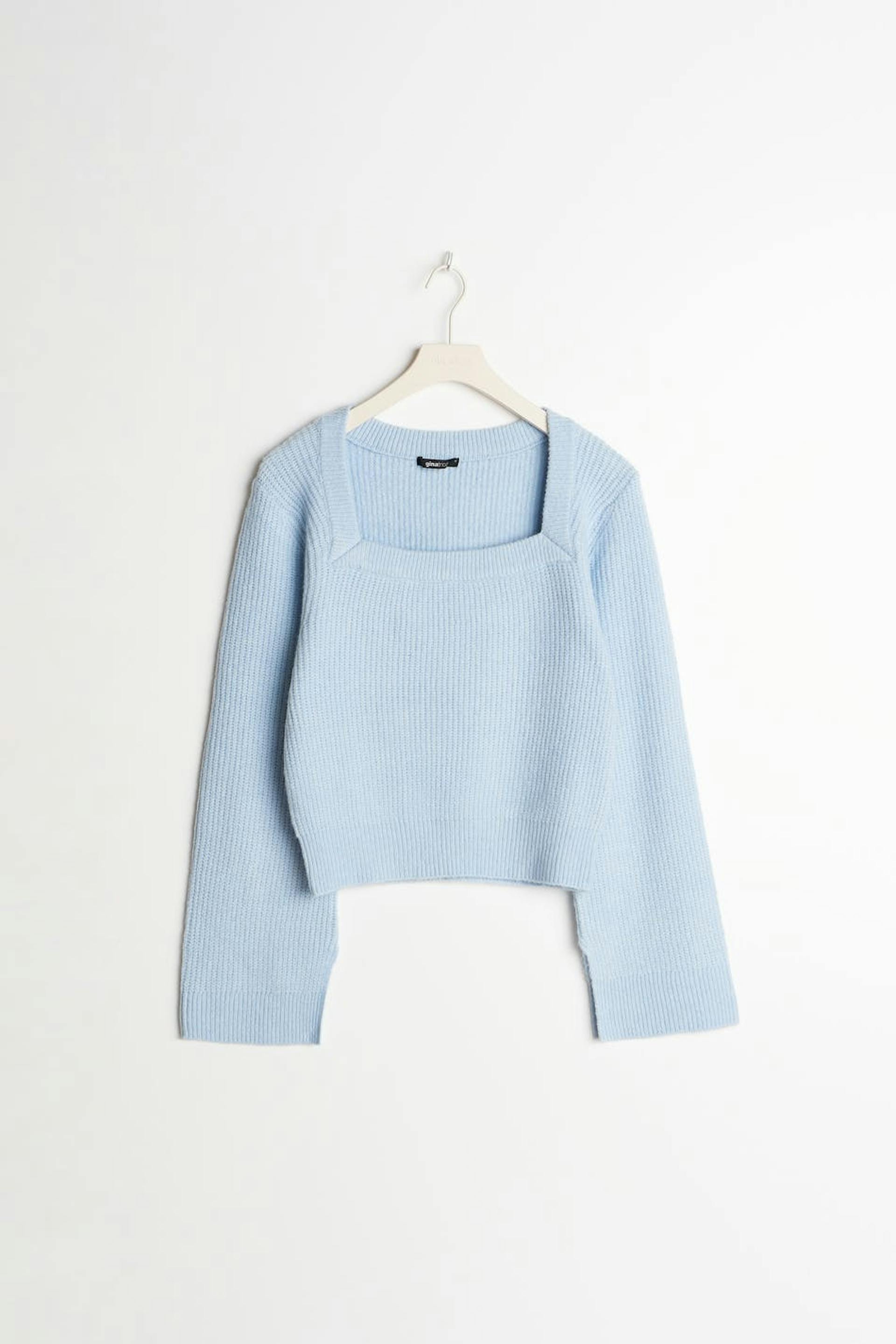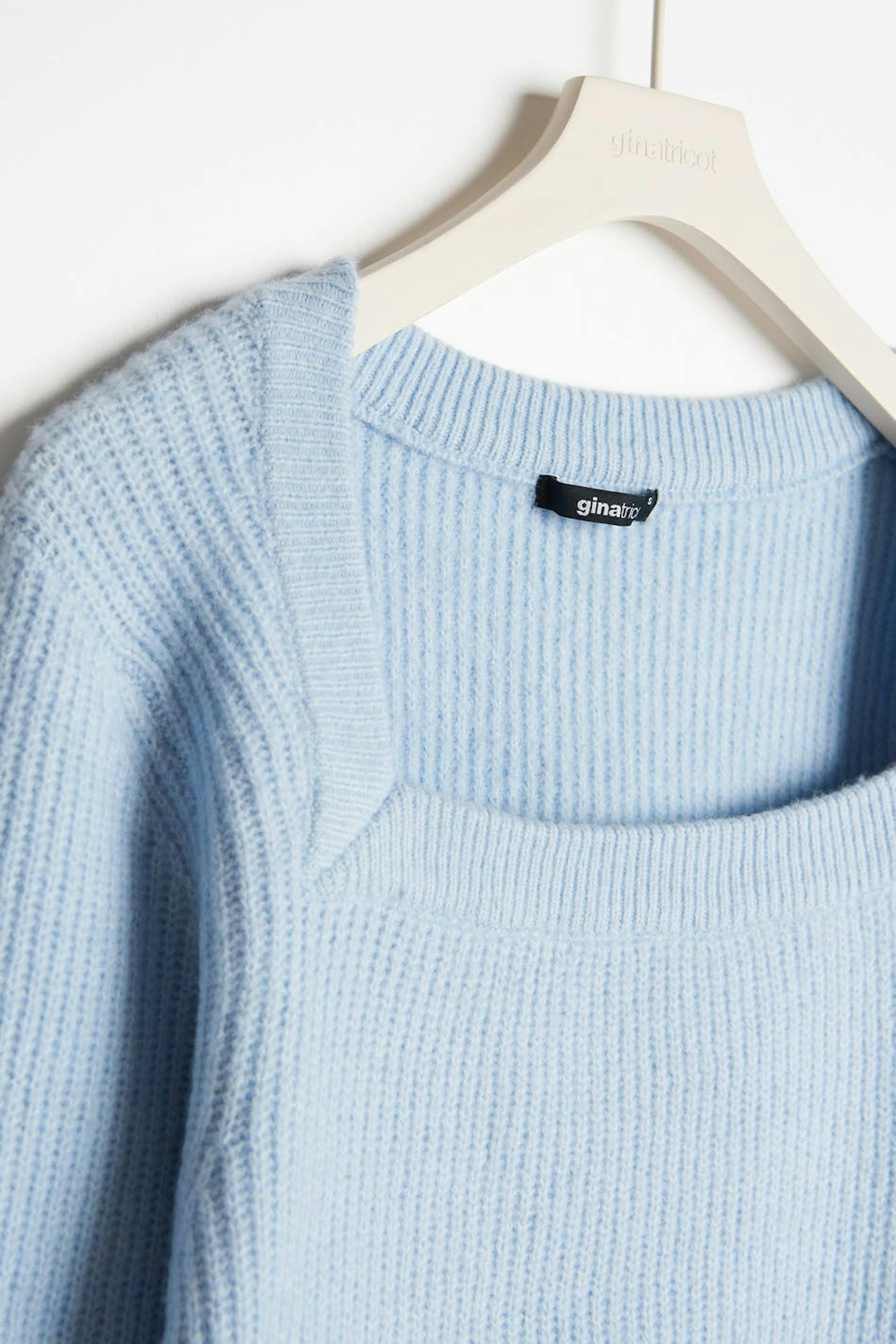 Knitted jumper with square neckline. The jumper is blue and has wide sleeves with slit.