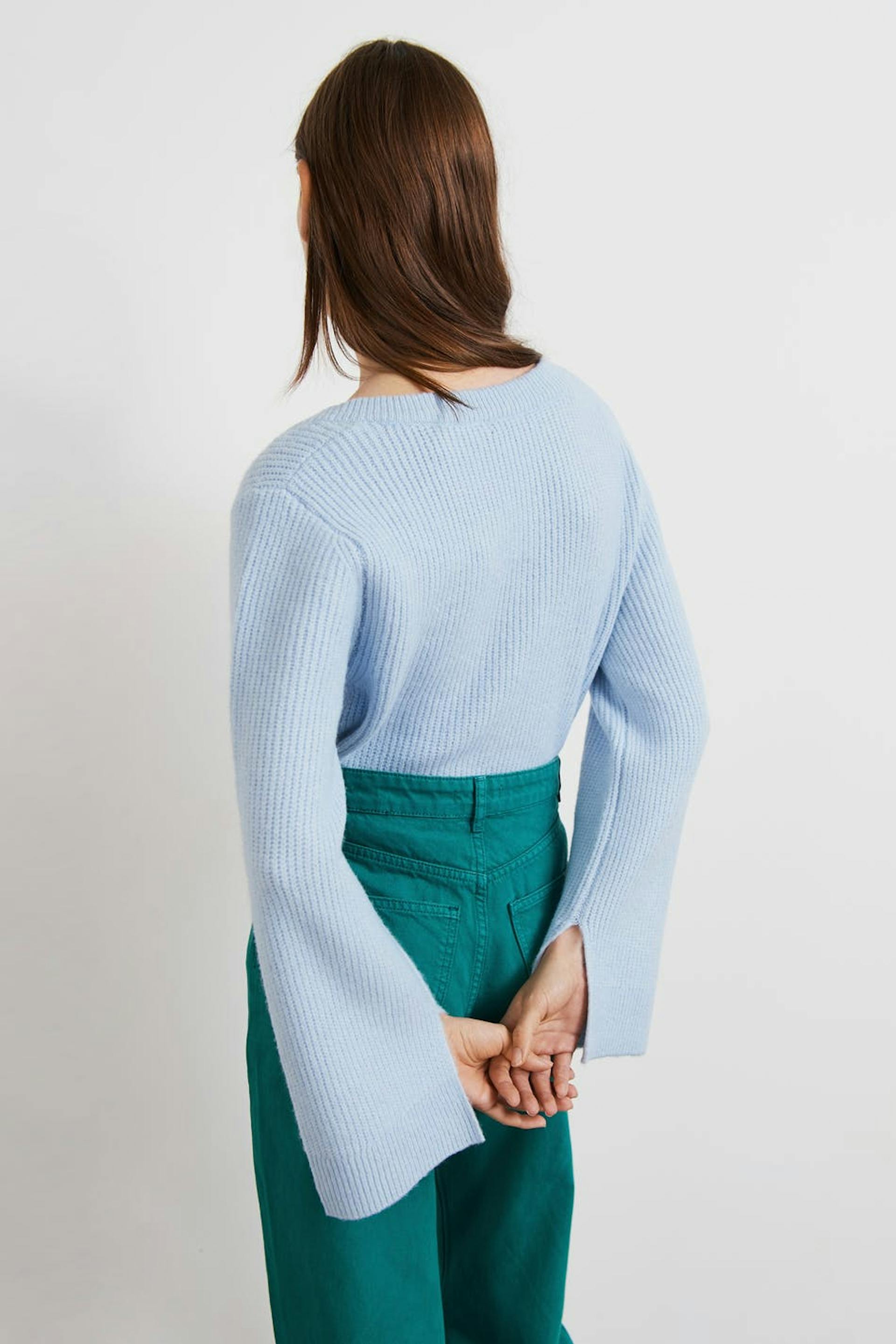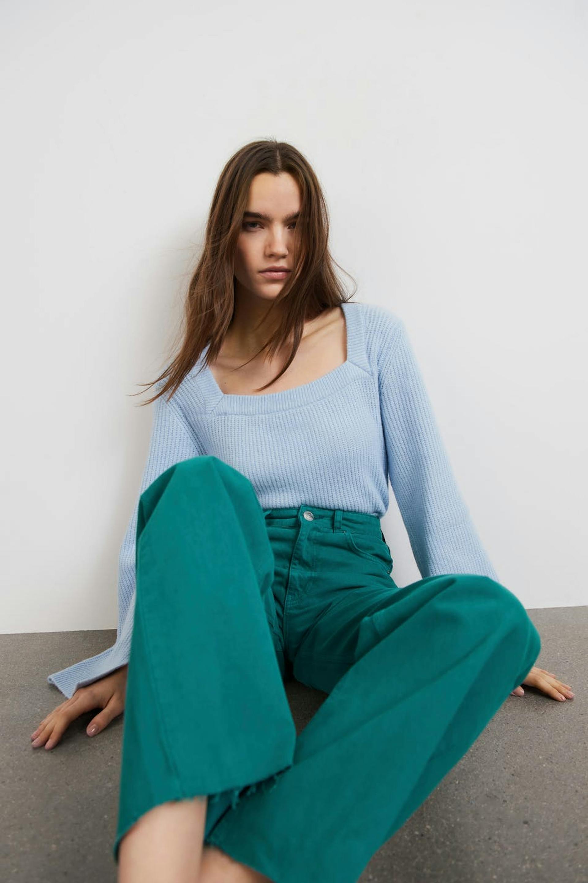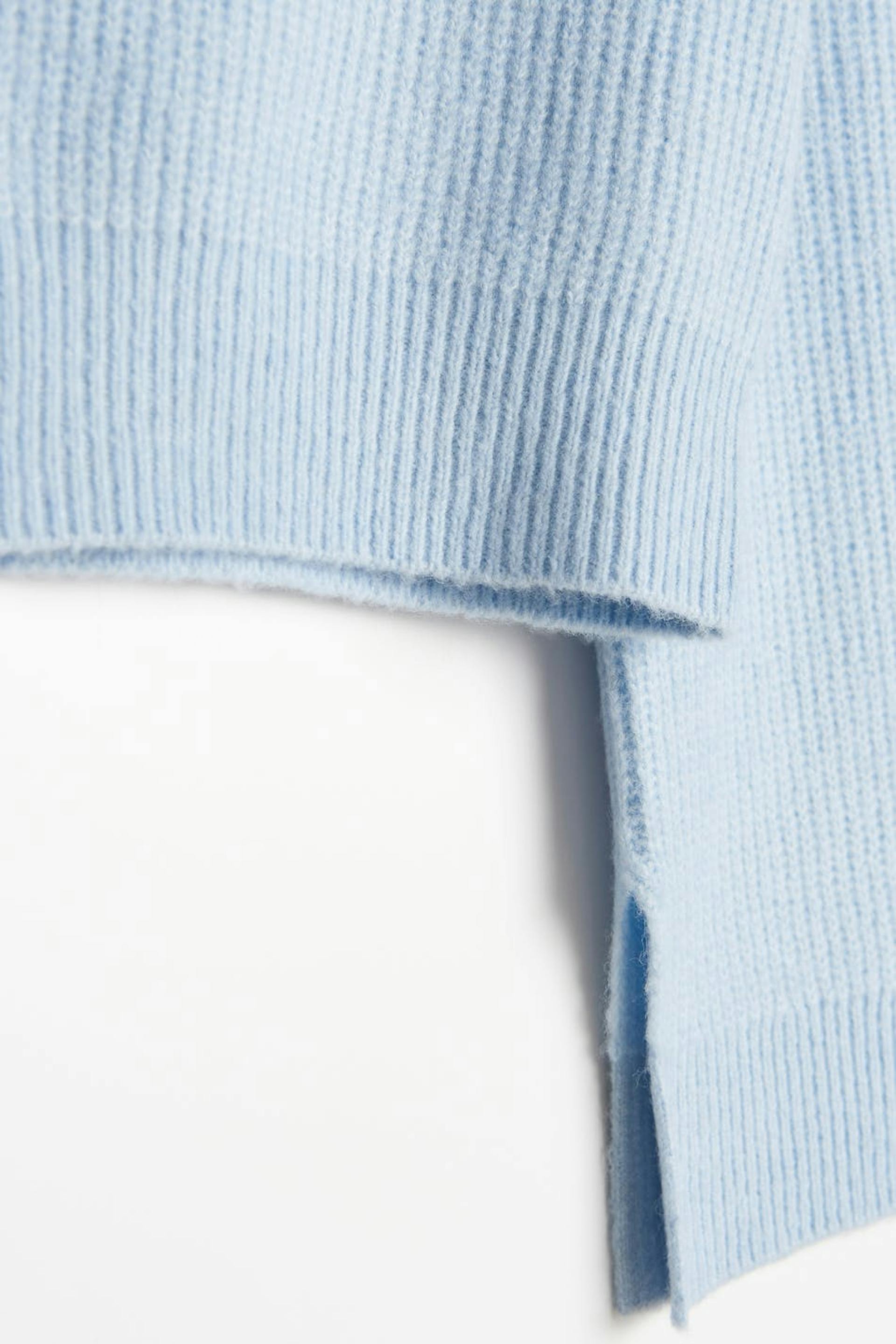 Knitted jumper with square neckline. The jumper is blue and has wide sleeves with slit.