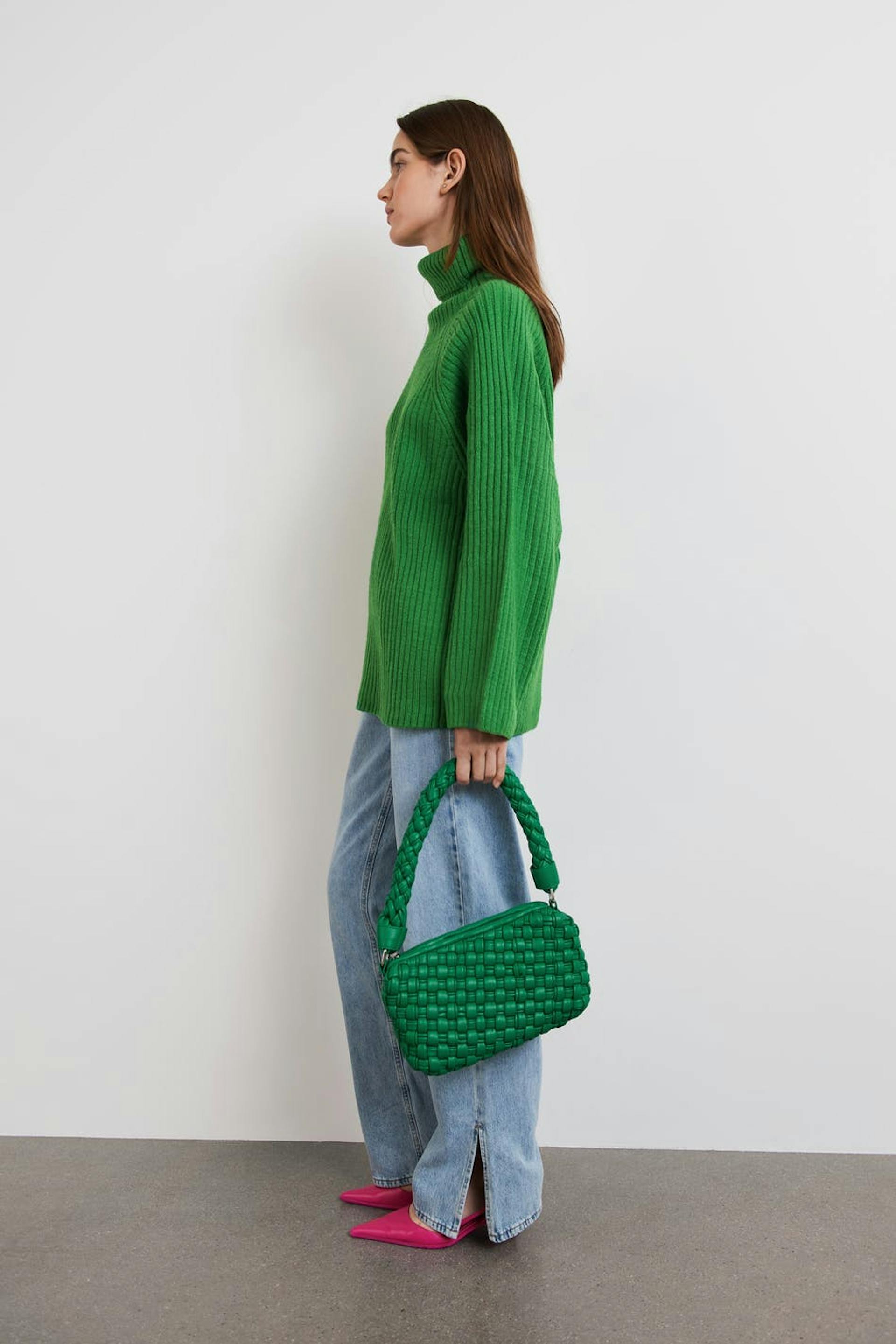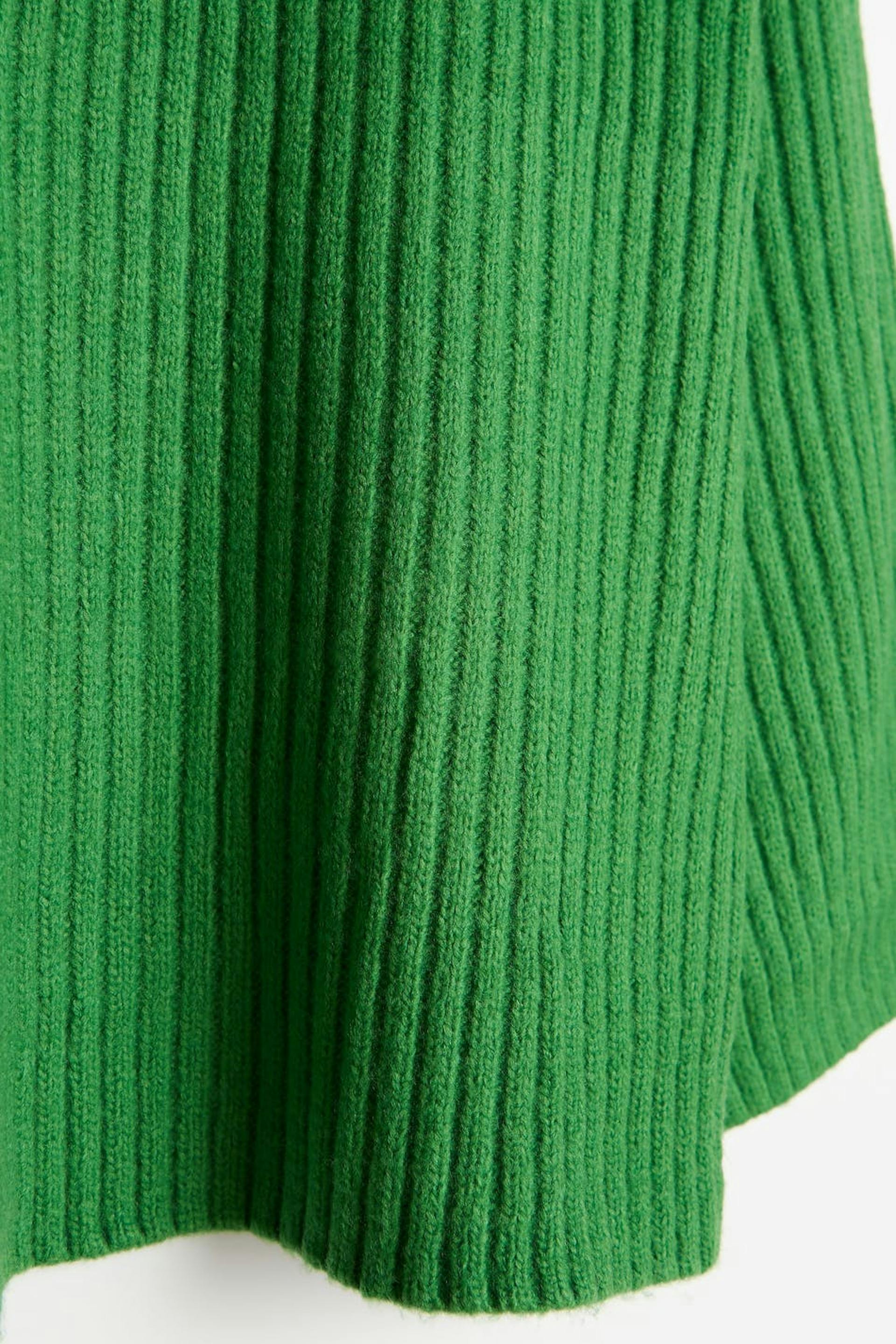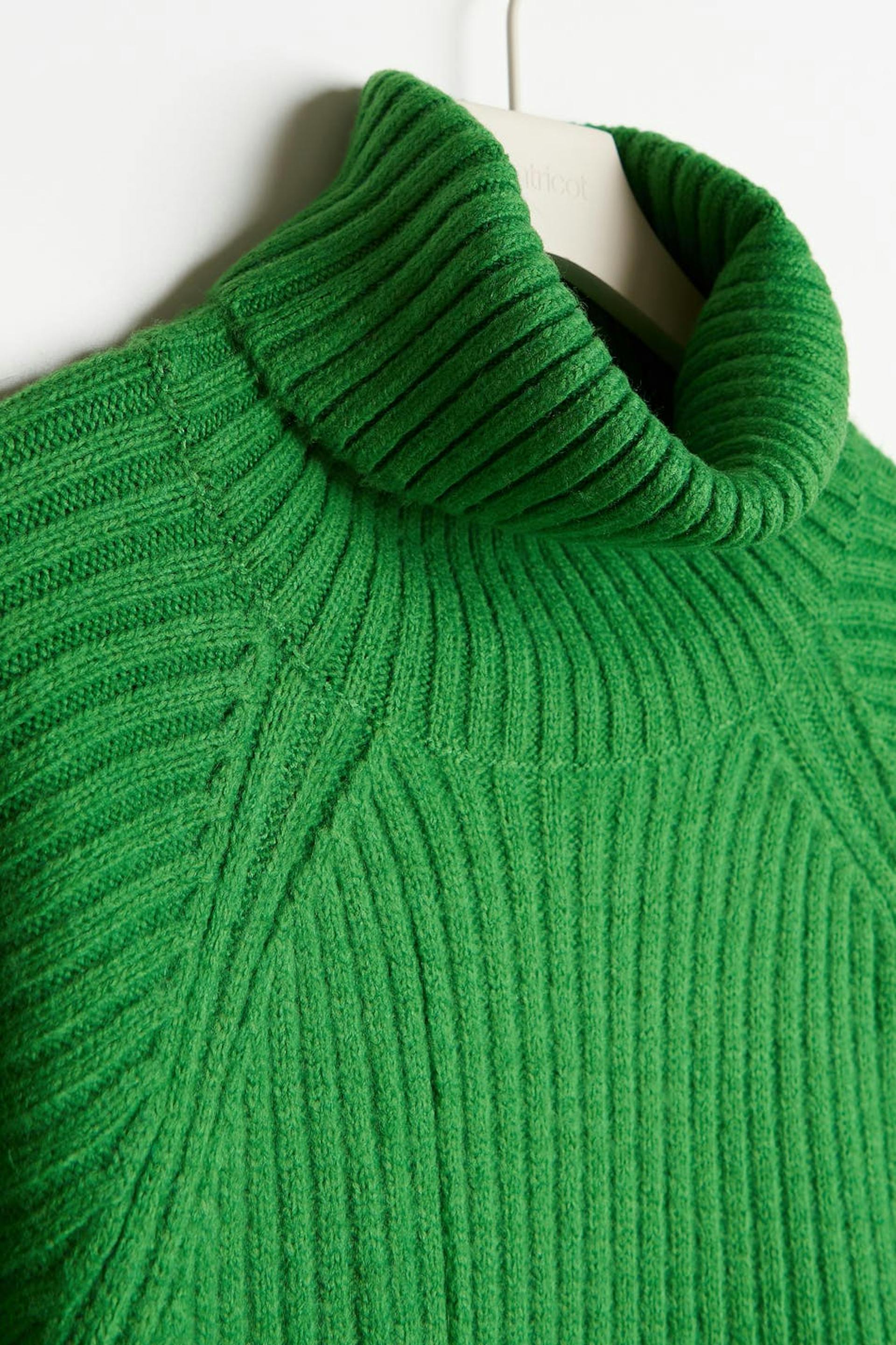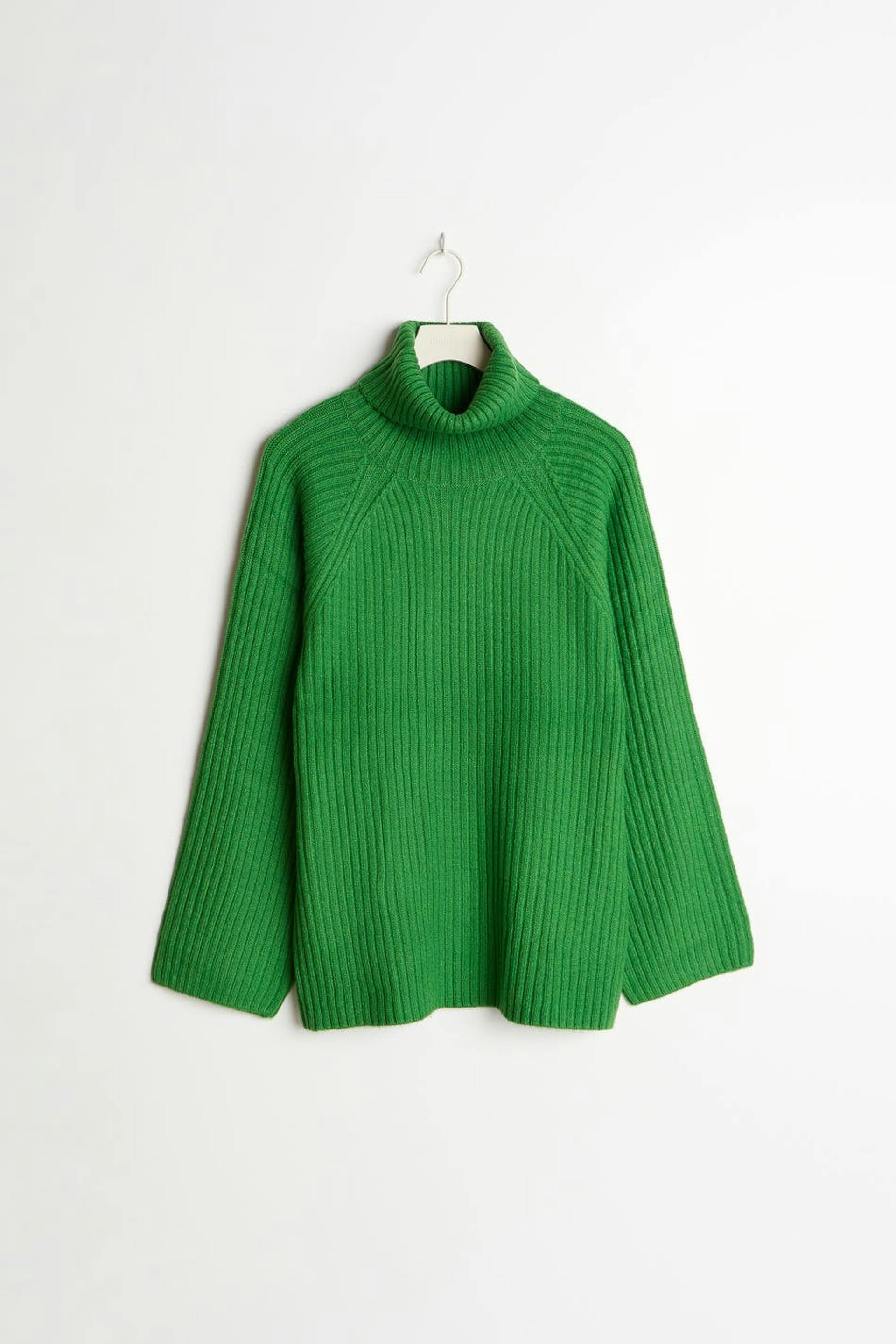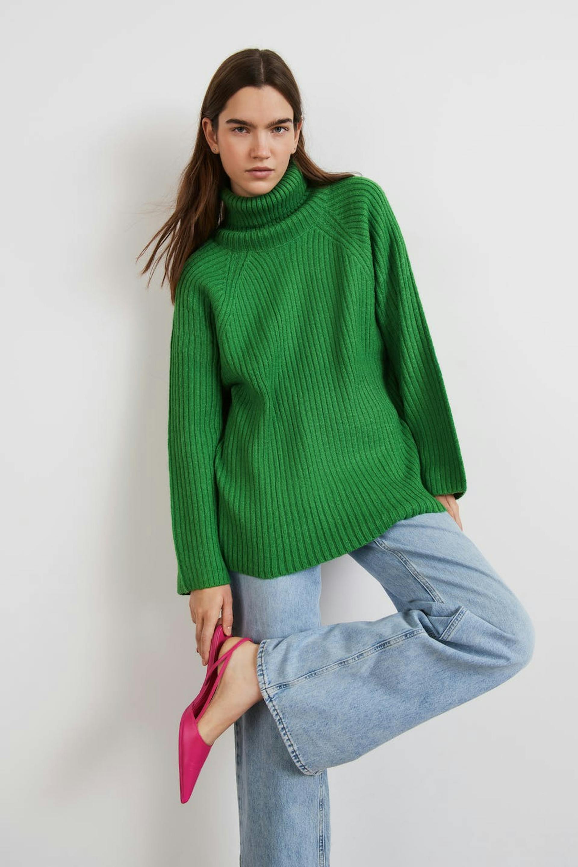 Knitted jumper with turtleneck. The jumper is green and has a loose-fitting style.