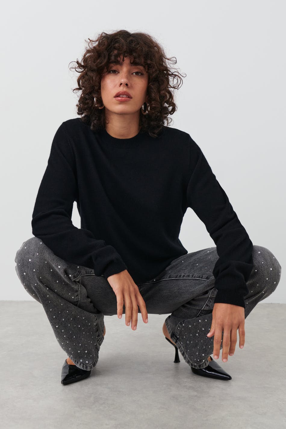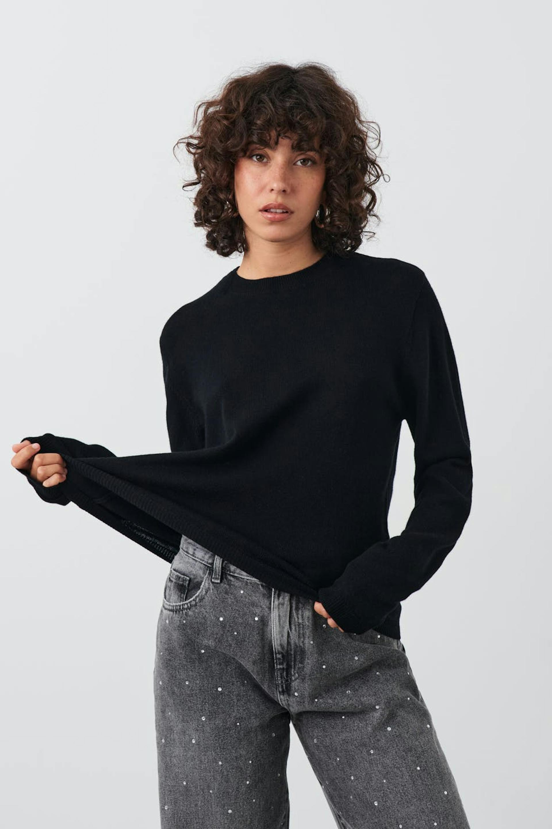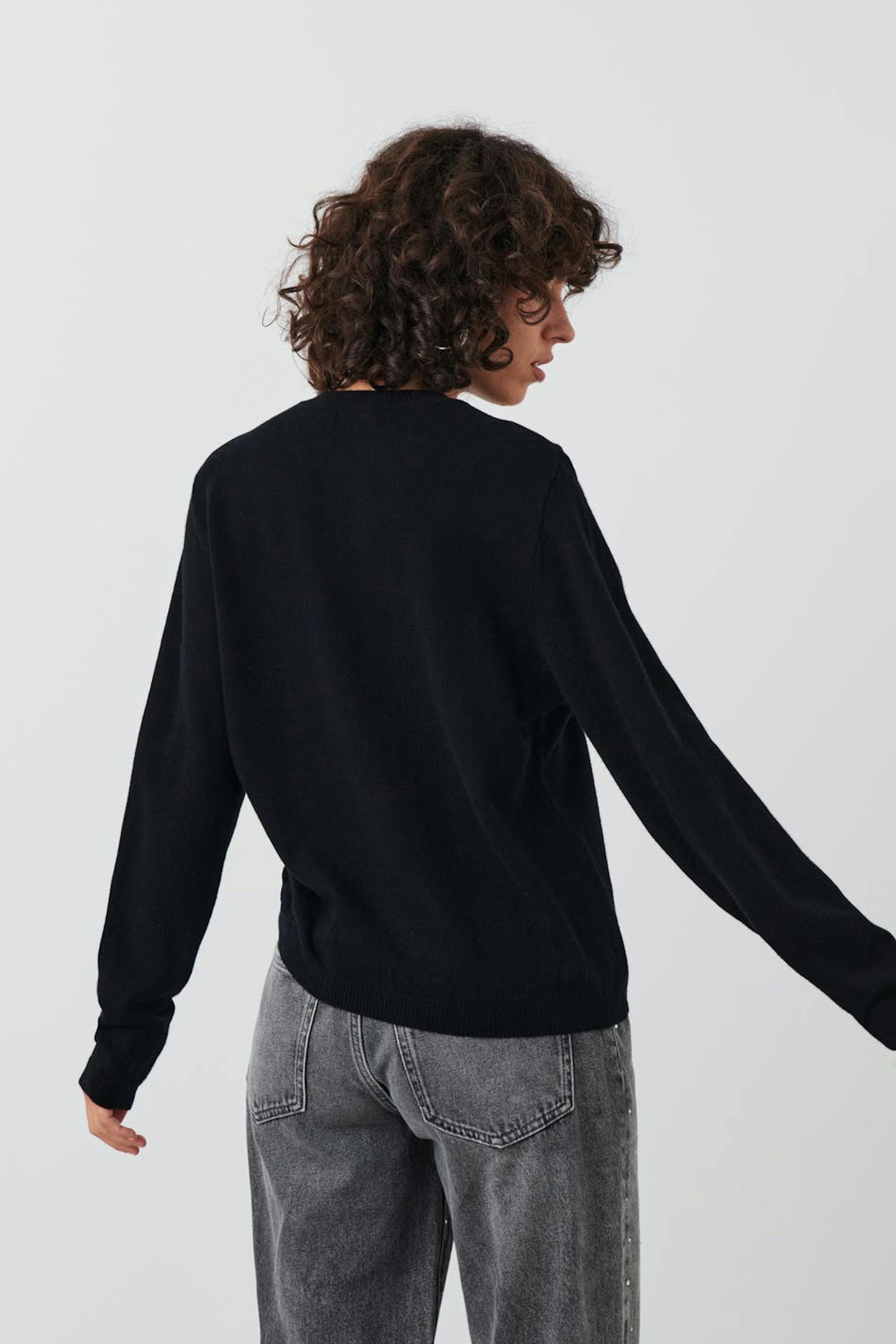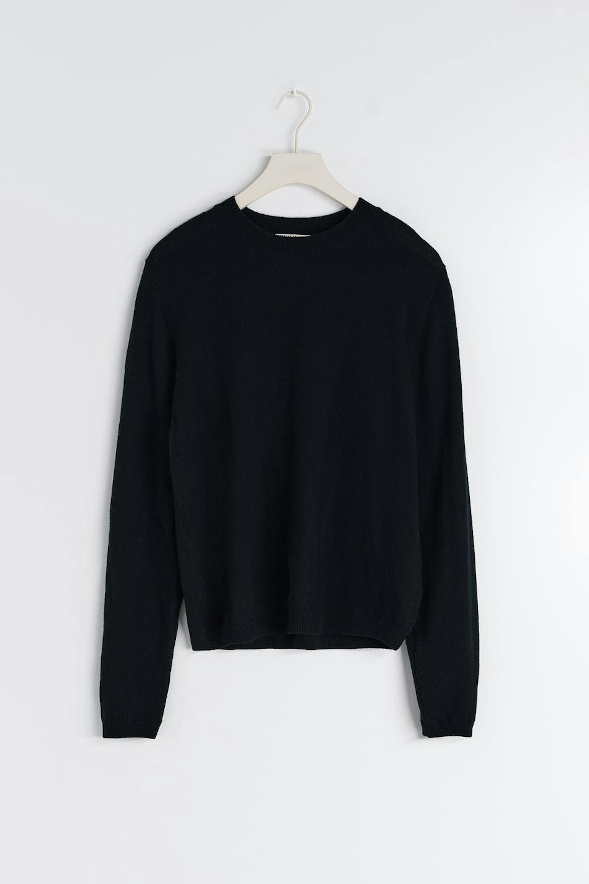 Fine-knitted jumper in wool with figure-hugging fit. The jumper is black and has round neckline. It has long sleeve and rib knit at sleeve ends and at the bottom.