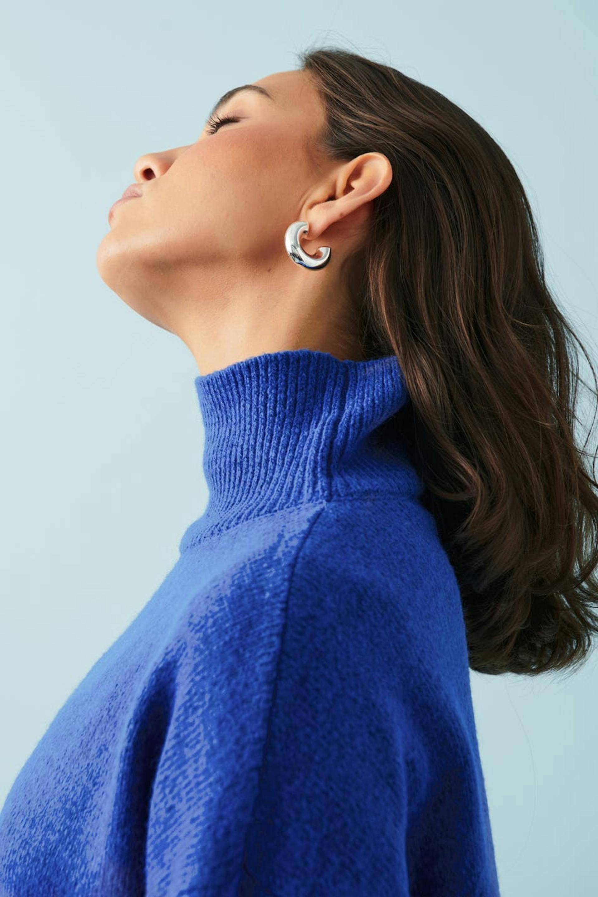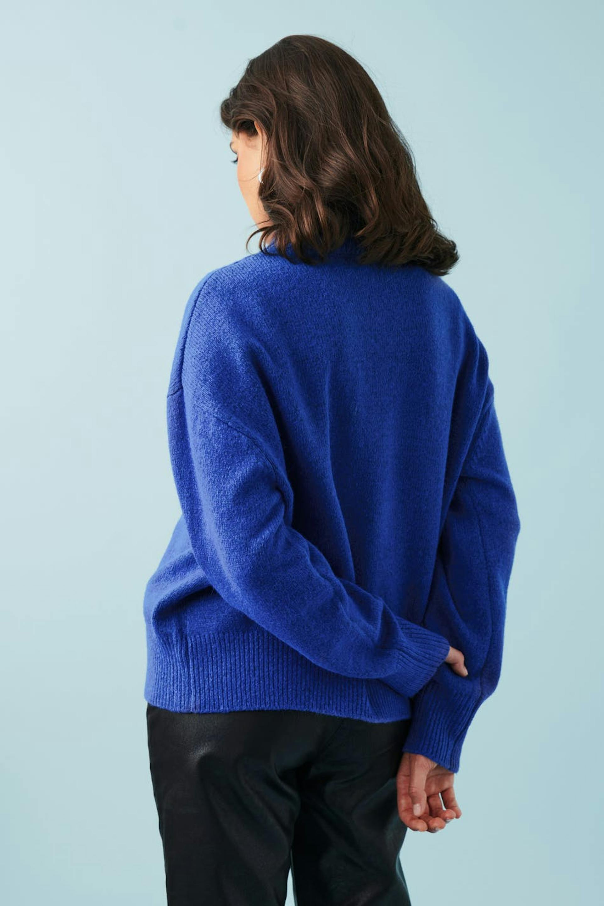 Knitted sweater with ribbed turtleneck. The sweat is blue and has oversize fit. It has long sleeve and rib-knit hem.