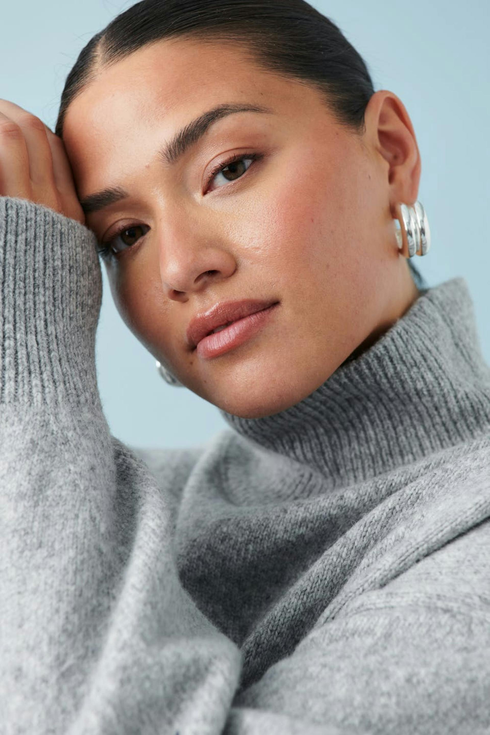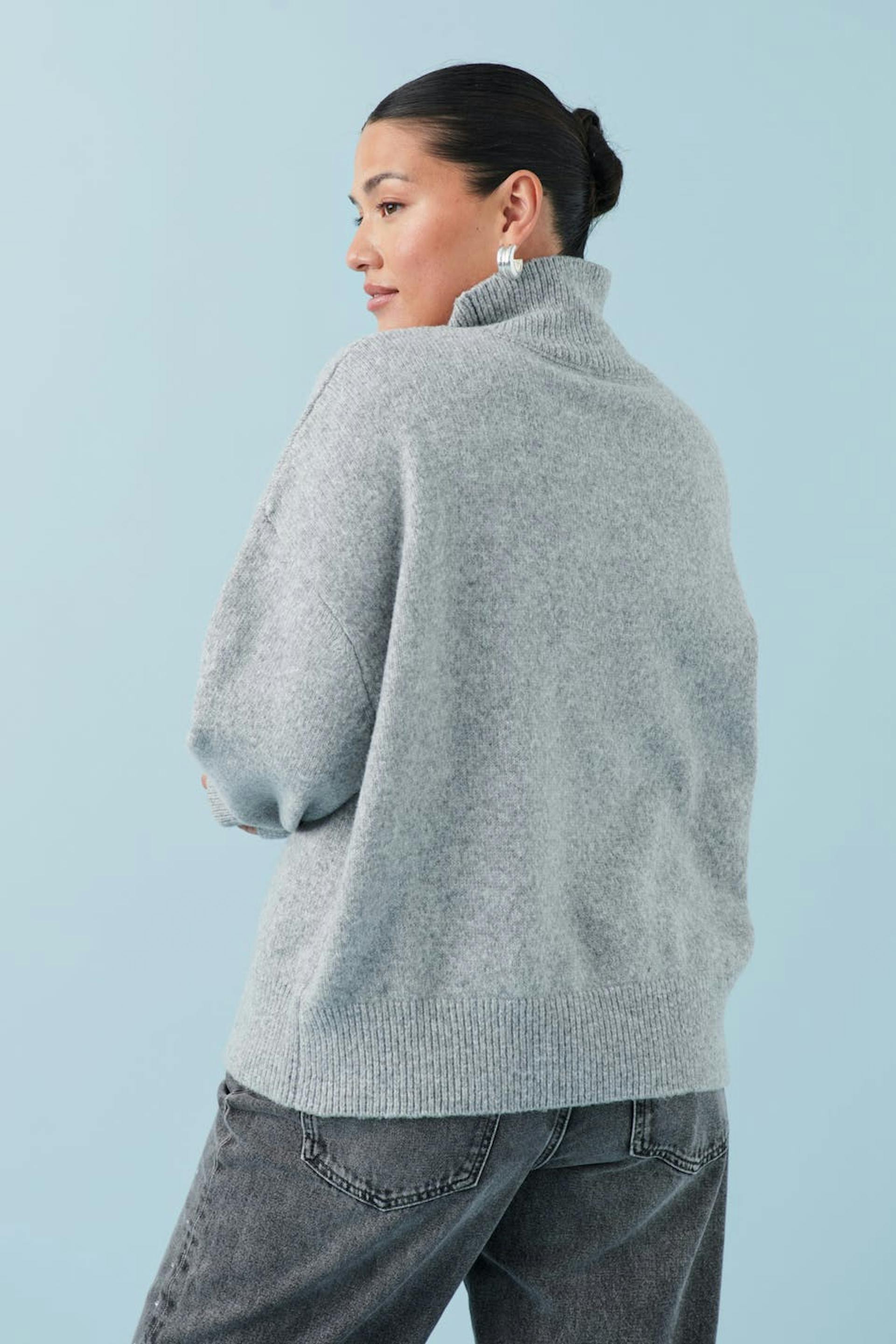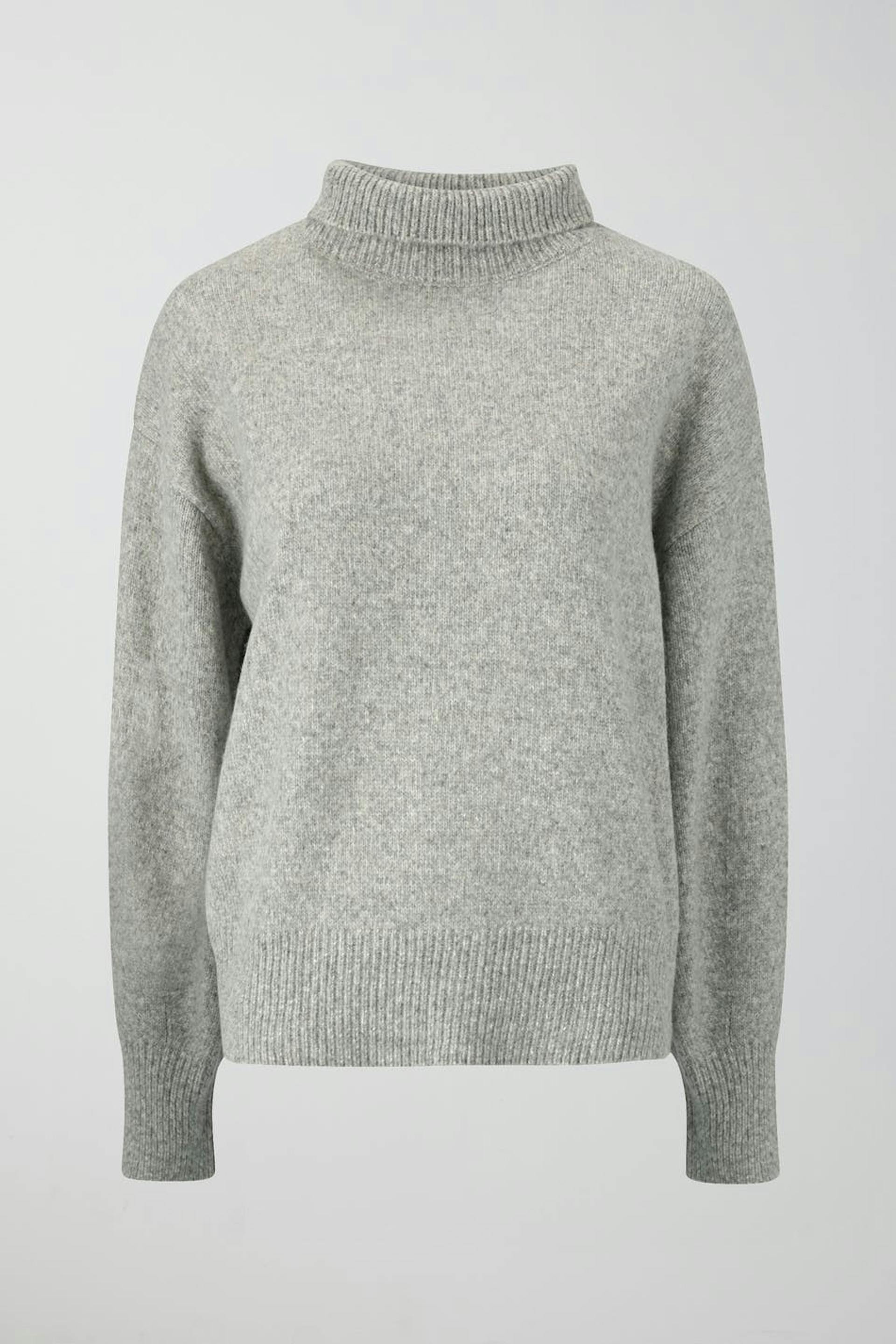 Knitted sweater with ribbed turtleneck. The sweat is grey and has oversize fit. It has long sleeve and rib-knit hem.