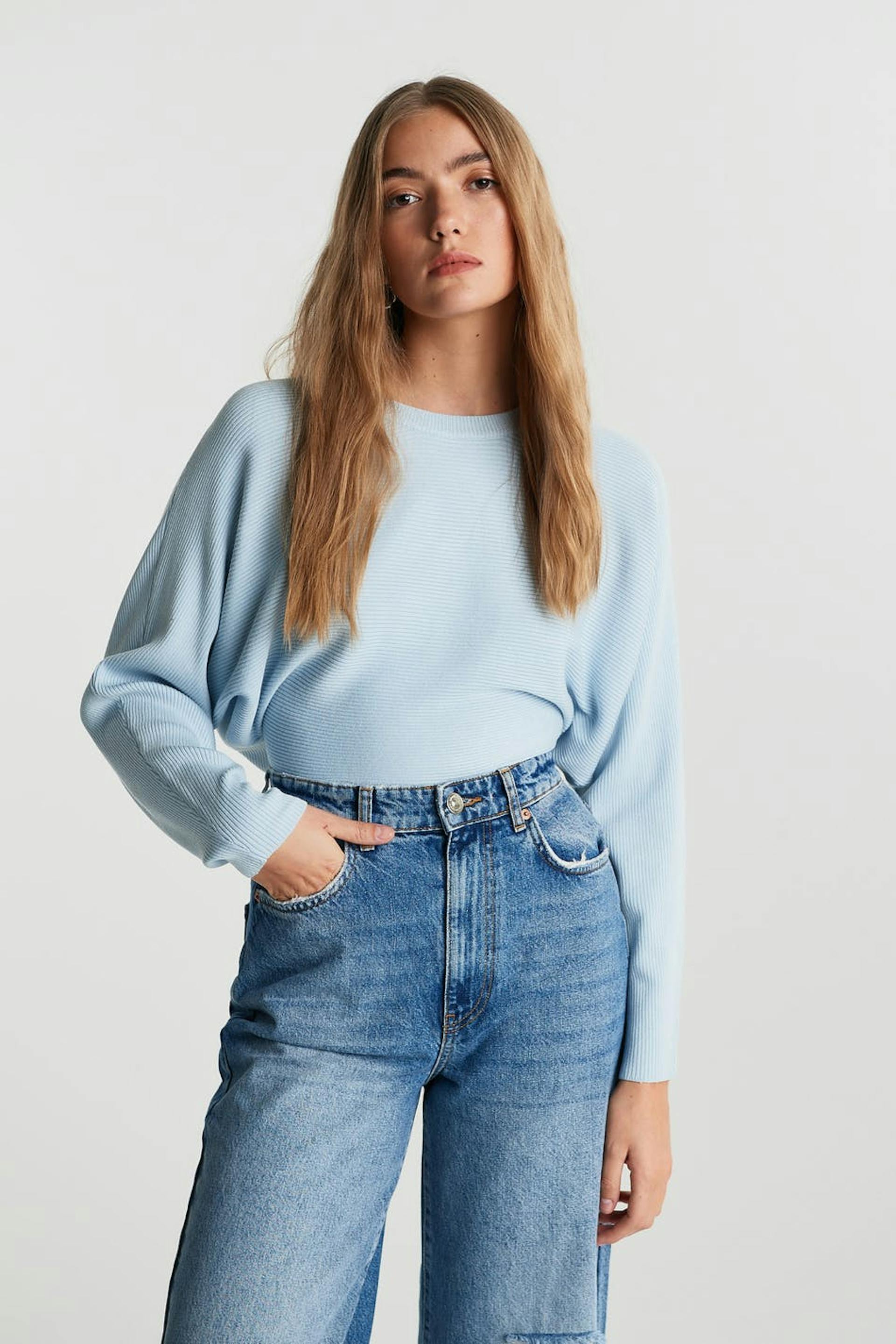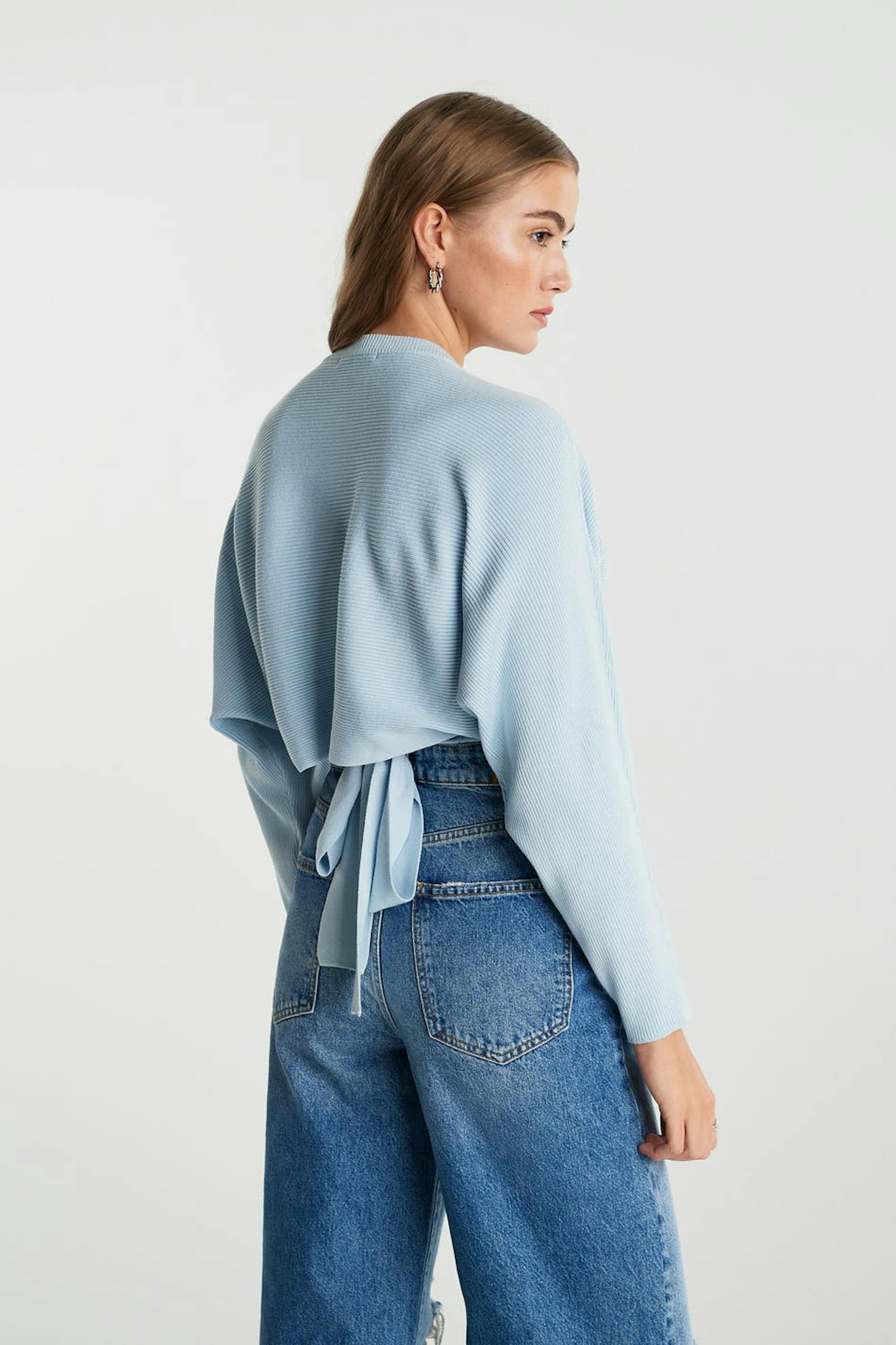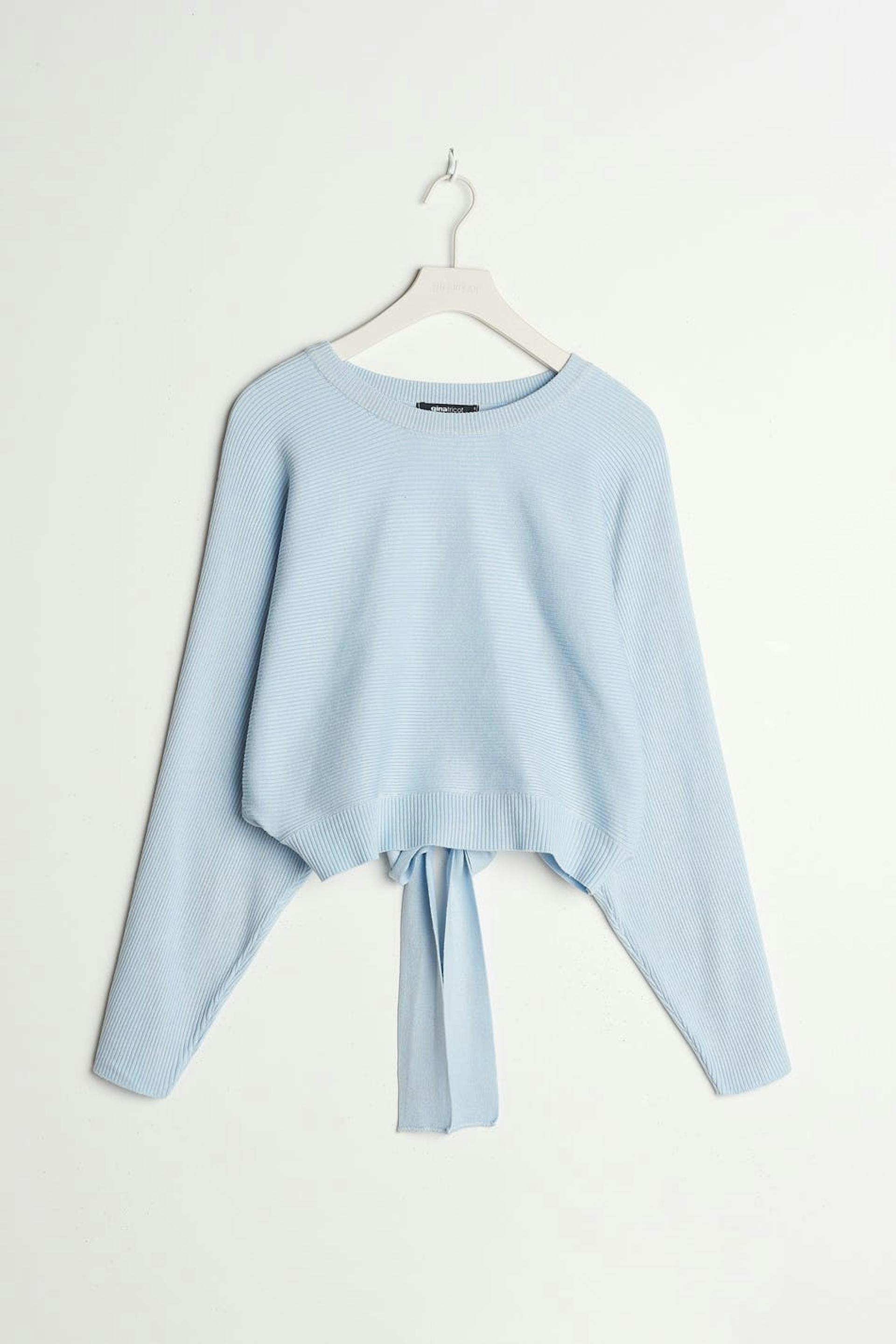 Long-sleeved jumper with deep arm holes. The jumper is blue, rib-knit and soft. It has a knot detail in the back.