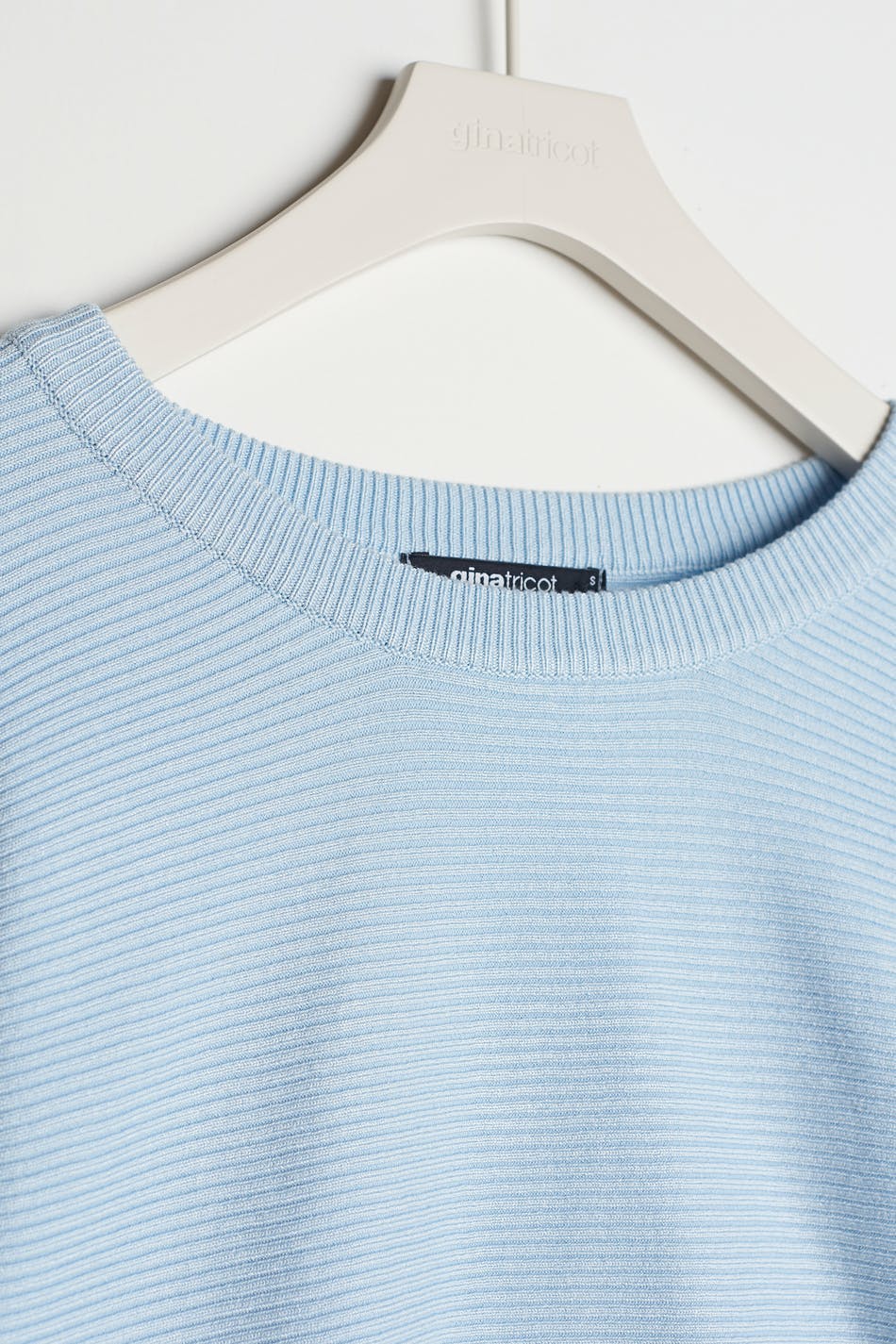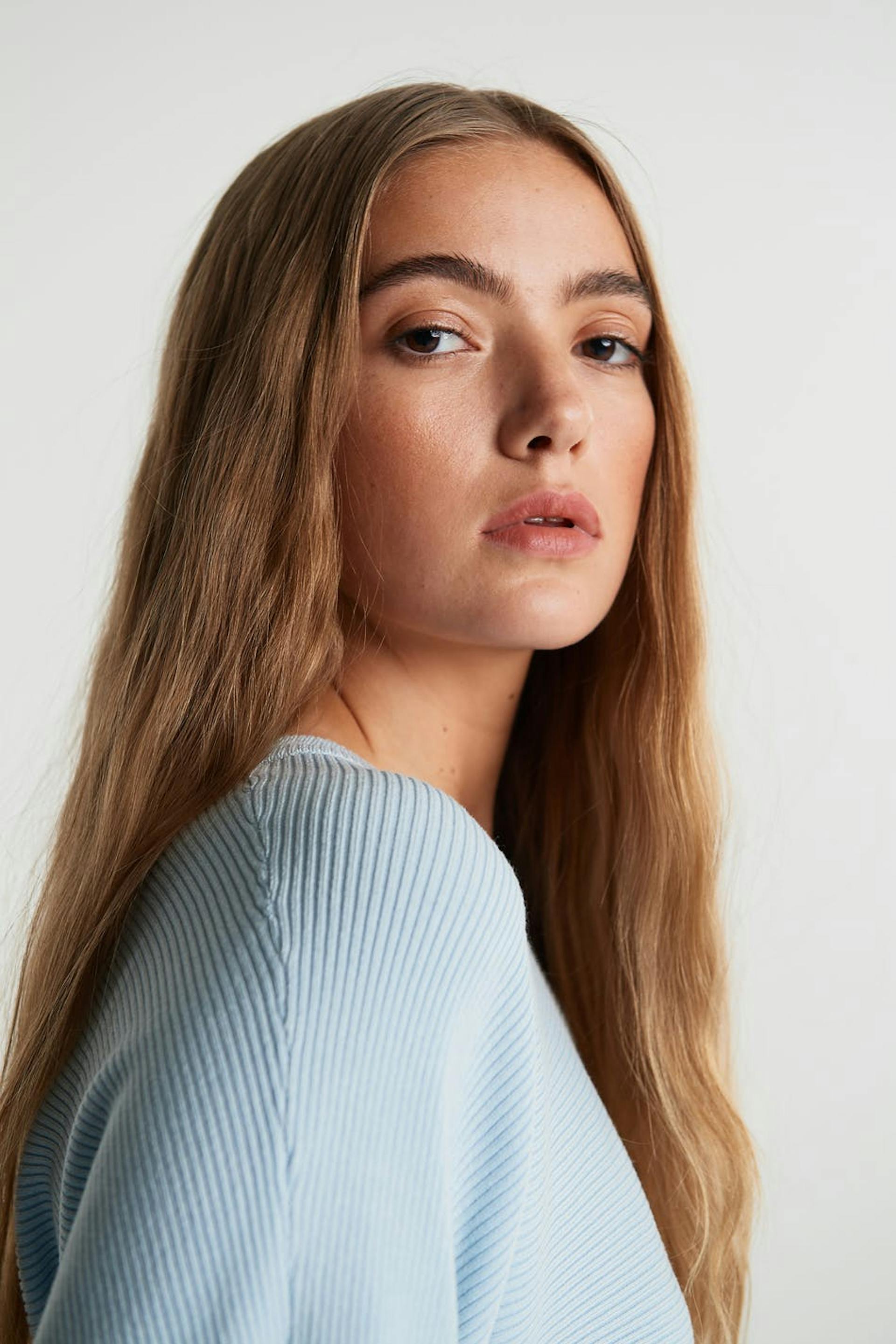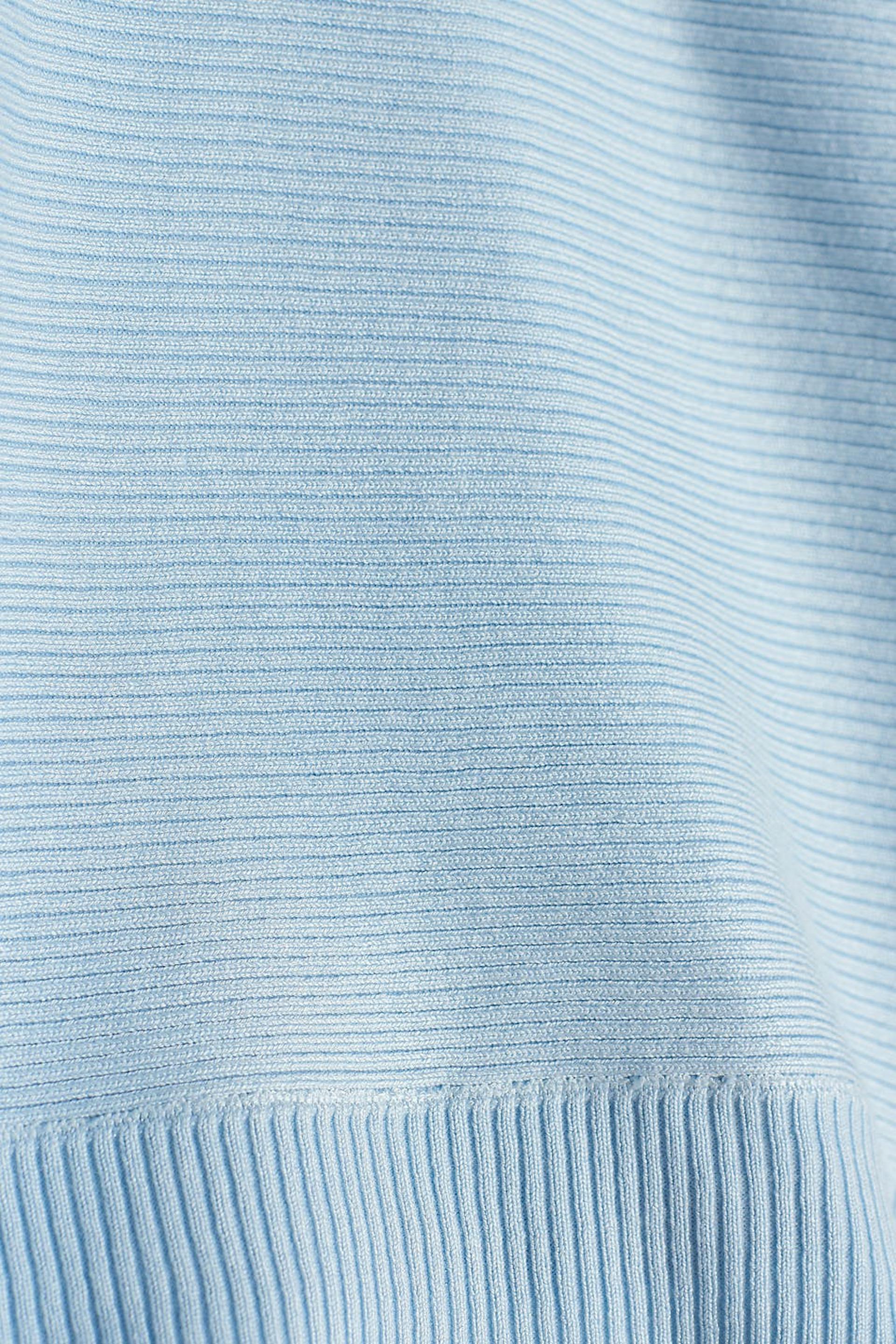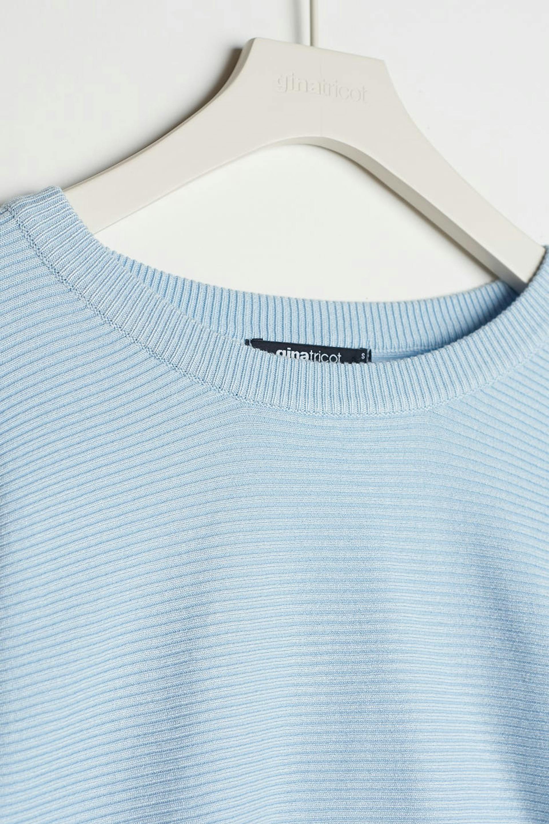Long-sleeved jumper with deep arm holes. The jumper is blue, rib-knit and soft. It has a knot detail in the back.