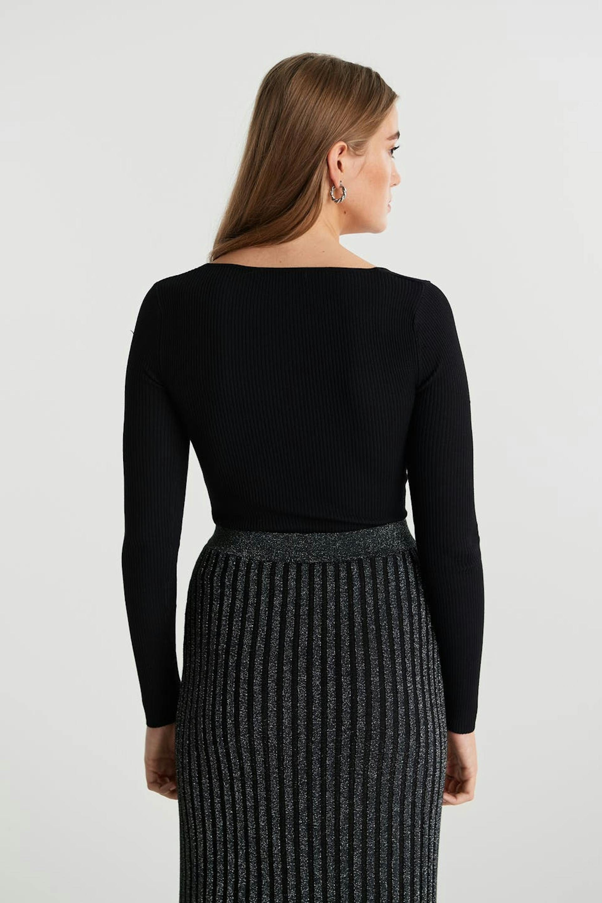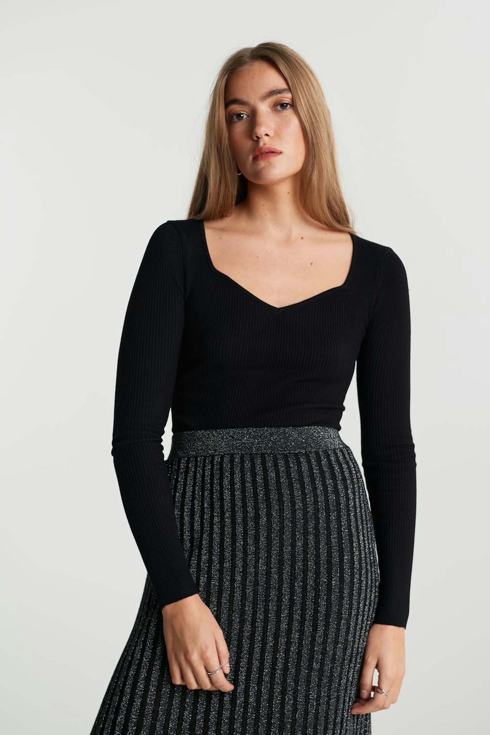 Knitted top with a sweetheart neckline. The top is black, knitted and long-sleeved. It has a fitted fit.