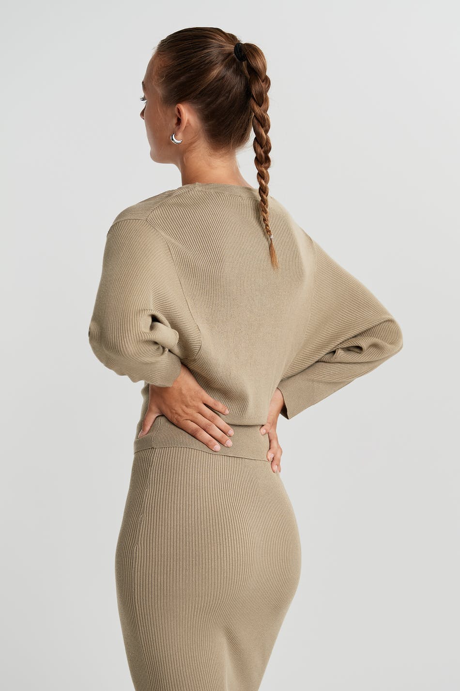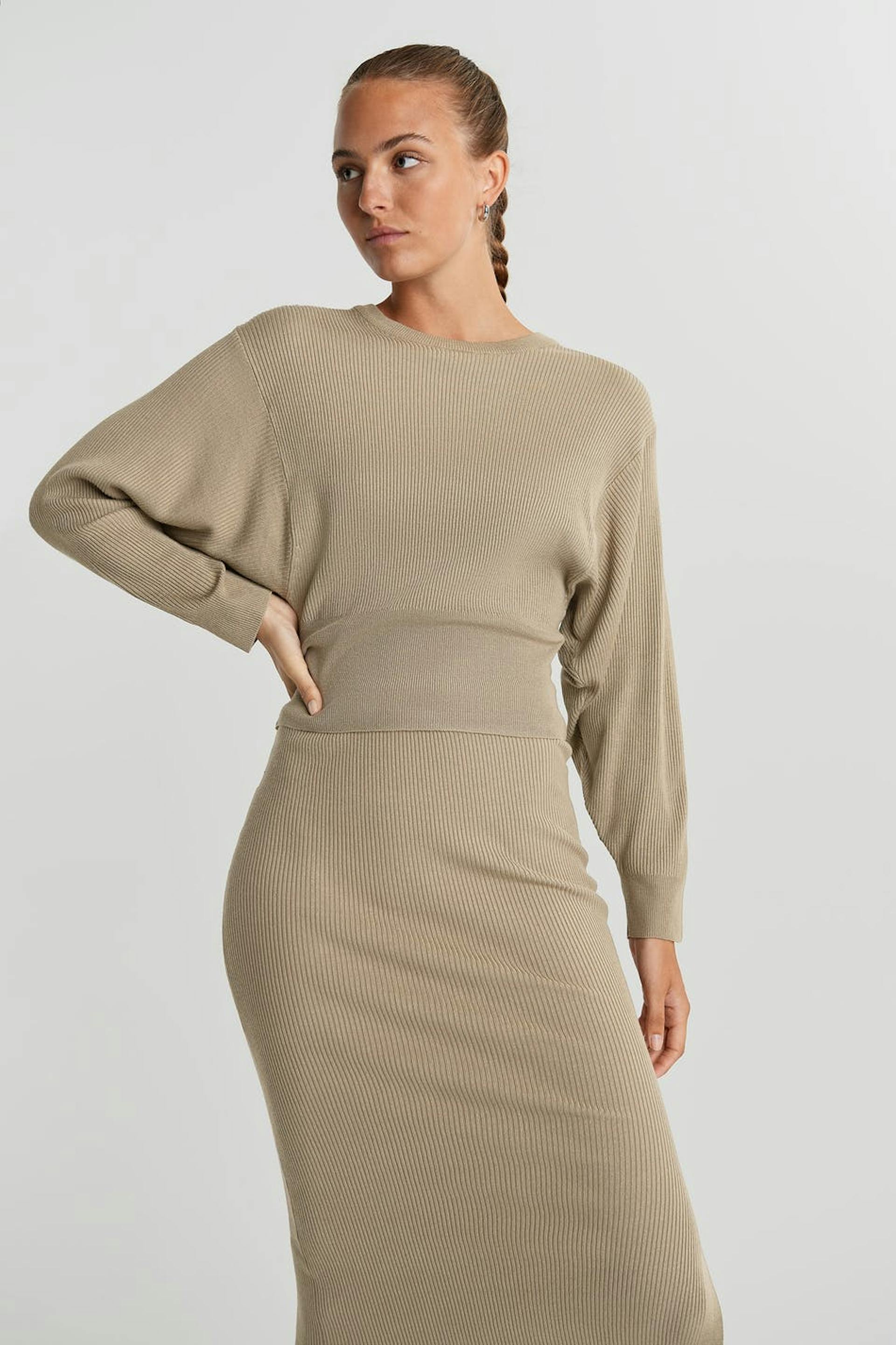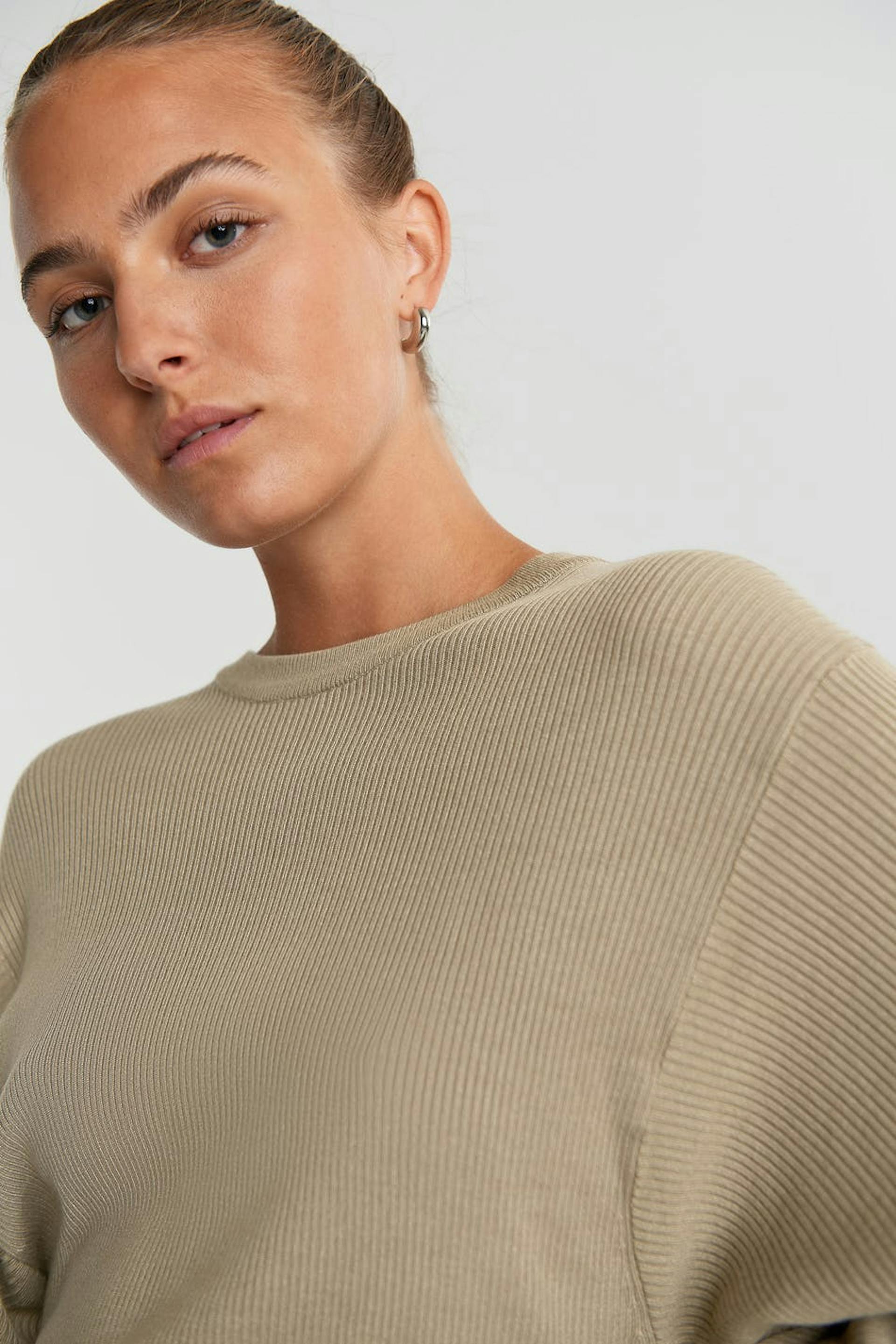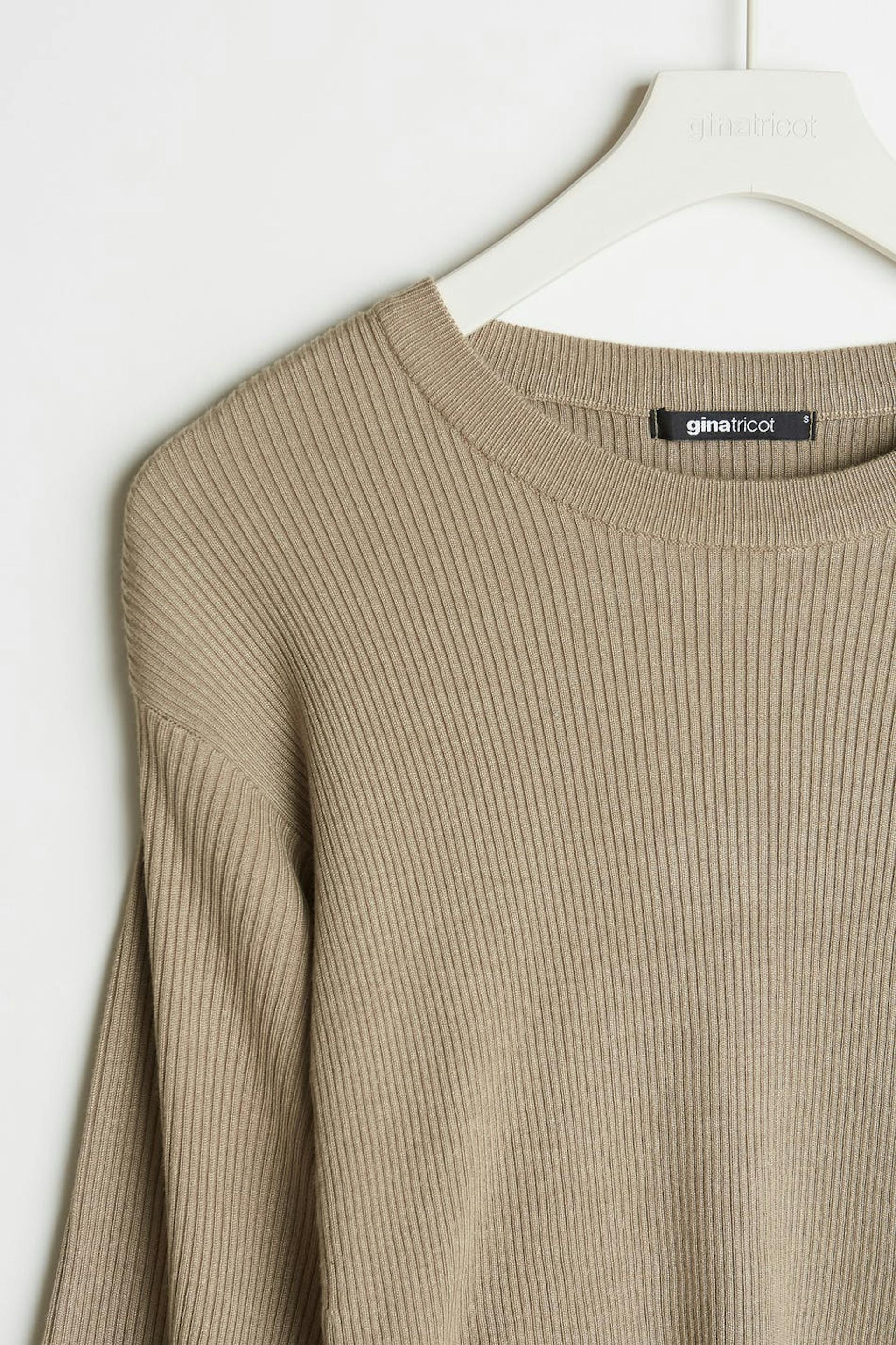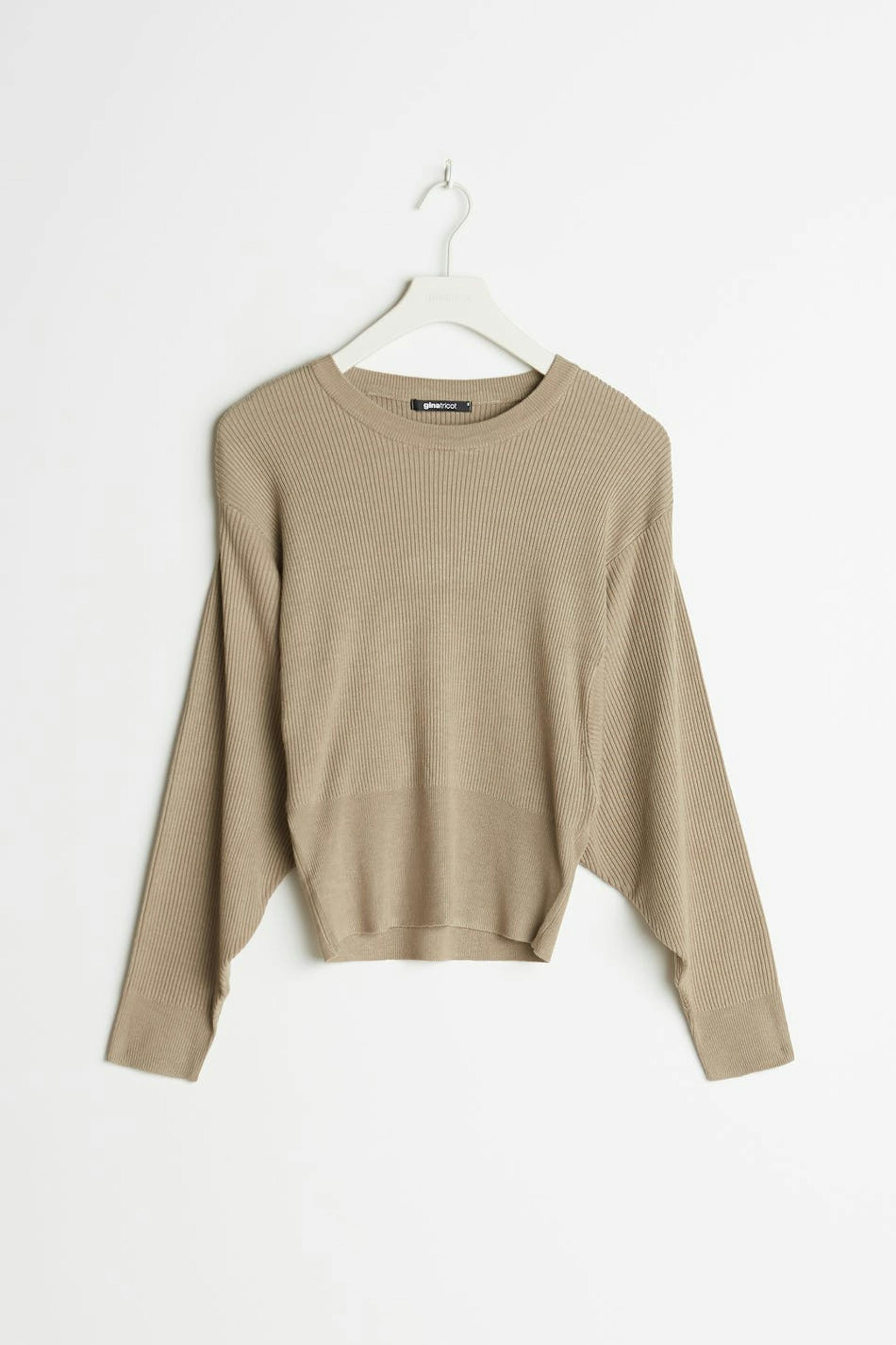 Ribbed jumper with a spacious fit. The jumper is beige and knitted and has deep arm holes.
