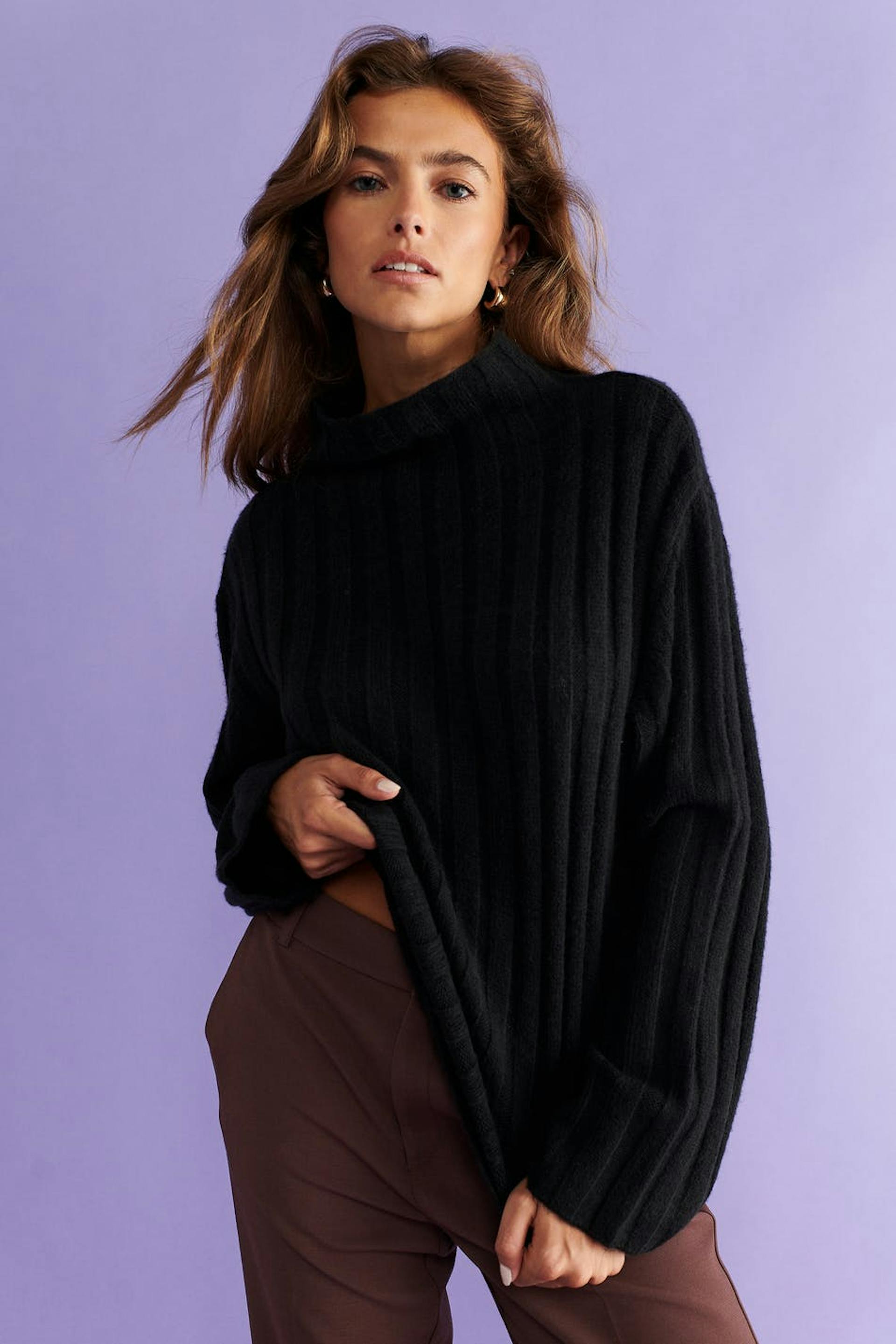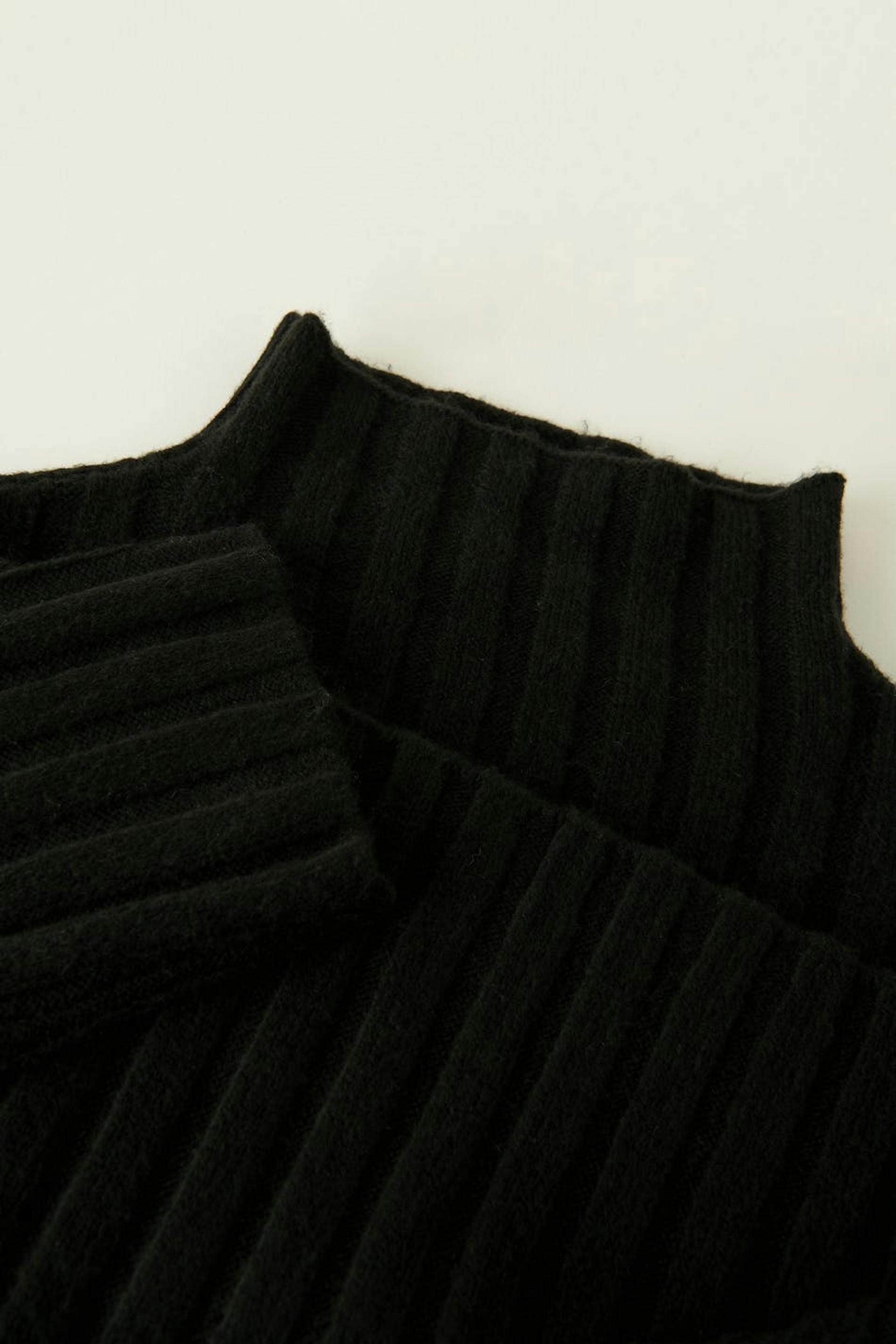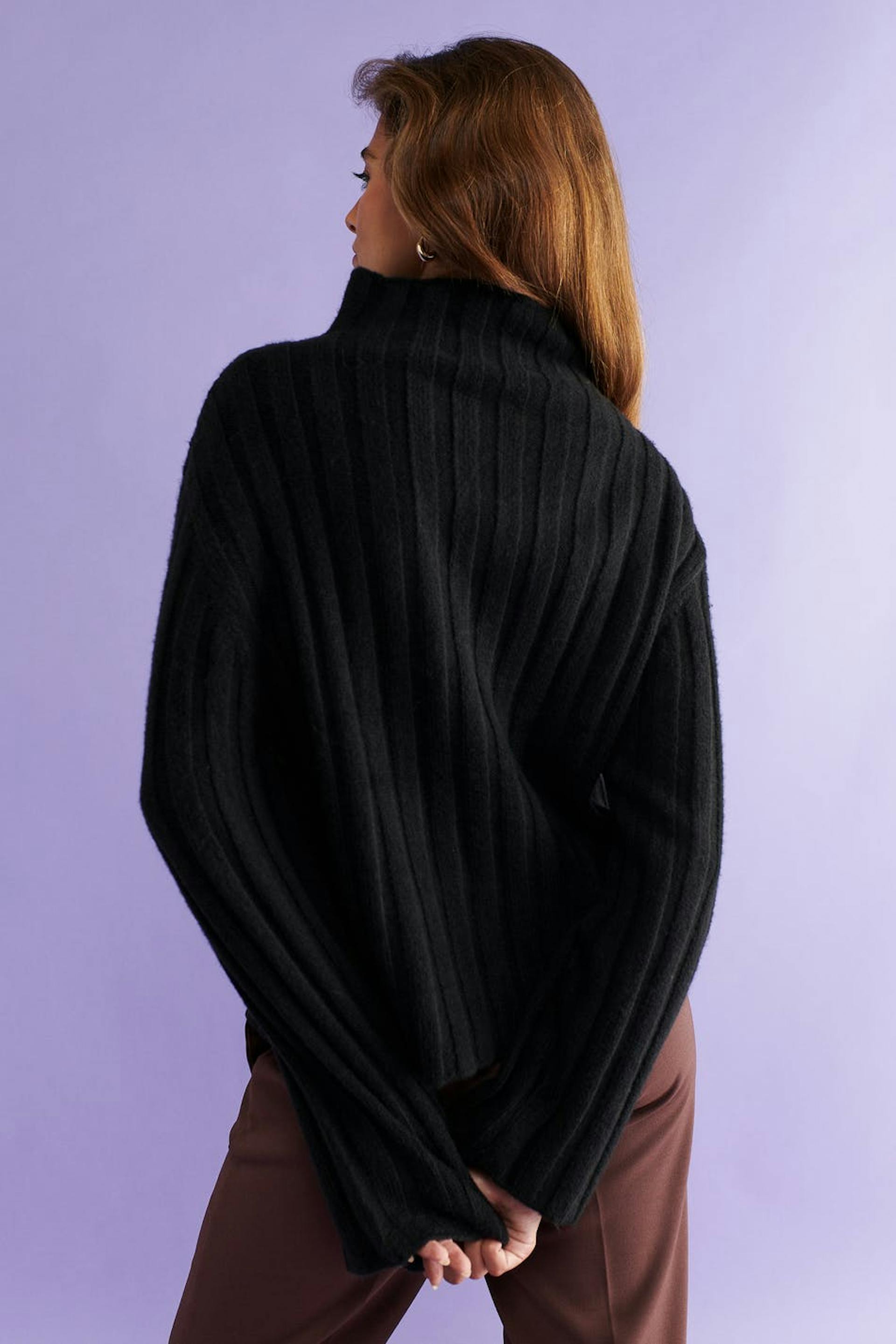 Knitted sweater with high neckline. The sweat is black and has wide ribbing. It has long sleeves and dropped shoulders.