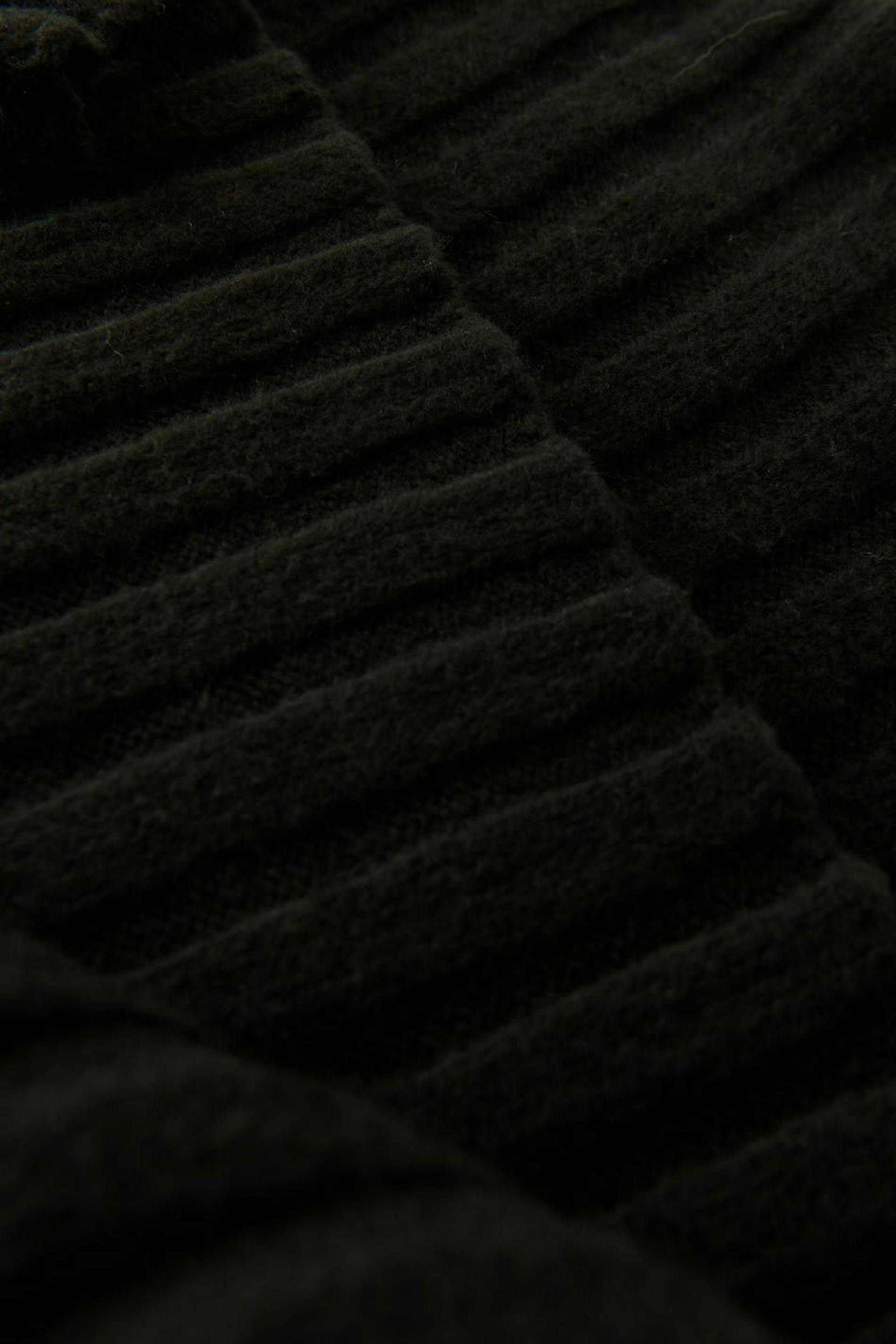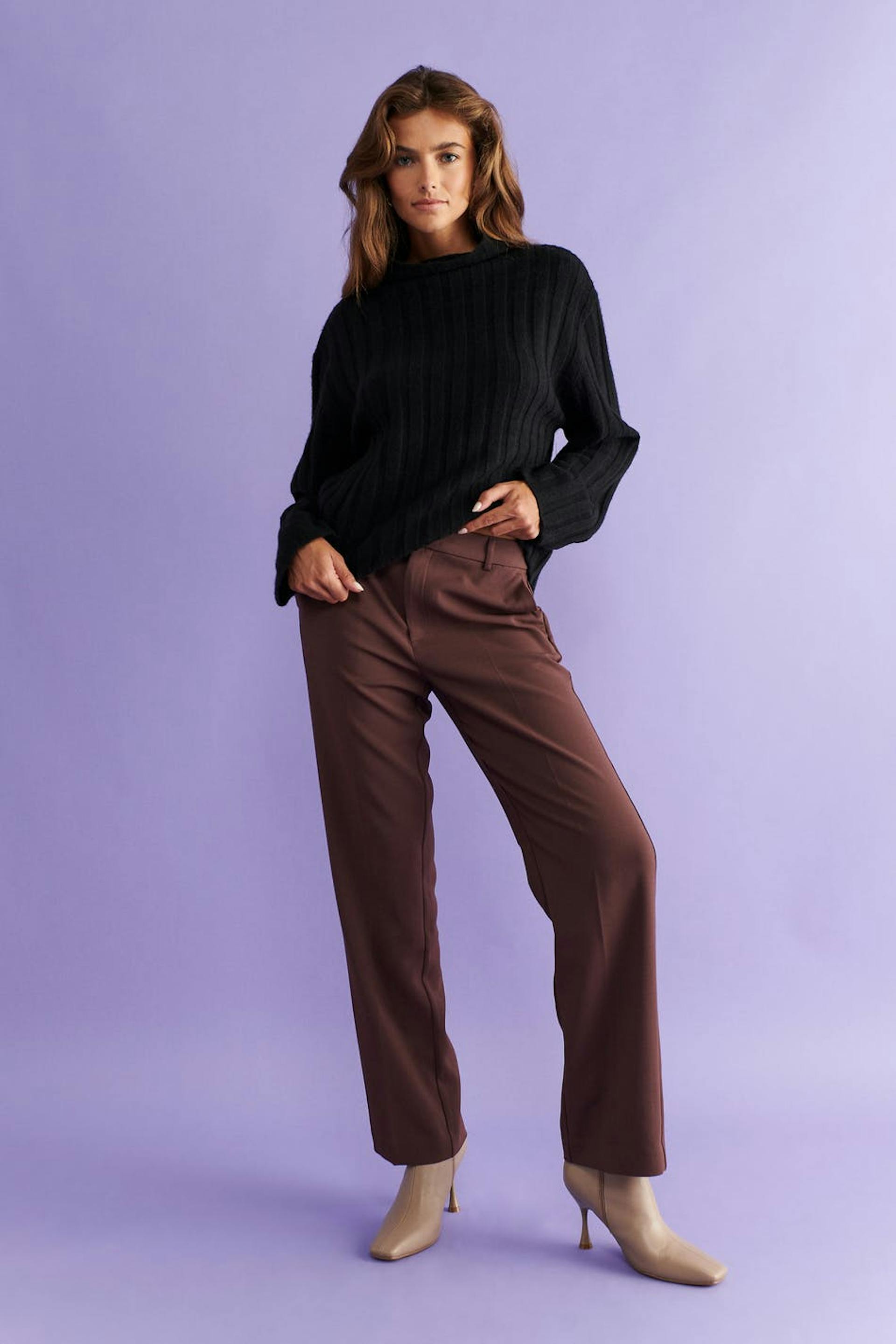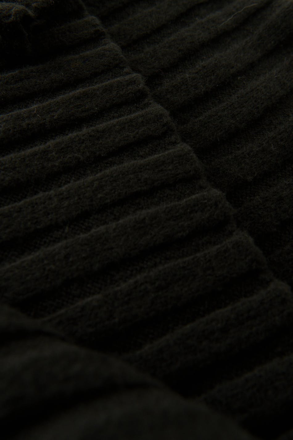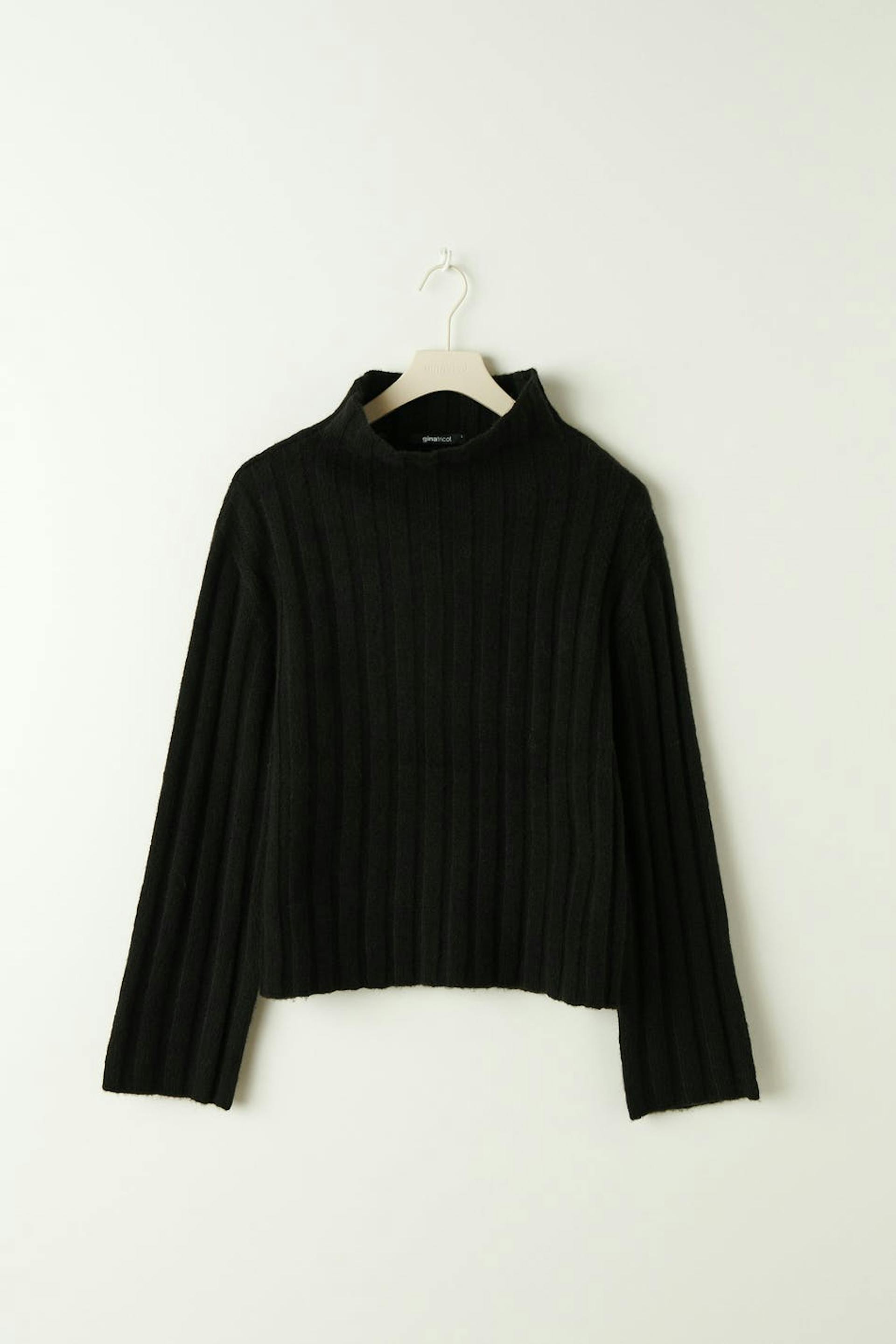 Knitted sweater with high neckline. The sweat is black and has wide ribbing. It has long sleeves and dropped shoulders.