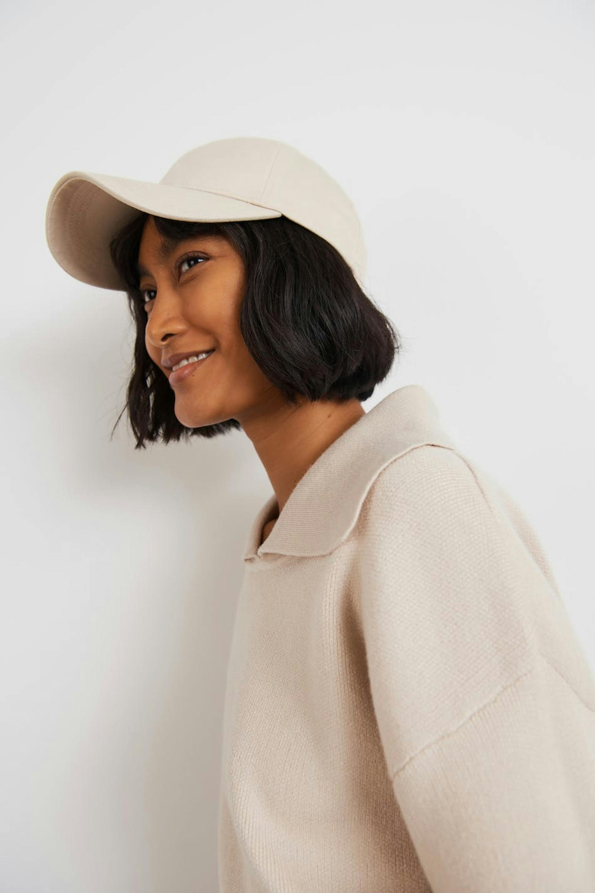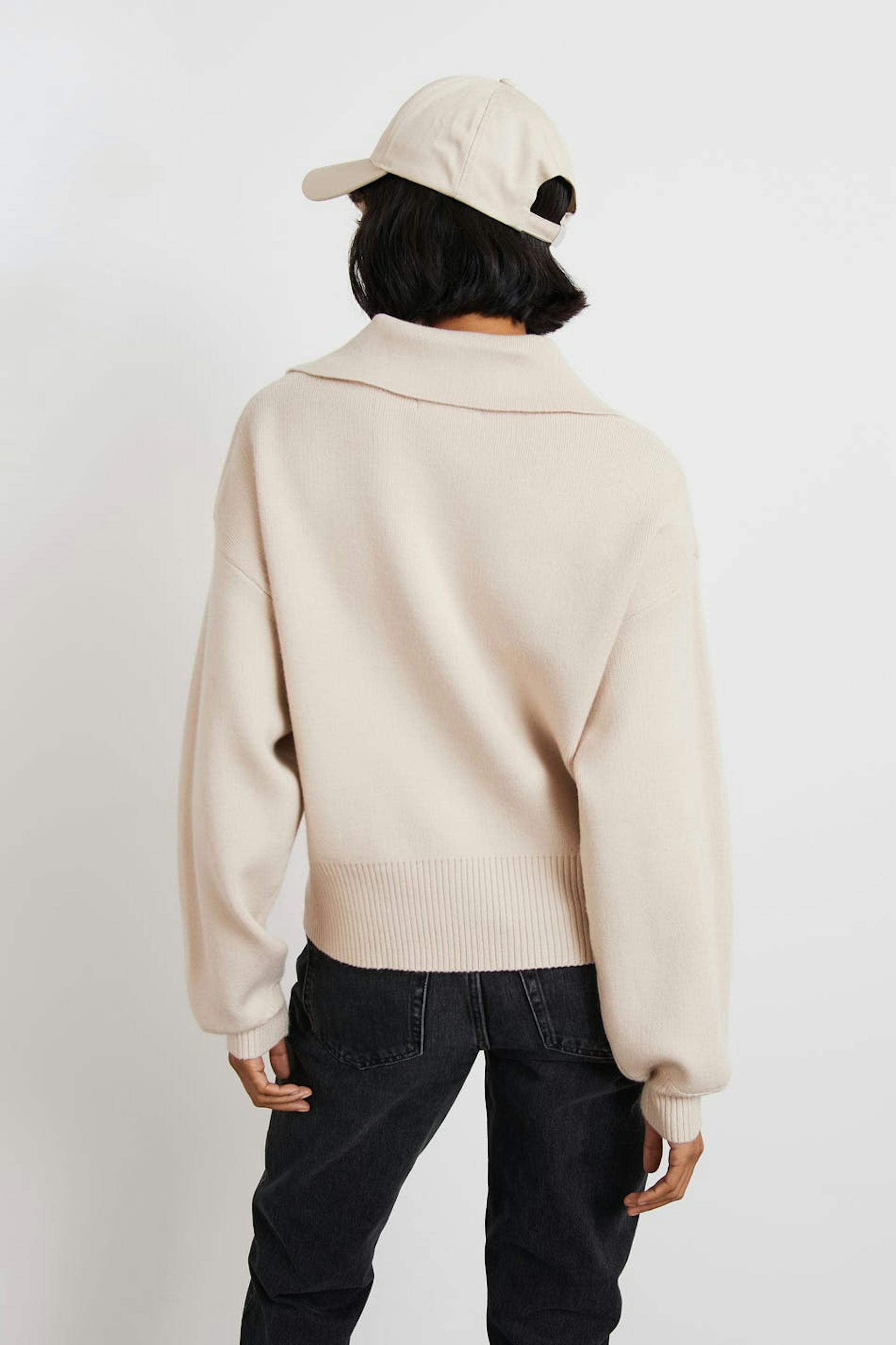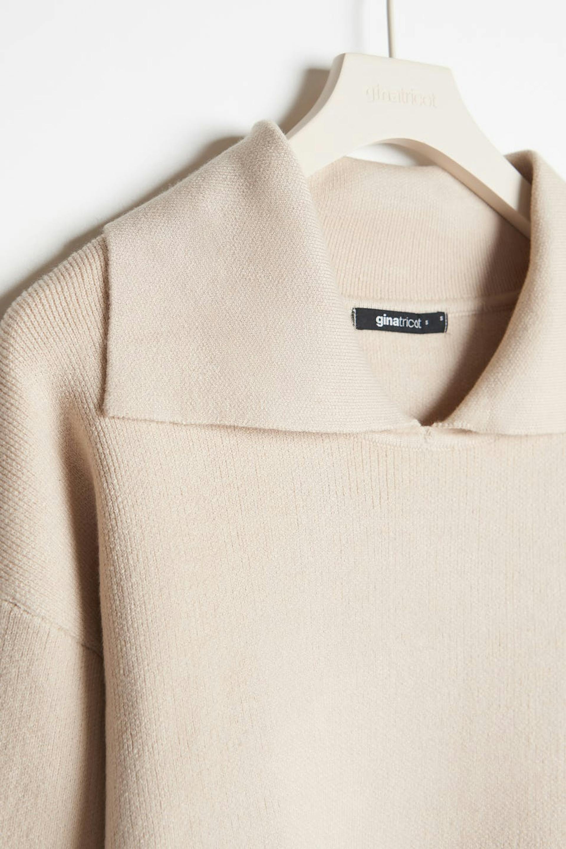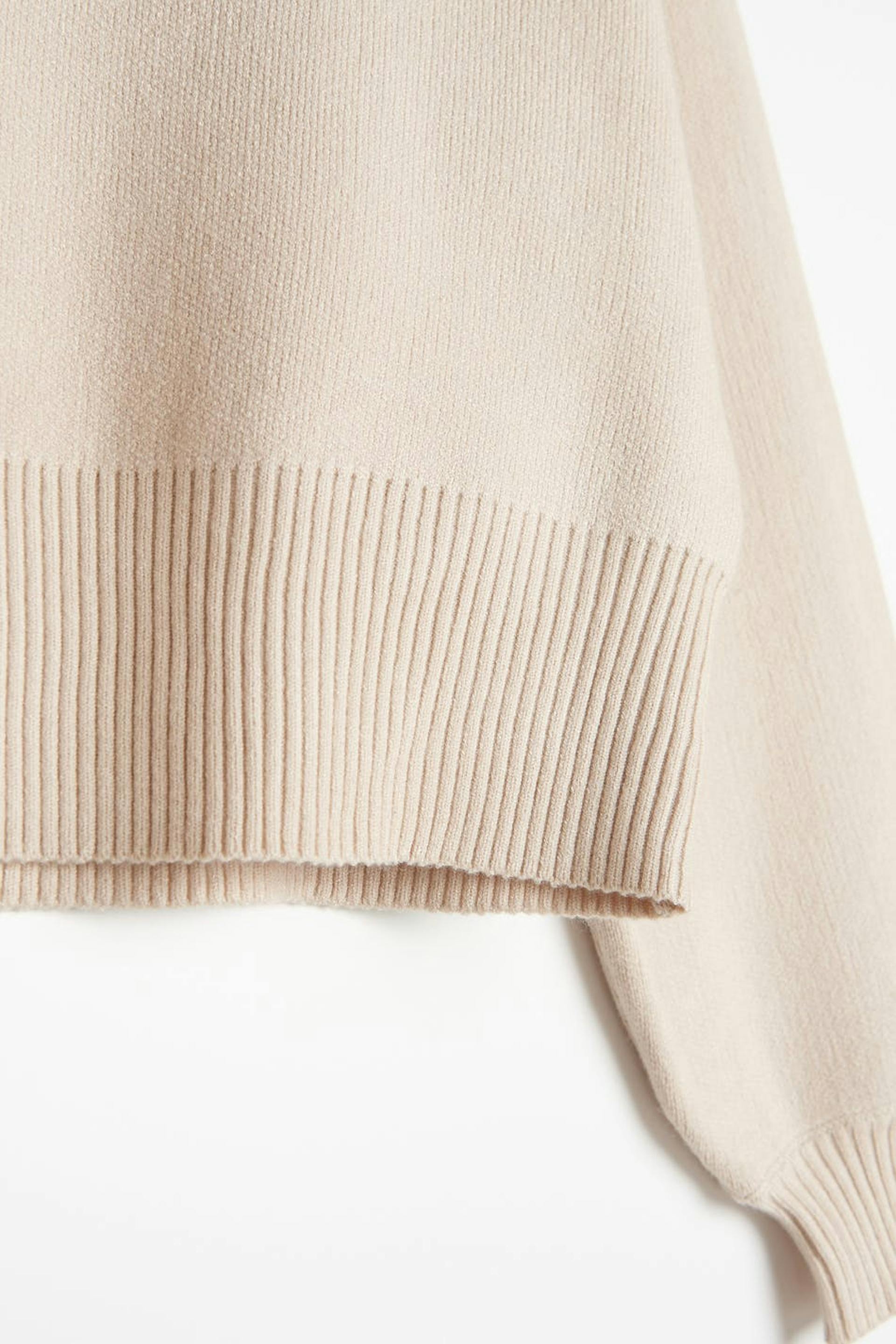 Knitted jumper with an oversize fit. The jumper is beige and has dropped shoulders. It has a ribbed hem.
