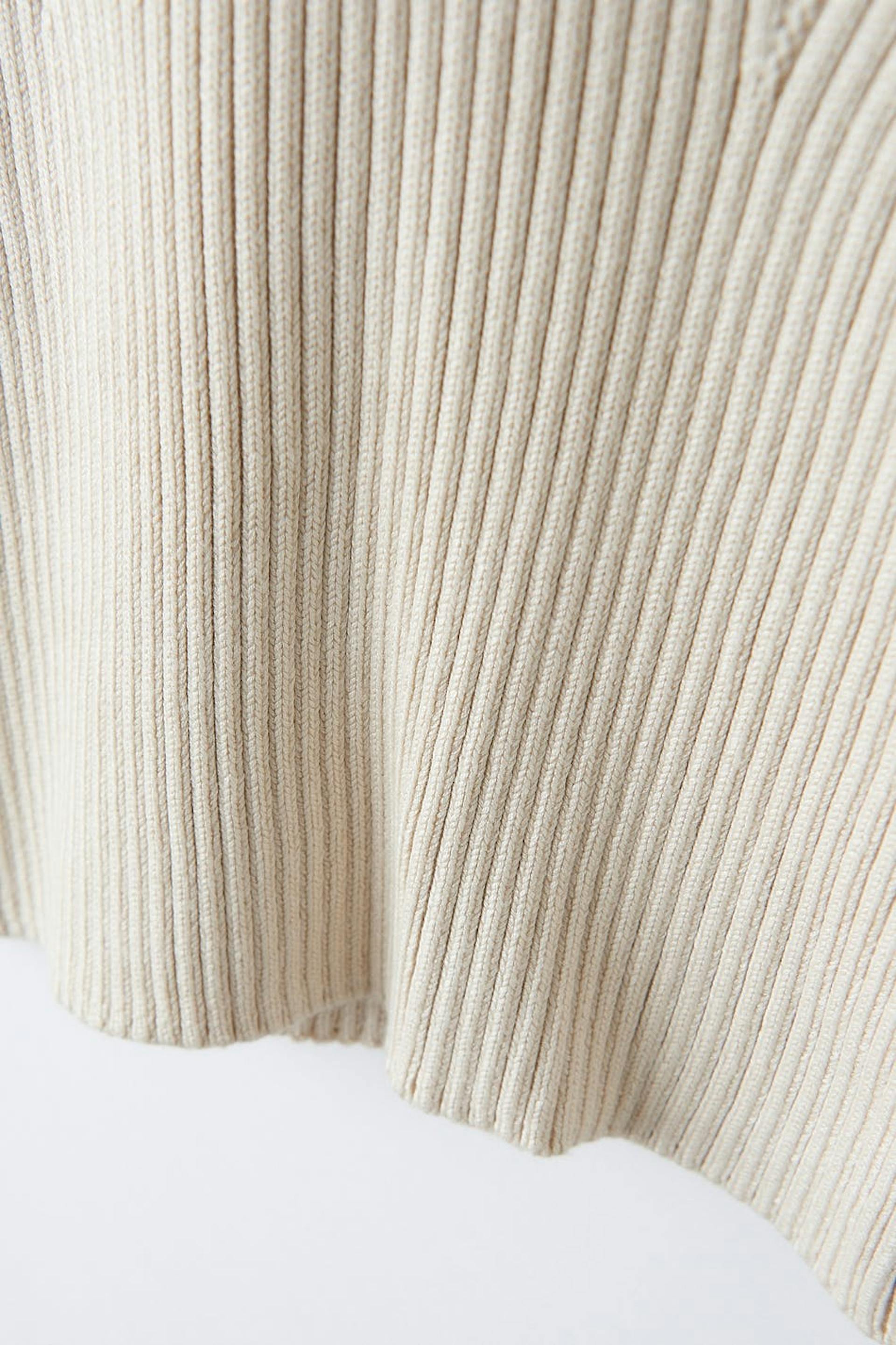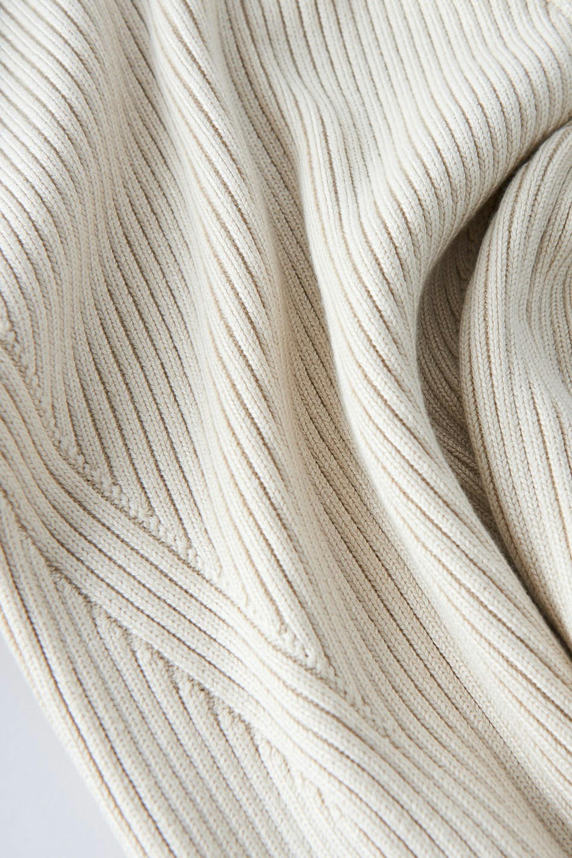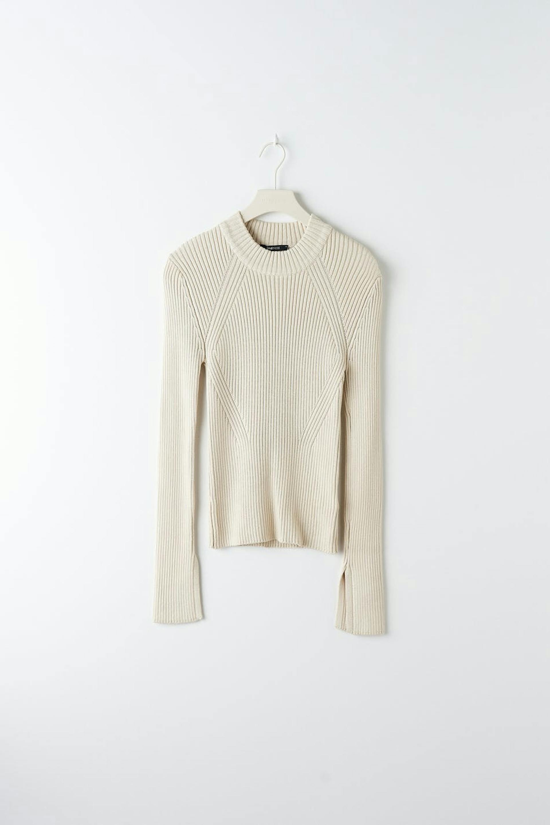 Long-sleeved knitted sweater with fitted fit. The sweat is beige and has slit on the sleeve ends. It has high neckline and fully-fashioned sections at the front.