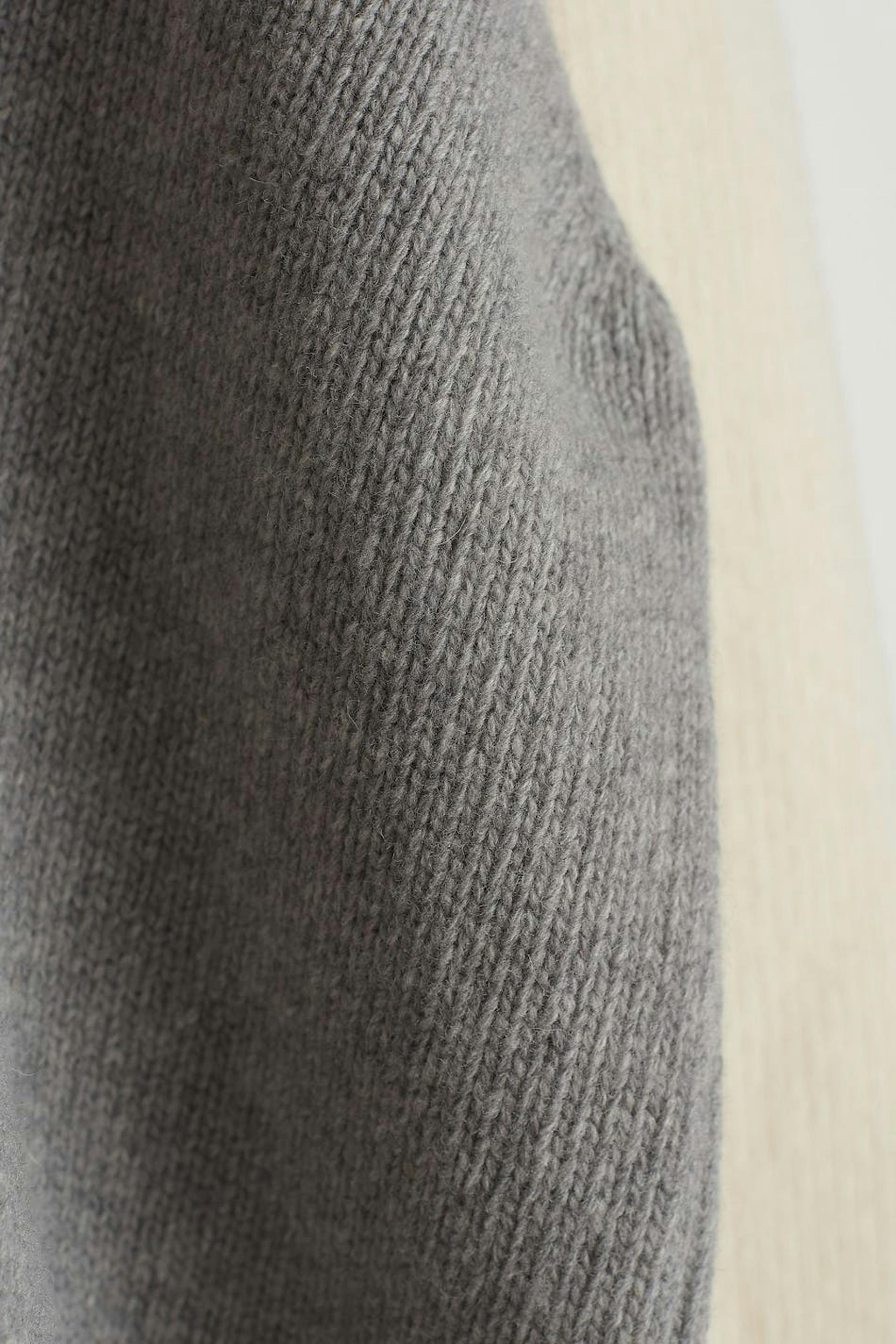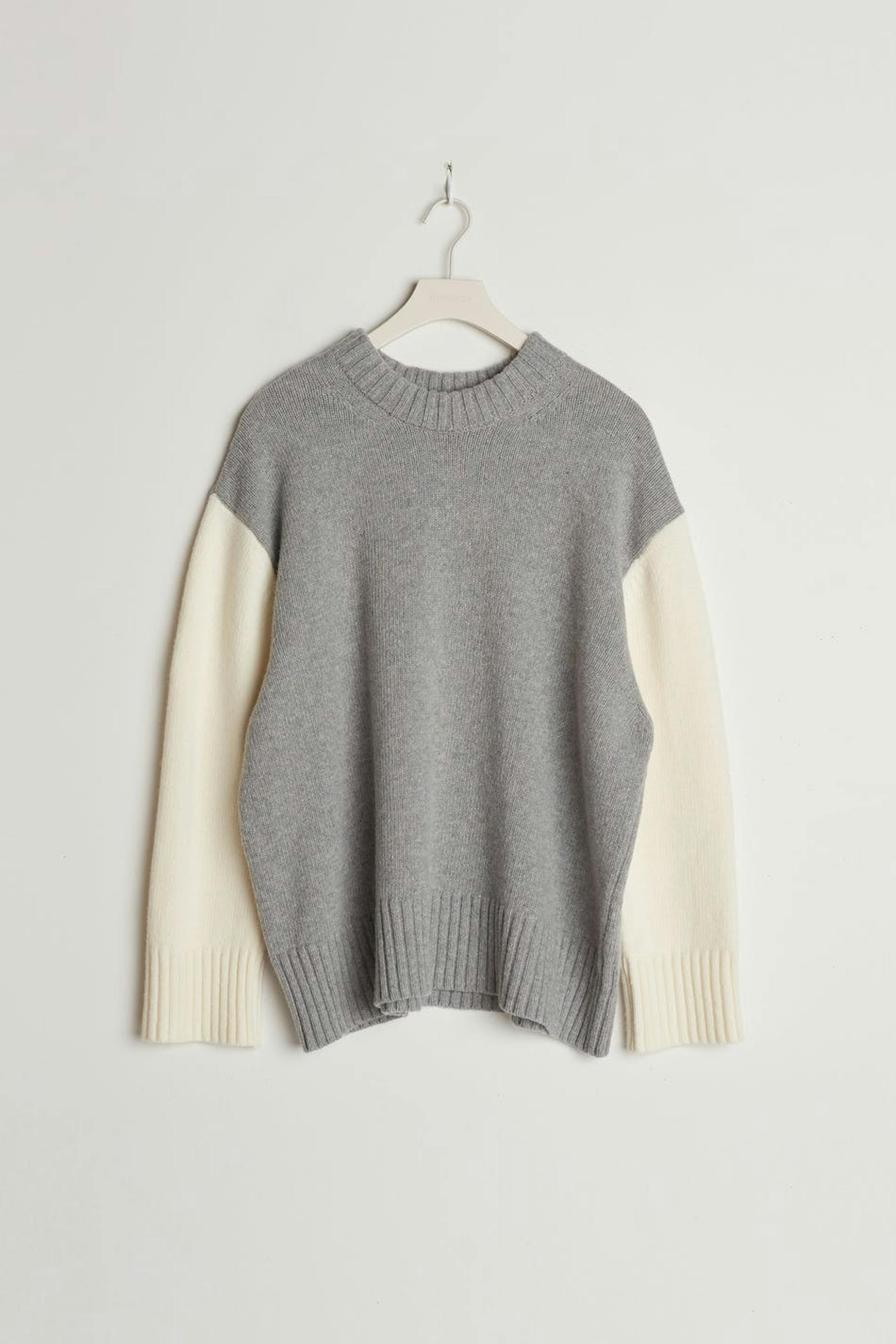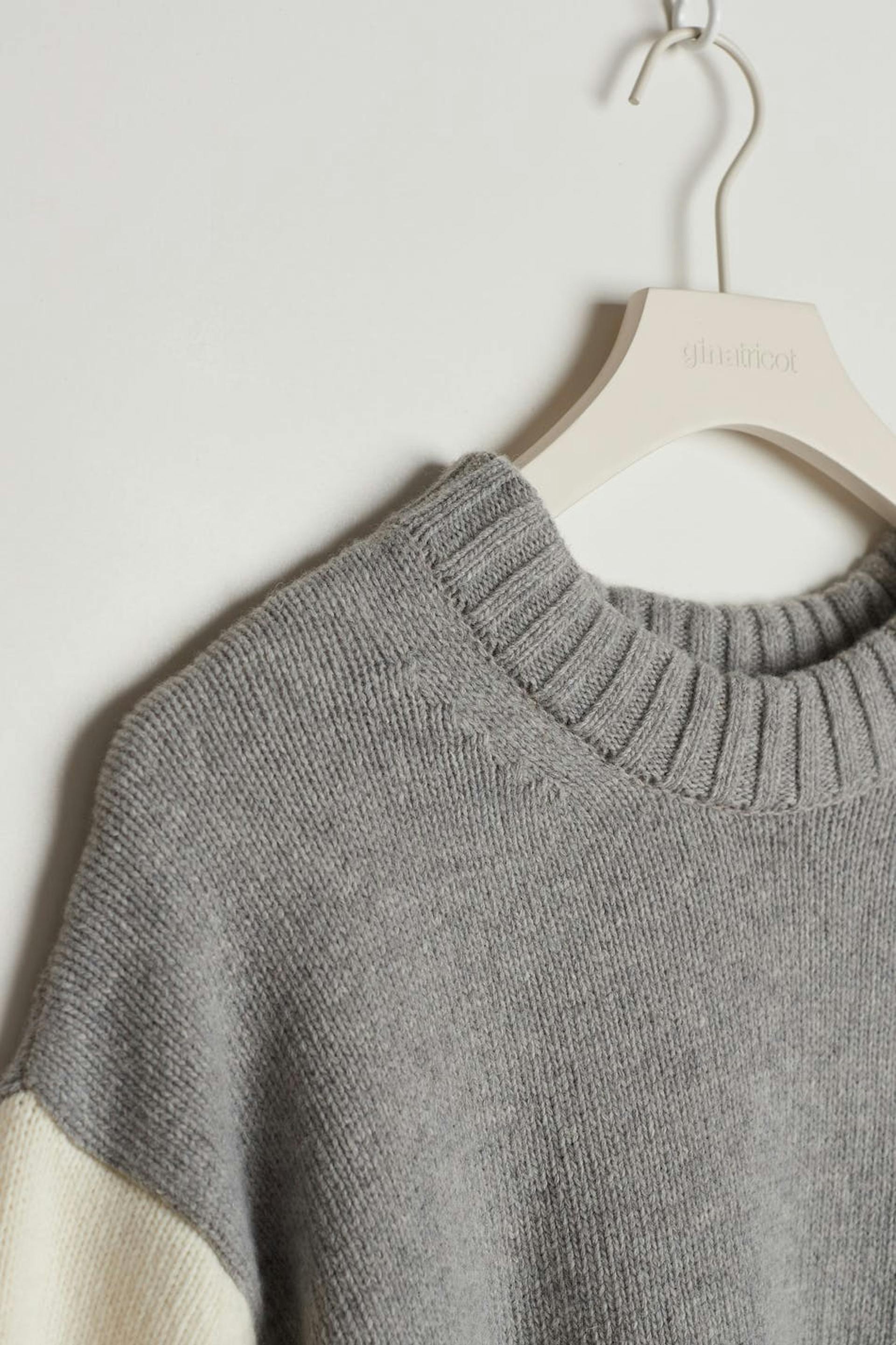 Knitted jumper by Gina Lab with a loose-fitting style. The jumper is grey, white and long-sleeved. It is made of recycled wool and has a turtleneck, a rounded neckline and a ribbed hem.