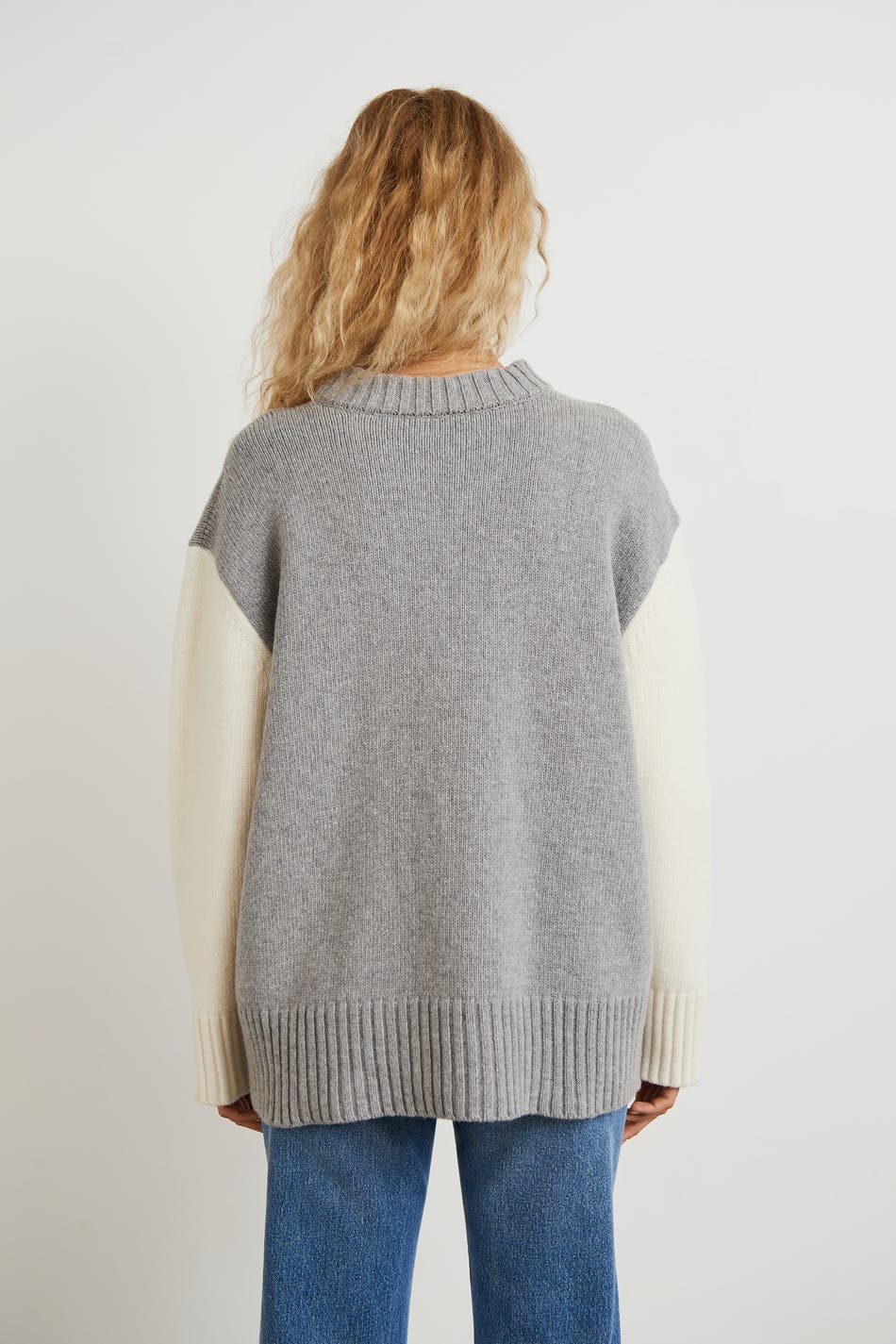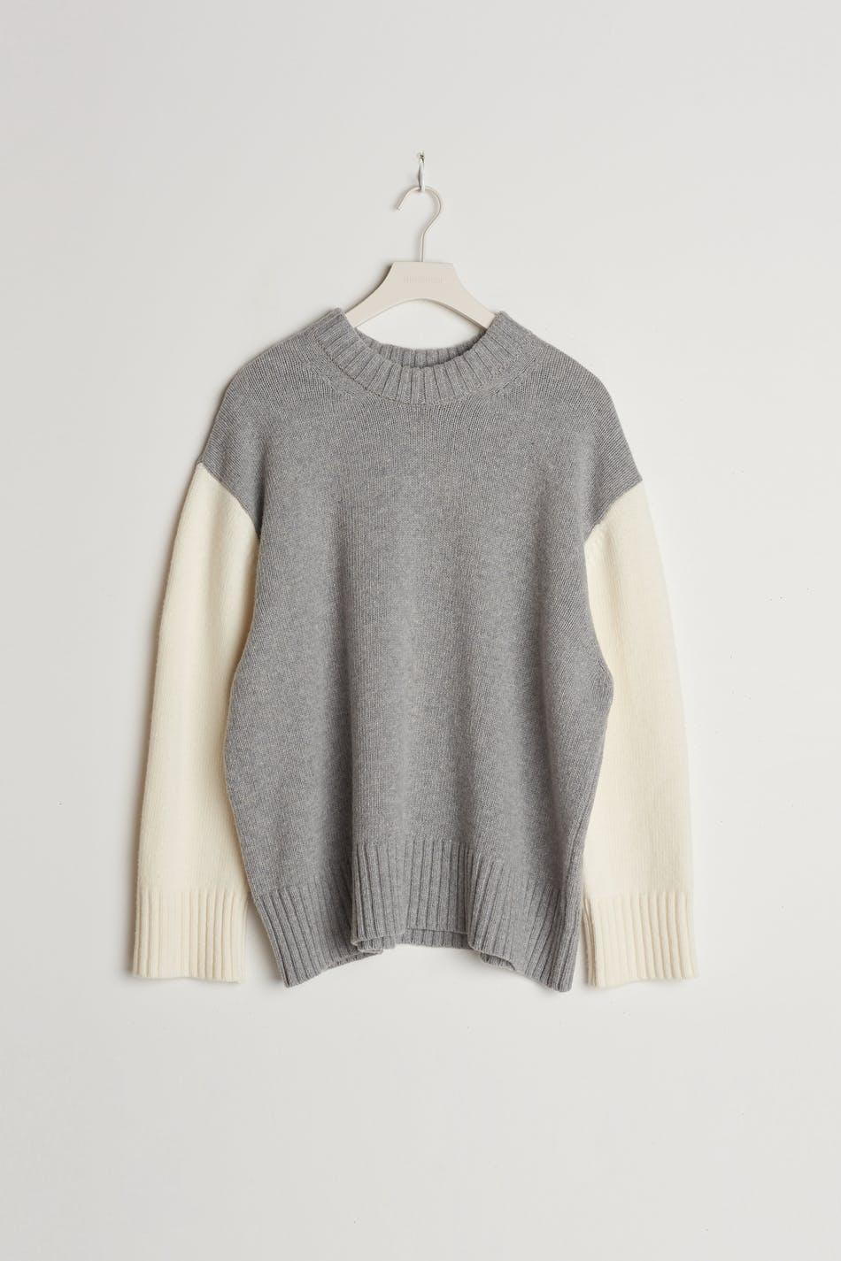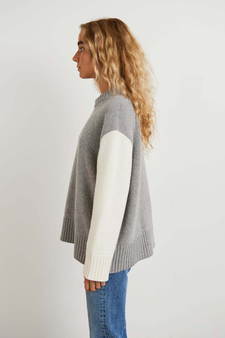 Knitted jumper by Gina Lab with a loose-fitting style. The jumper is grey, white and long-sleeved. It is made of recycled wool and has a turtleneck, a rounded neckline and a ribbed hem.