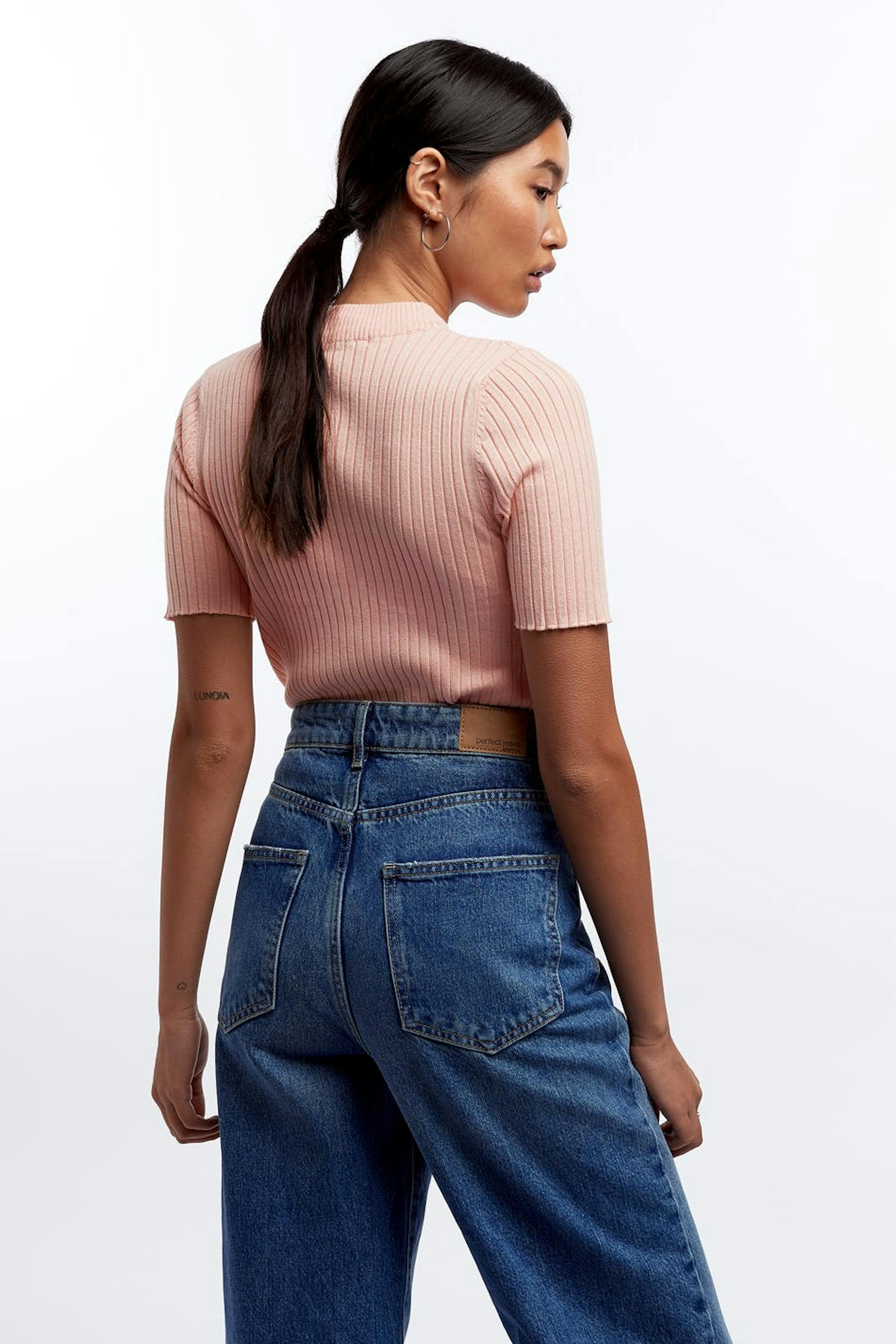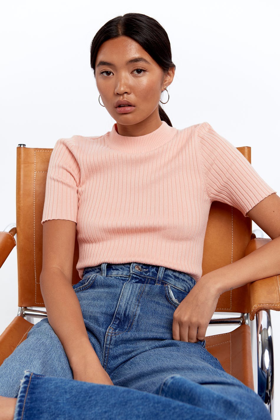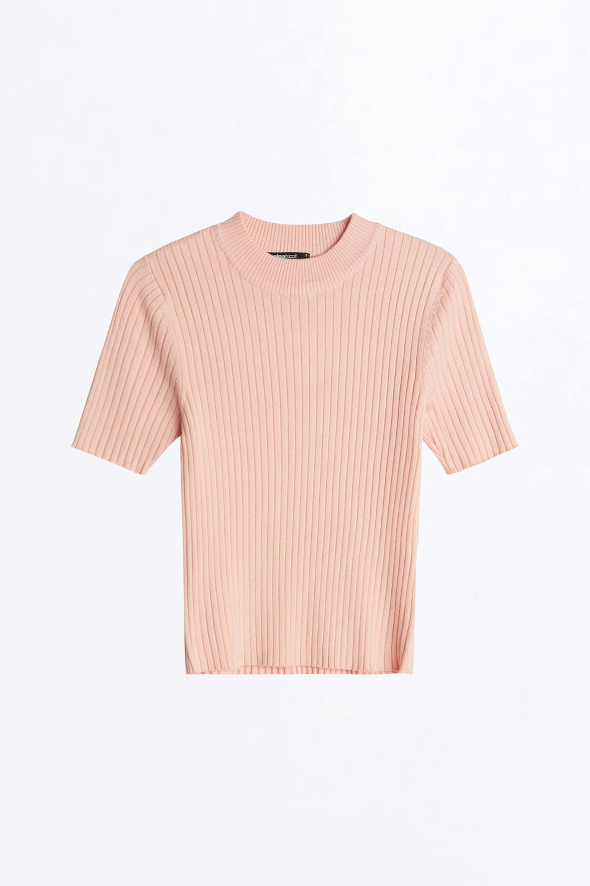 Fine-knitted top with a ribbed cuff on the neckline. The top is orange, ribbed and short-sleeved.