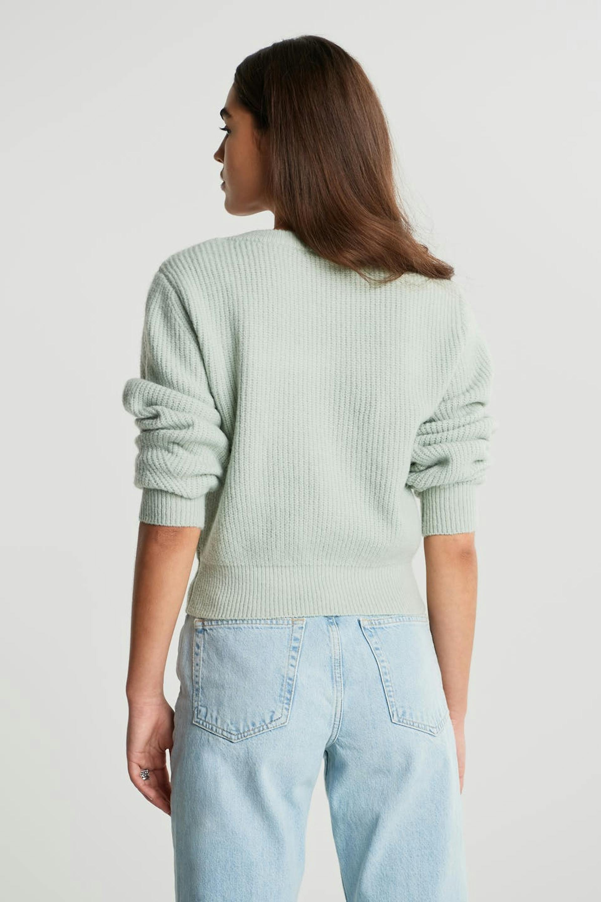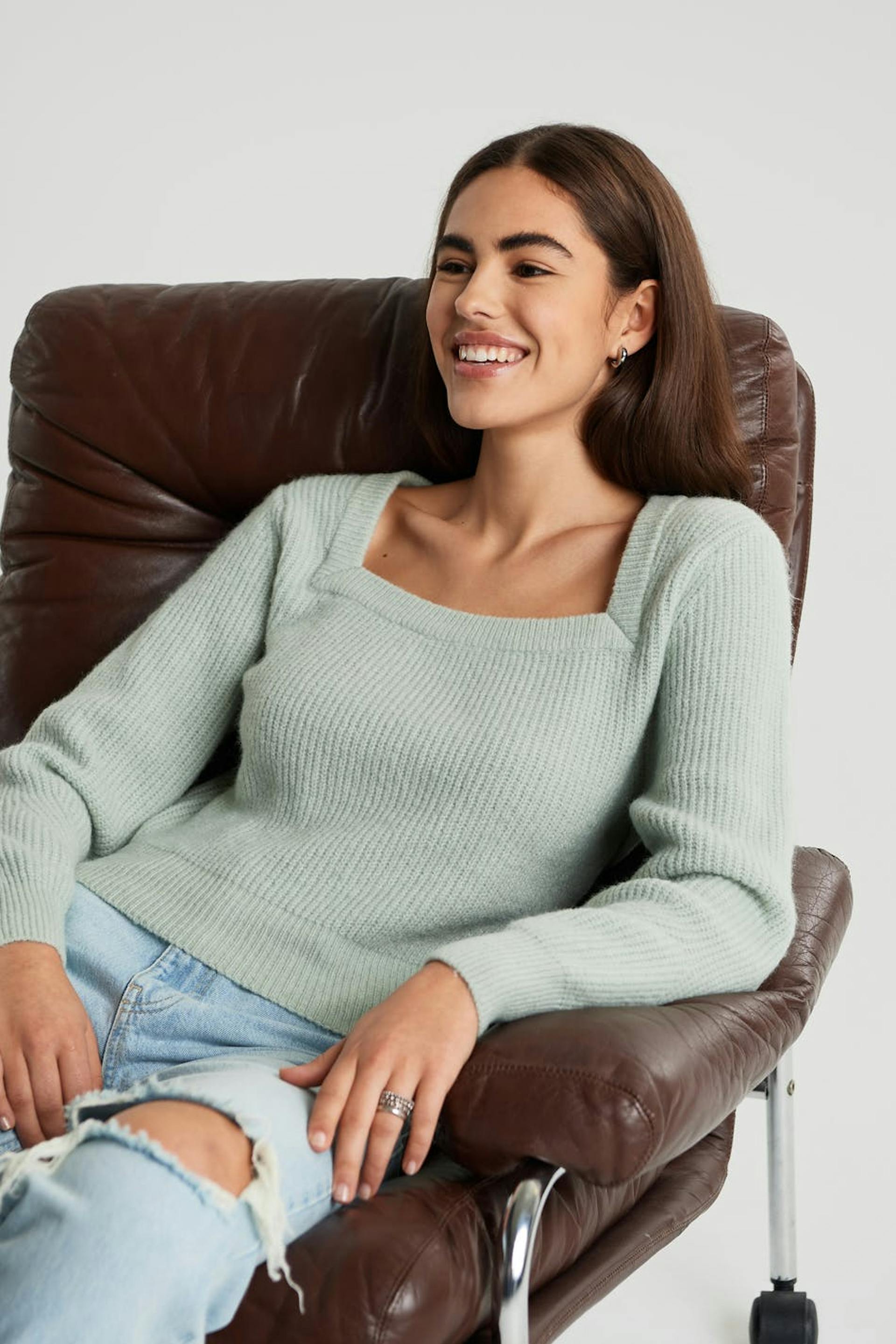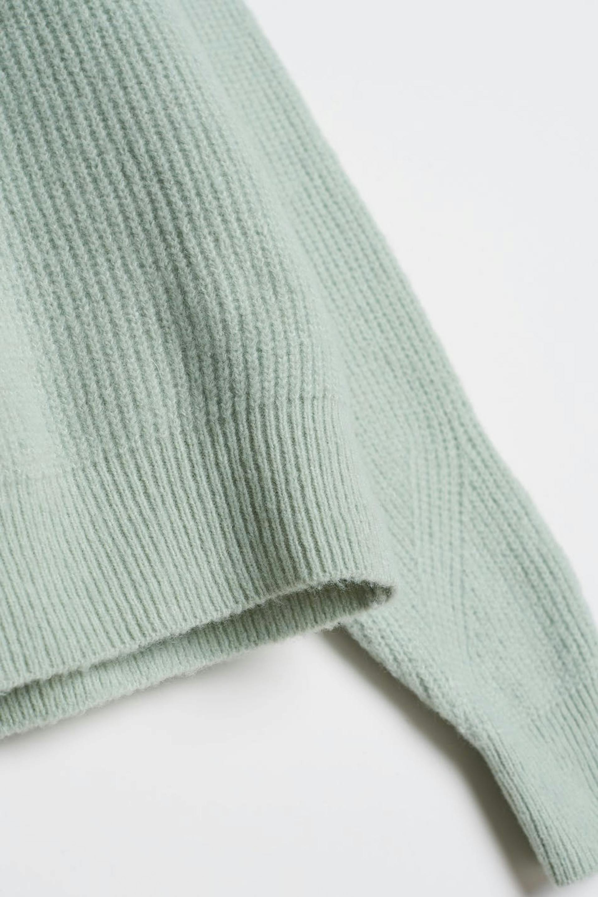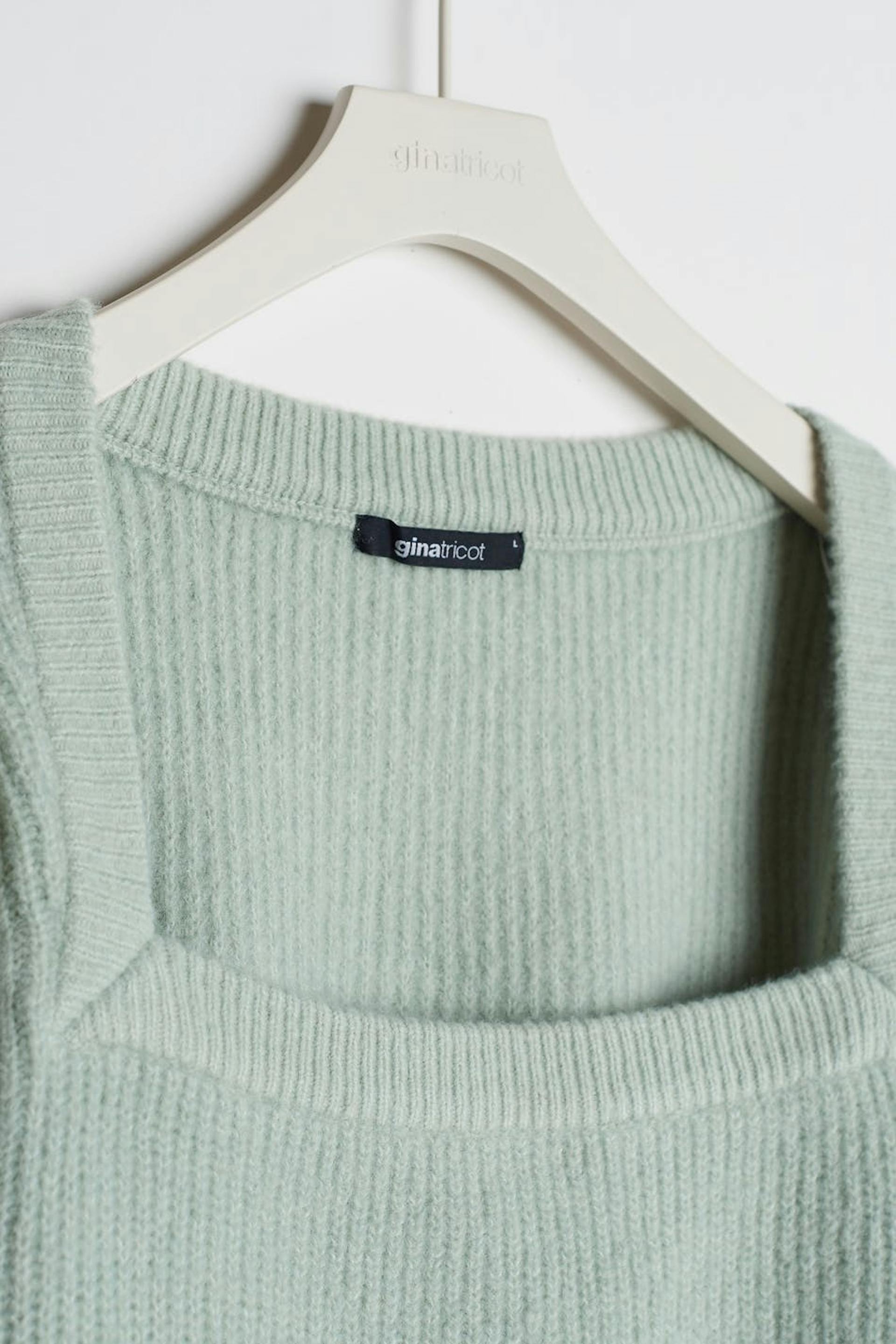 Knitted jumper with a square neckline. The jumper is green and has a short, boxy, loose fit.